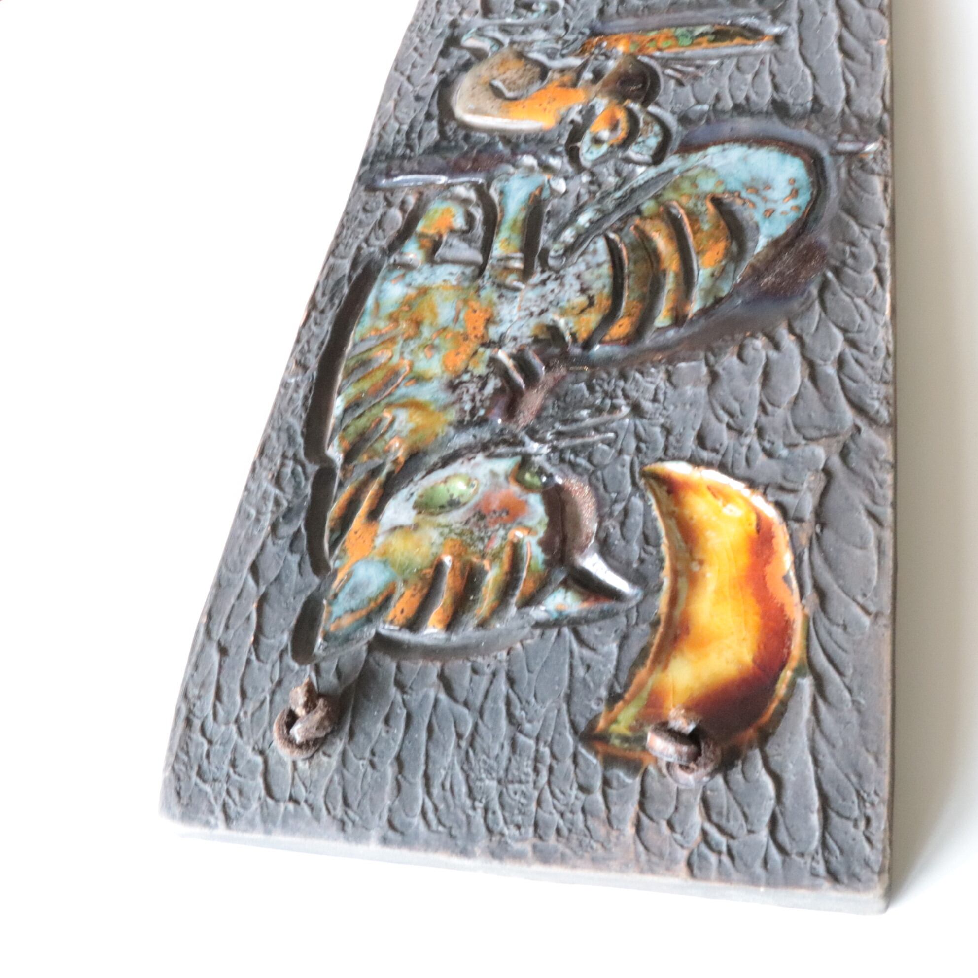 陶板は素朴な土色の素地に、果物や植物、動物などをモチーフにした色鮮やかな釉薬装飾が施されており、素焼きの質感と艶やかな釉薬のコントラストが美しいのが特徴です。バランスよく構成されたデザインは、壁に掛けるだけで空間に温かみとアート性を添えてくれる、一点一点が手作業で仕上げられたオリジナリティの高いアートピースです。