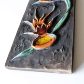 陶板は素朴な土色の素地に、果物や植物、動物などをモチーフにした色鮮やかな釉薬装飾が施されており、素焼きの質感と艶やかな釉薬のコントラストが美しいのが特徴です。バランスよく構成されたデザインは、壁に掛けるだけで空間に温かみとアート性を添えてくれる、一点一点が手作業で仕上げられたオリジナリティの高いアートピースです。
