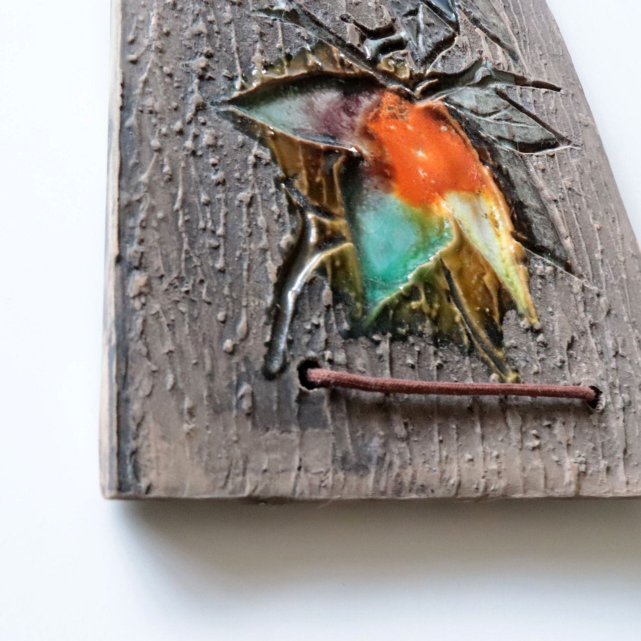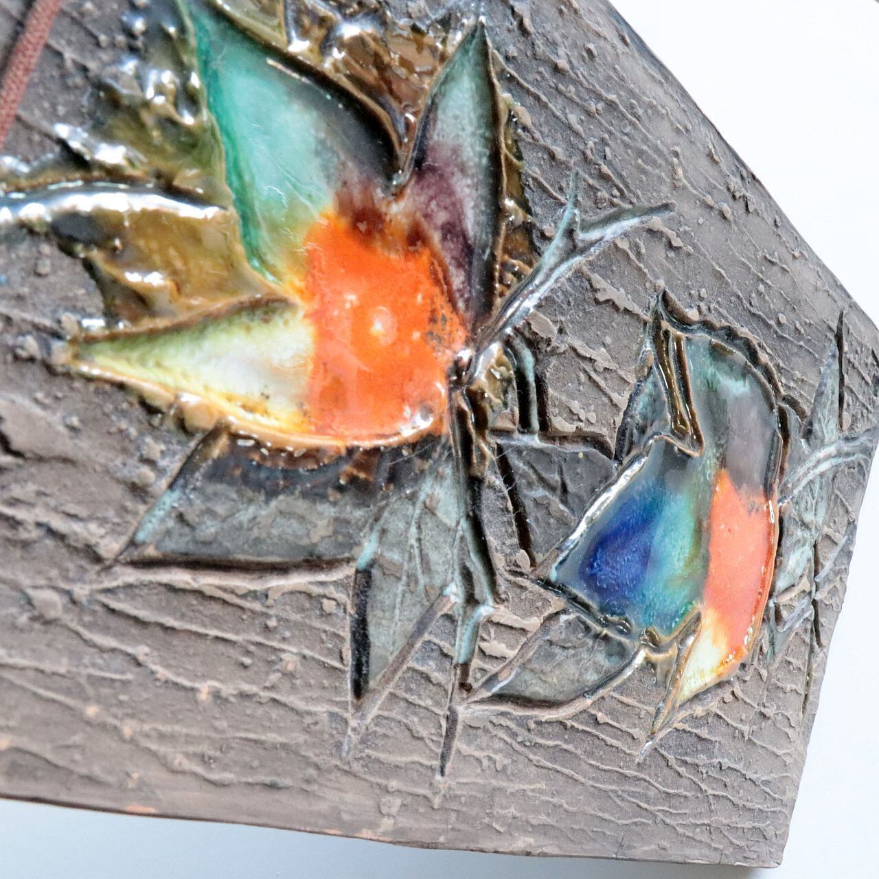陶板は素朴な土色の素地に、果物や植物、動物などをモチーフにした色鮮やかな釉薬装飾が施されており、素焼きの質感と艶やかな釉薬のコントラストが美しいのが特徴です。バランスよく構成されたデザインは、壁に掛けるだけで空間に温かみとアート性を添えてくれる、一点一点が手作業で仕上げられたオリジナリティの高いアートピースです。