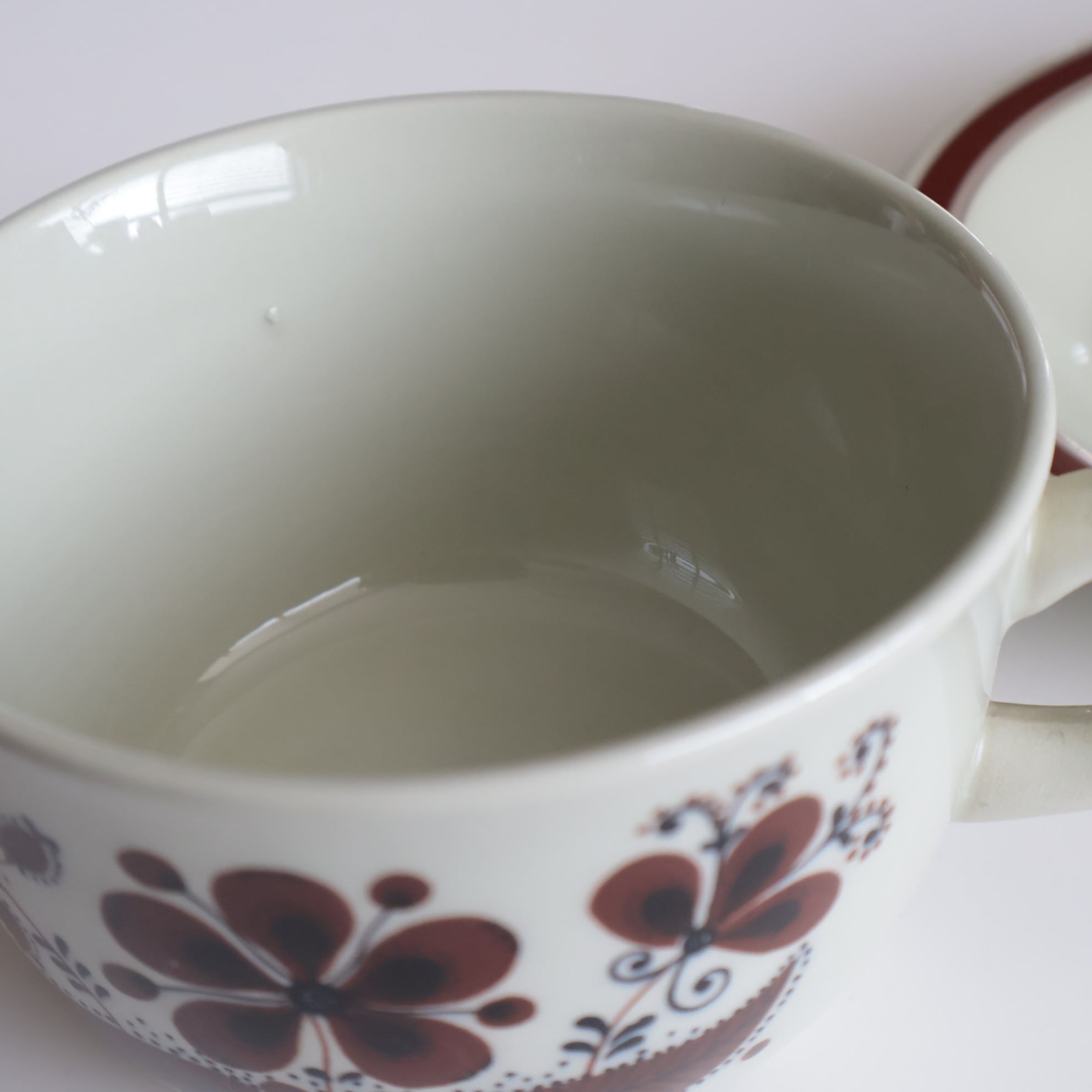 ほんの少しブラウンがかった地に茶色と黒でレトロで意匠的な花が全面に描かれています。単色ながらも豊かな表情で、同時代のFiggjoらしいレトロで味わいあるシリーズです。他の器とも馴染みやすく、空間にやさしい彩りを添えてくれる存在です。