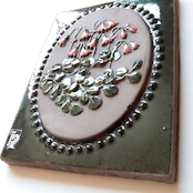 同社陶板の特徴として、製造時にコテやヘラによる成型時の凹凸、焼成時の釉薬抜け・色とび、また製造後の小さな欠けなどが比較的おきやすいアイテムとなります。また同じモチーフの製品でも製造時の個体差により若干のサイズ差が見られる工房となります。
