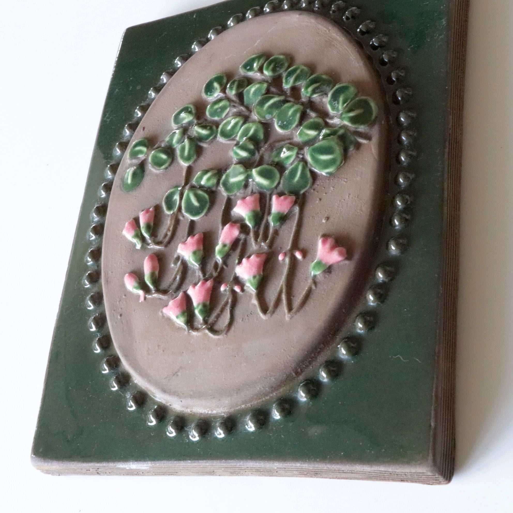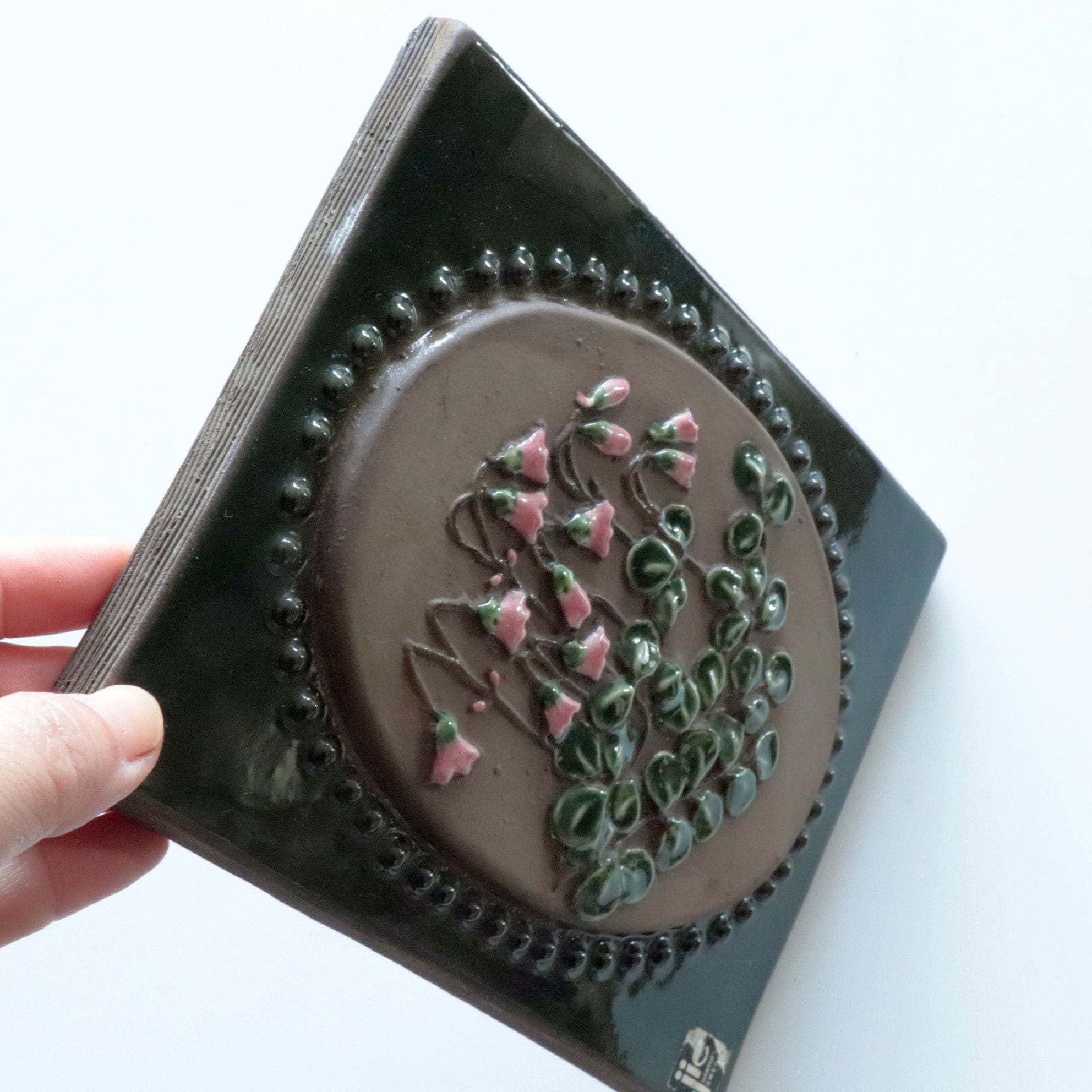 同社の代表的デザイナーAimo Nietosvuori による作品で、花を中心に陶板全面に花が描かれています。背面には通し穴と針金が付いていますので、そのまま壁に飾ることも可能です。