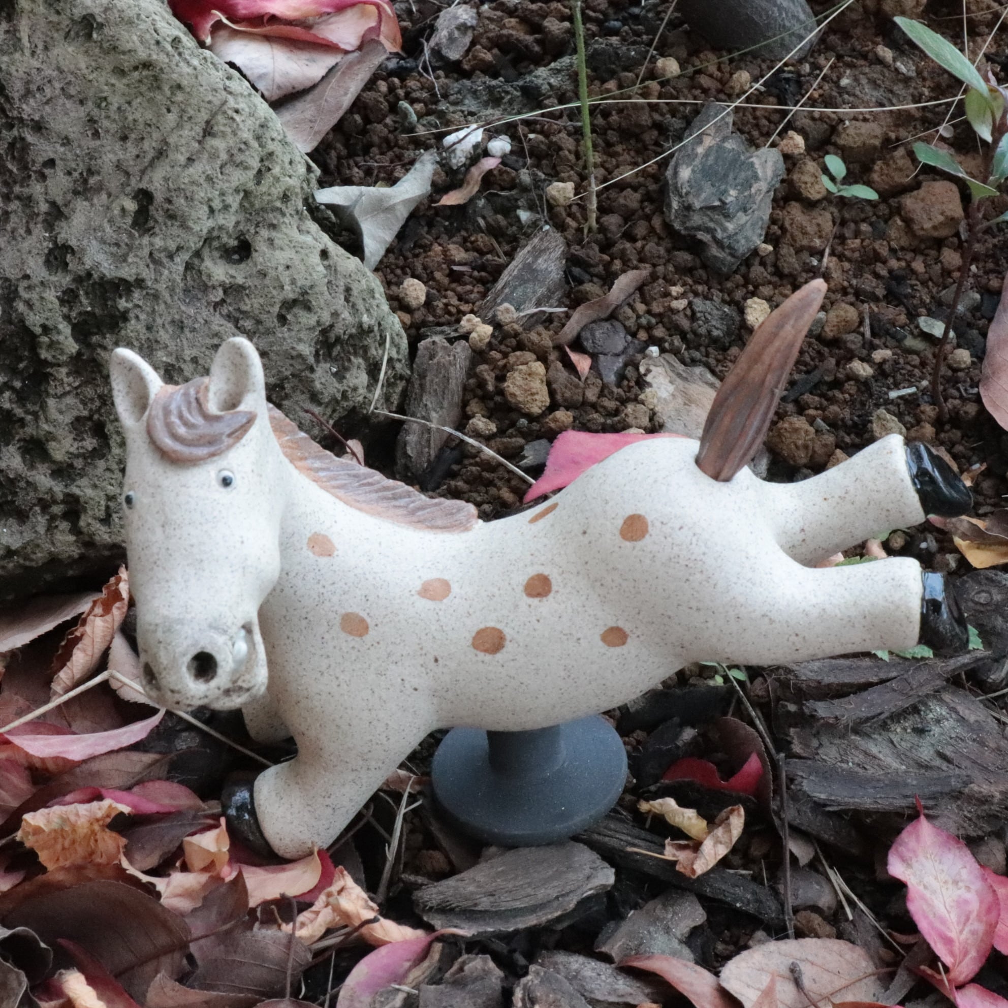 2026年の干支に合わせ製作された「うま」。癖のある表情に髪型、短足の安定感のあるフォルムと山本さんらしい表情豊かなデザインです。尻尾は取り外しができるようになっており、植物(ドライフラワー)などを挿していただくことも可能です。