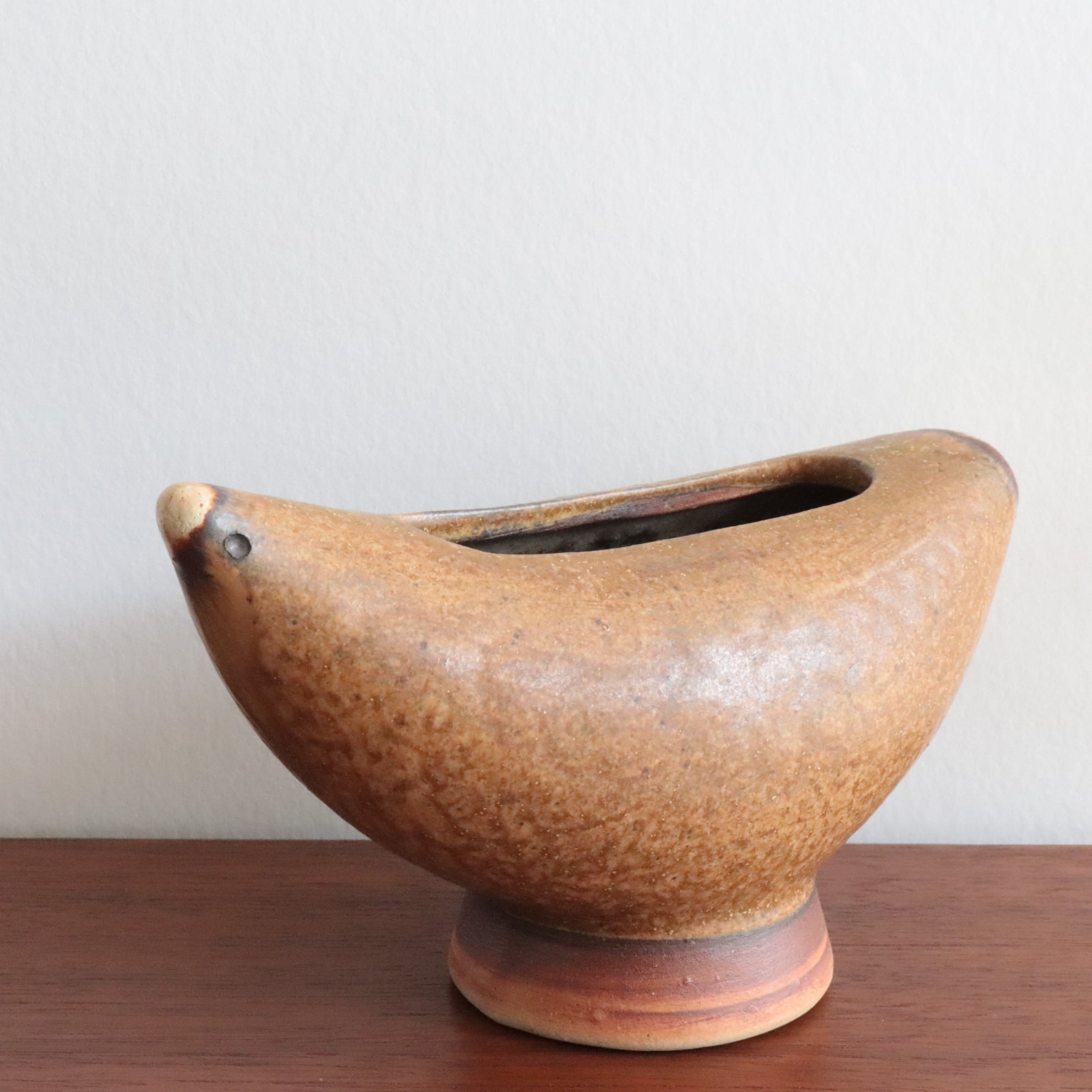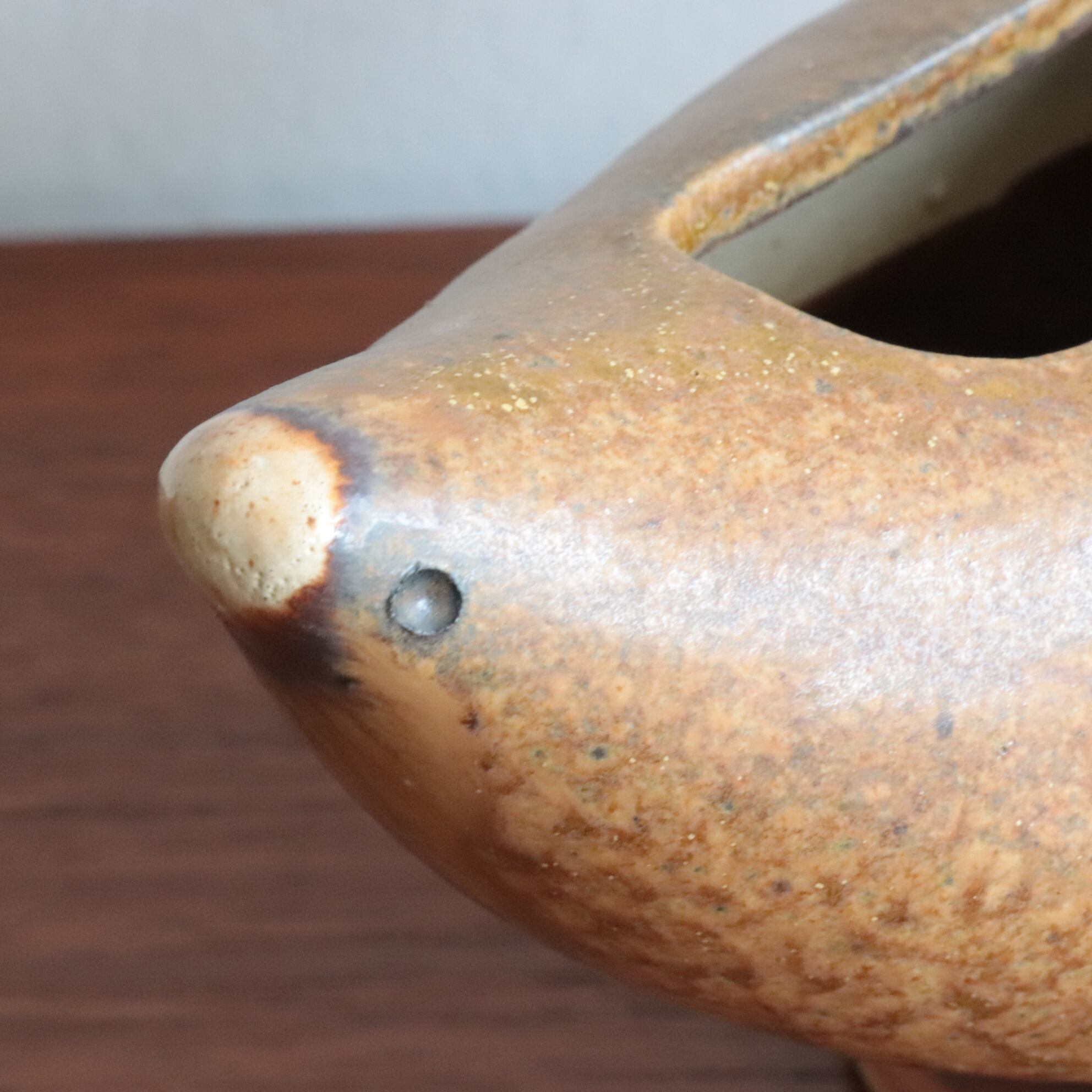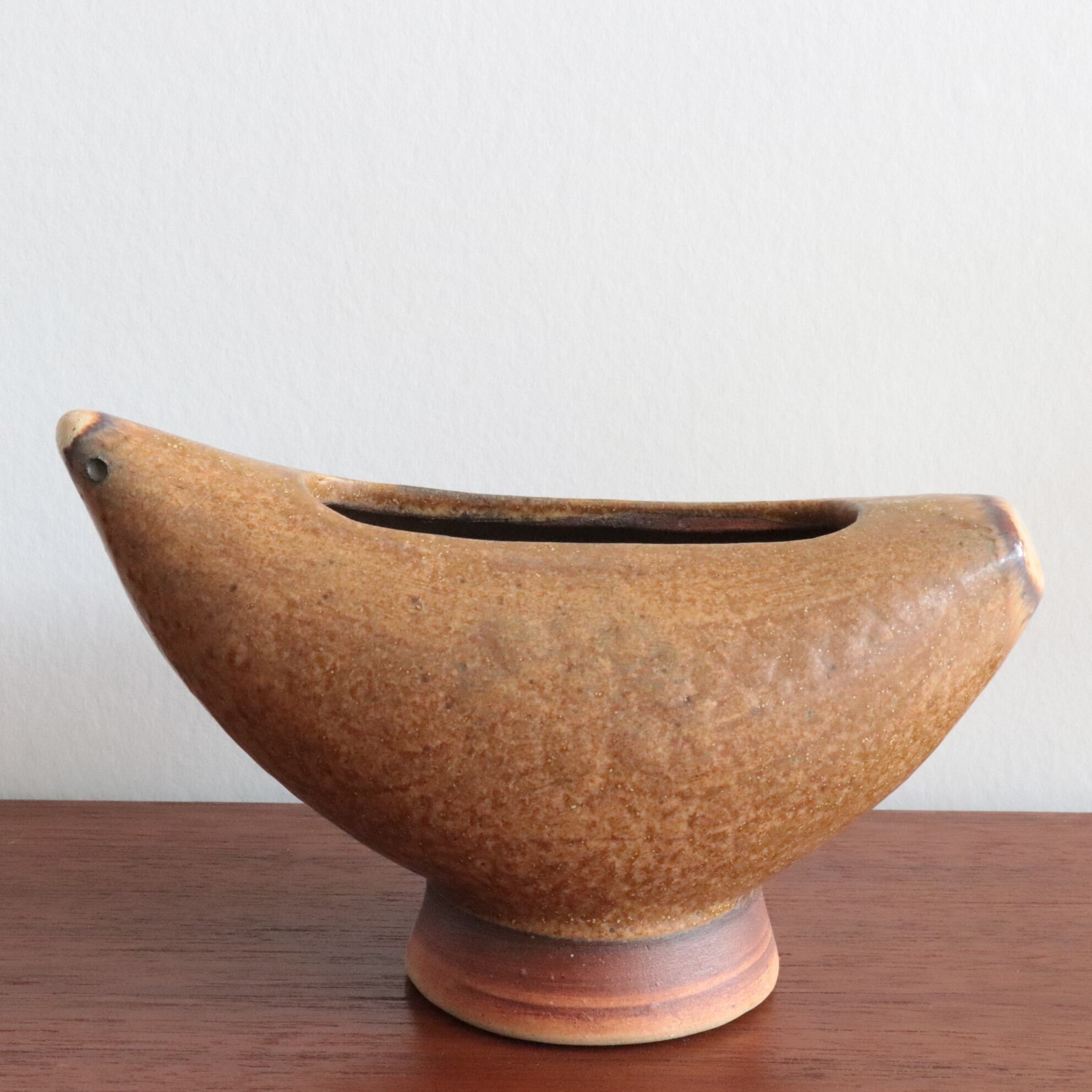 鳥のかたちをした陶器のボウル/ベース。 丸みのあるフォルムと素朴な釉薬が、どこか親しみやすく、見る人の心を和ませます。 オブジェとしても、花器や小物入れとしても楽しめる、暮らしにやさしく寄り添う一点です。