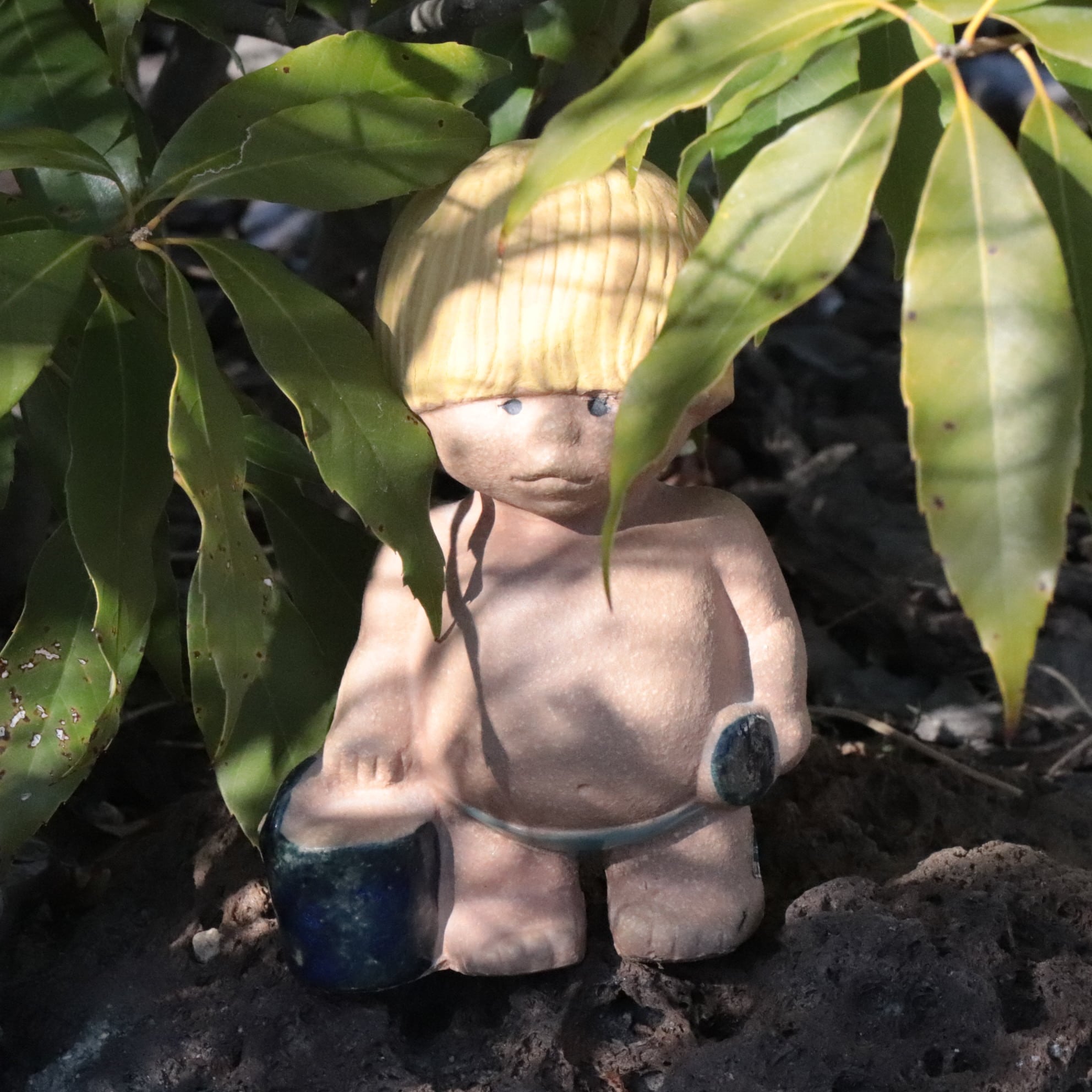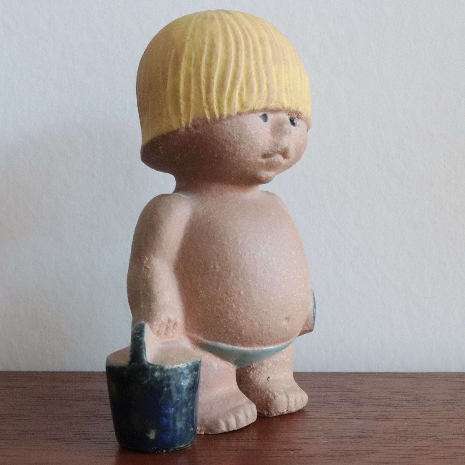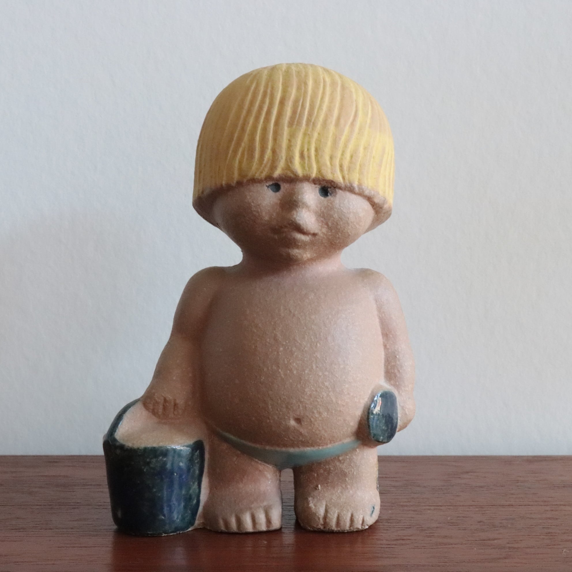 それぞれ伝統的な服装をしており、その地域らしい生活の様子を切り取ったリサ・ラーソン作品の中でも高い人気を誇ったシリーズとなります。西のこどもは泥遊びの最中でしょうか、バケツとスコップを持ったやんちゃな男の子が描かれています。