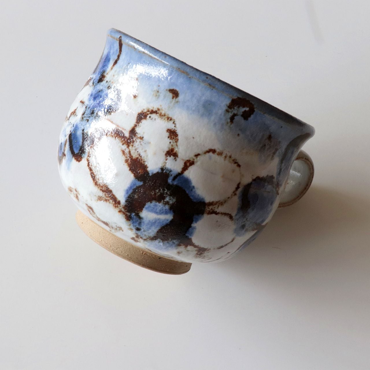 手描きの青と茶を基調にした抽象的な花模様が印象的で、どこか民族的な雰囲気も感じさせるデザインです。ぽってりとした厚みのあるフォルムと、釉薬の濃淡が生み出す表情が魅力的で、手に取るたびに異なる景色を楽しめます。ソーサーの縁には柔らかな立ち上がりがあり、カップとのバランスも美しく、実用性と装飾性を兼ね備えた一品です。