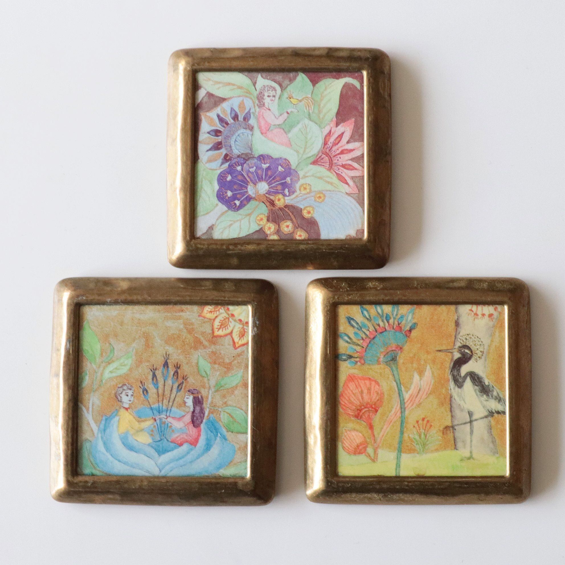 中央には、手描き風の花模様があしらわれた陶板が嵌め込まれており、周囲を囲む真鍮のフレームがクラシカルな雰囲気を引き立てています。花の表情や色使いにはどこか素朴な愛らしさがあり、実用品でありながら小さなアートピースのような存在感を放ちます。