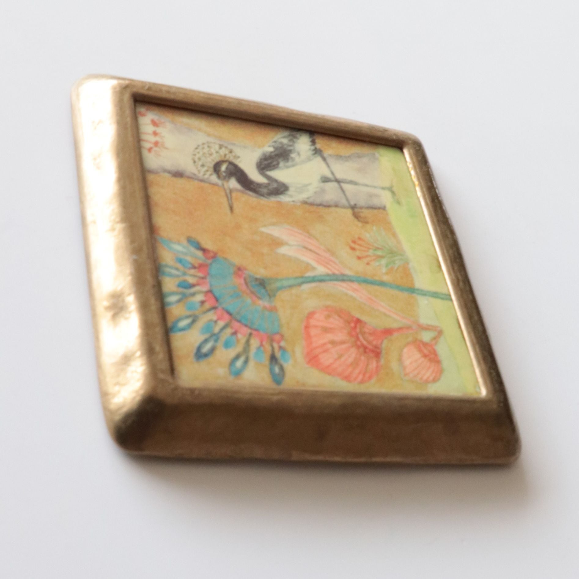 中央には、手描き風の花模様があしらわれた陶板が嵌め込まれており、周囲を囲む真鍮のフレームがクラシカルな雰囲気を引き立てています。花の表情や色使いにはどこか素朴な愛らしさがあり、実用品でありながら小さなアートピースのような存在感を放ちます。