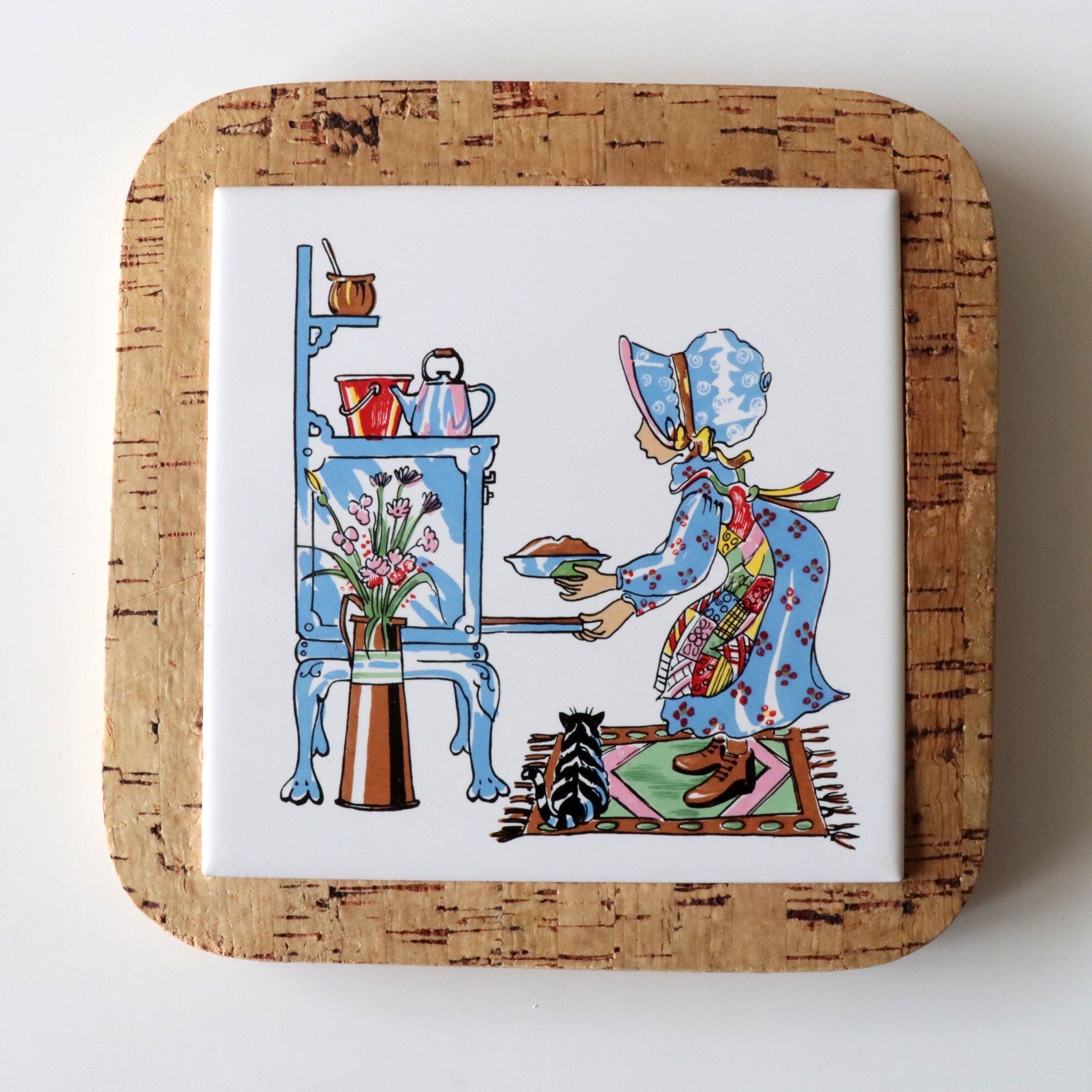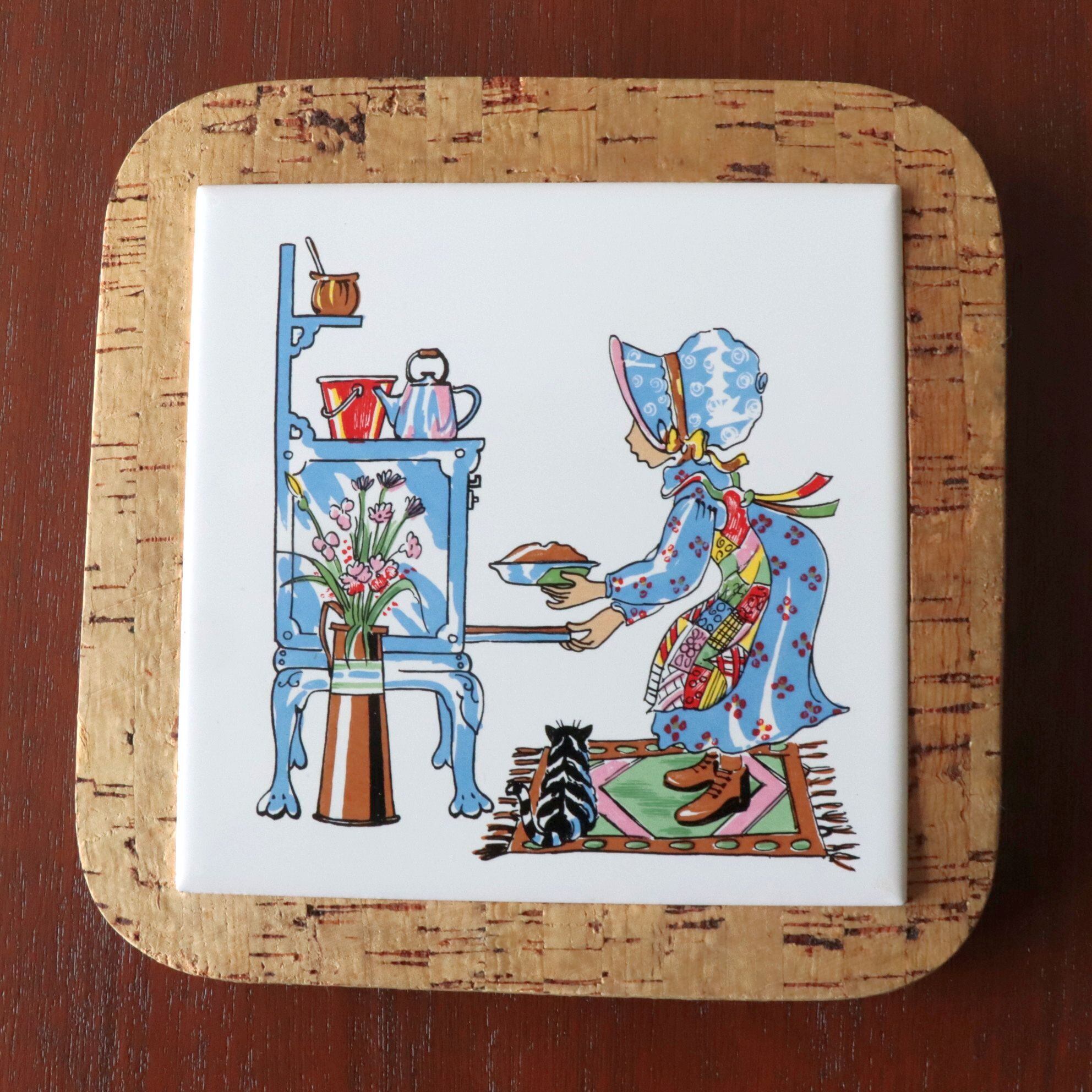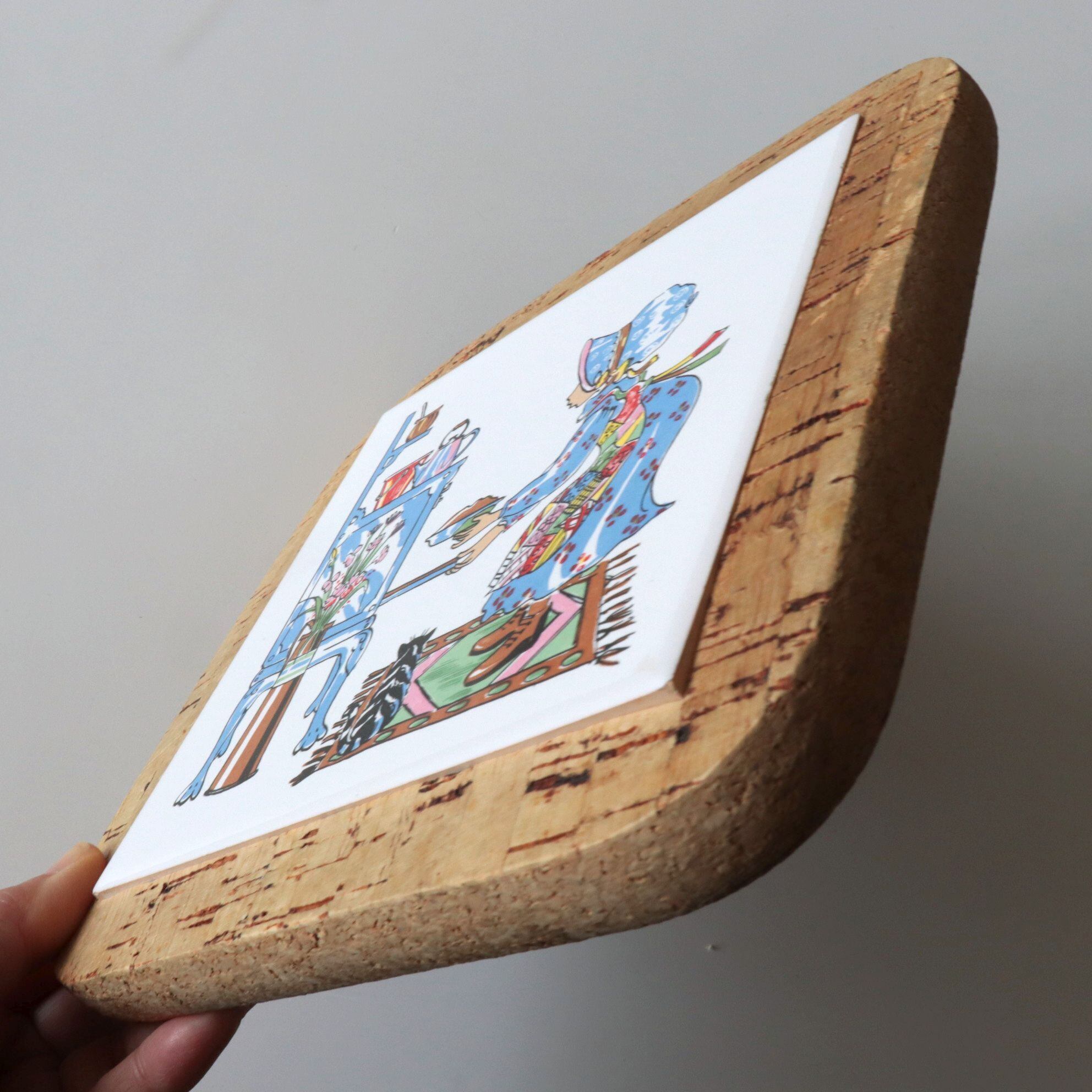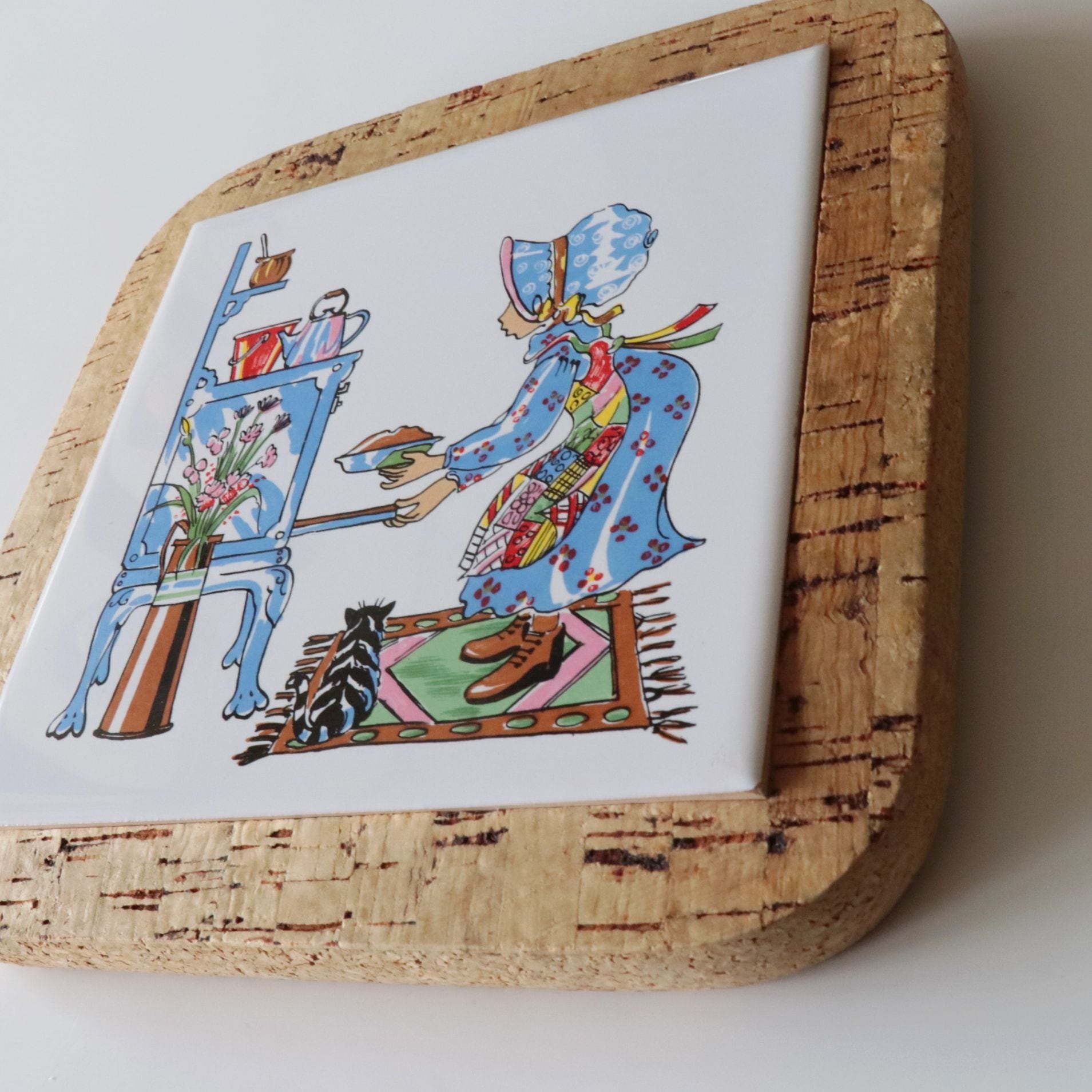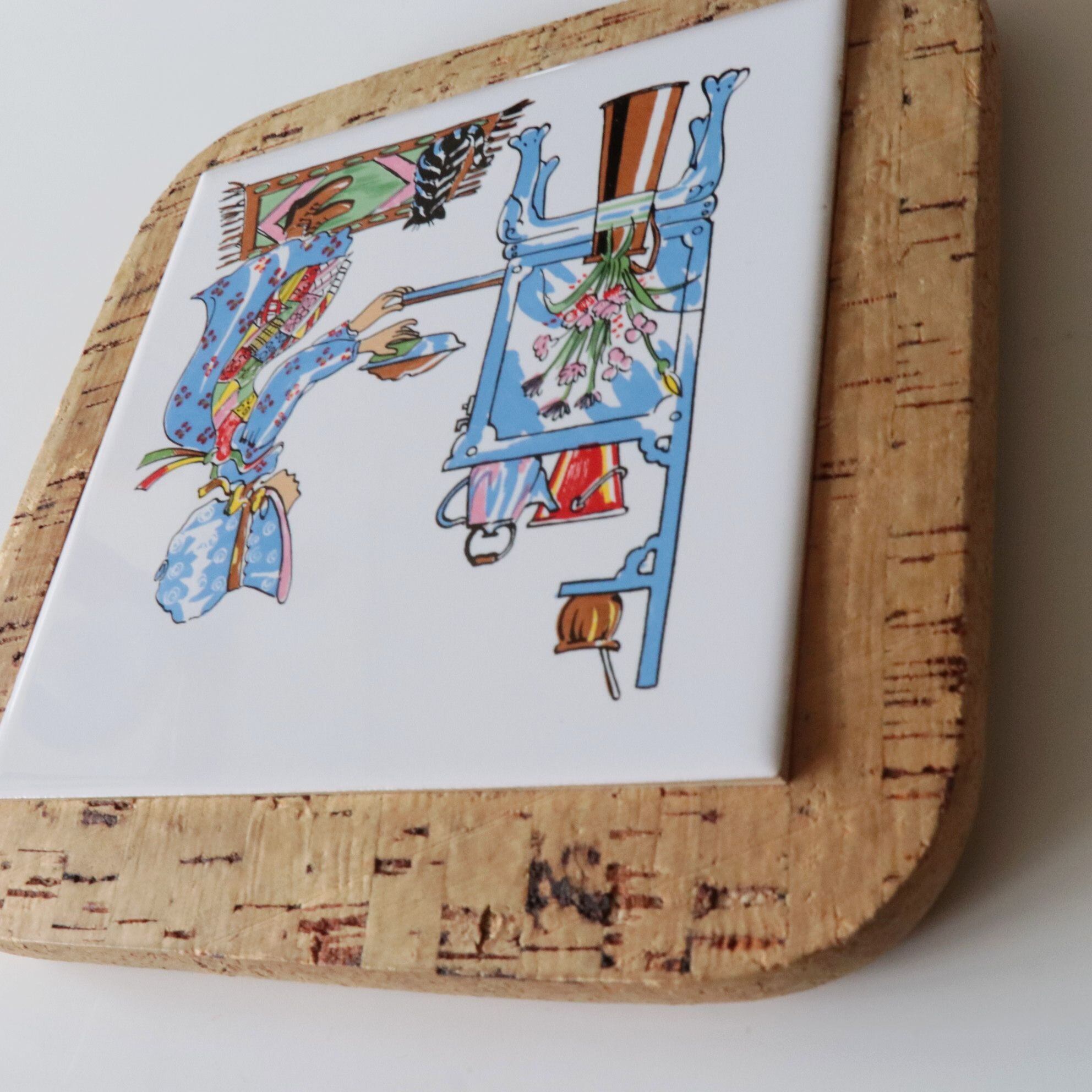 明るい色味の陶土に釉薬を施し、キッチンで料理をする少女と、その足元に寄り添う猫が描かれた牧歌的な情景の一枚。やわらかな筆致と淡い色使いが、カントリースタイルやコテージコアな空間によくなじみます。裏面にはコルクが貼られており、テーブルを傷つけにくい仕様です。