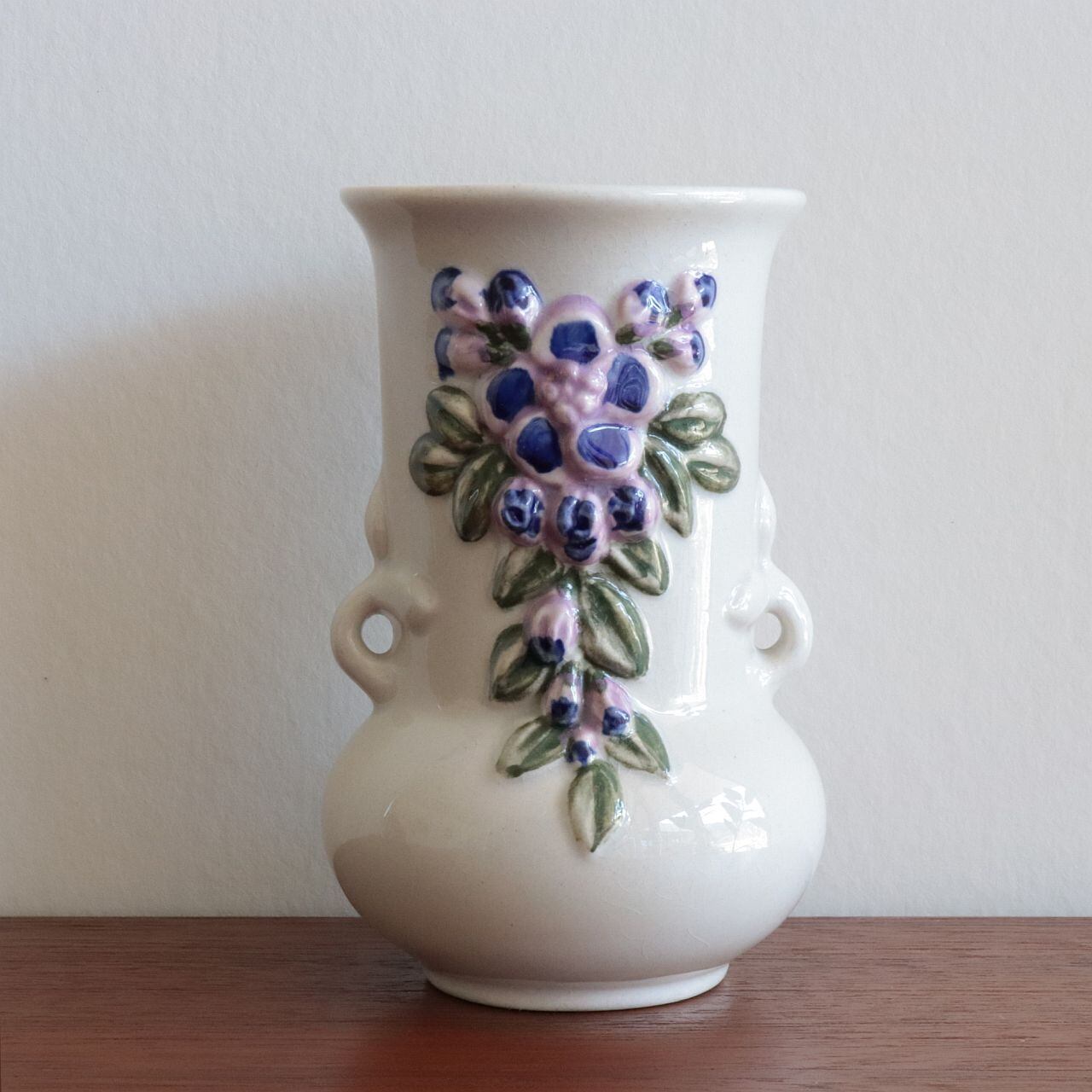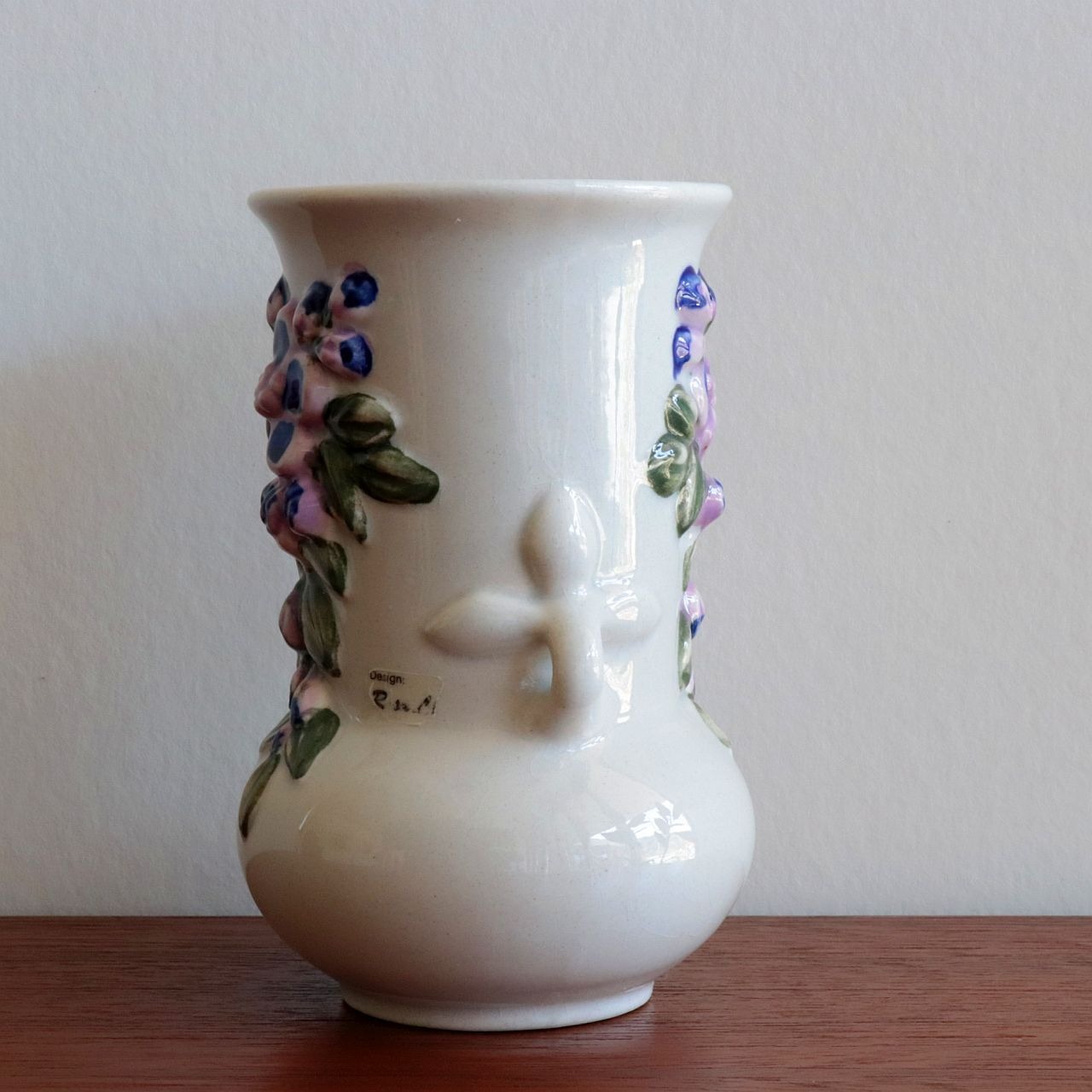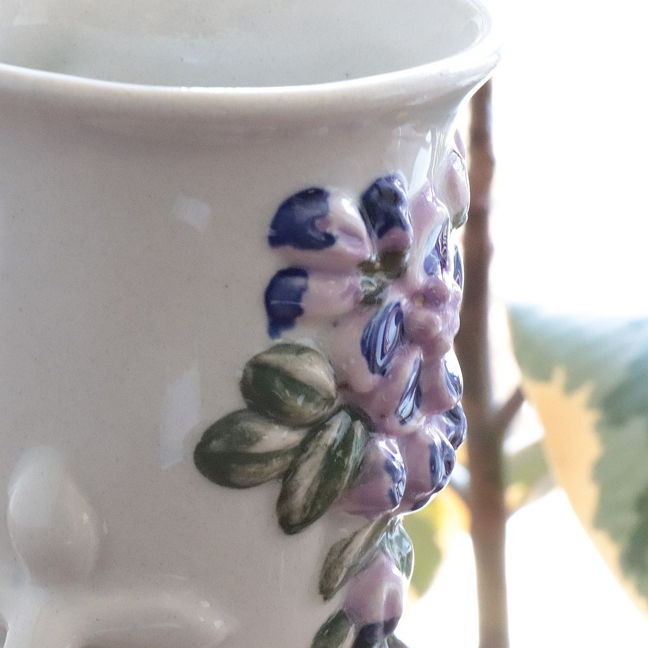 ふっくらとしたフォルムに、立体的な花のレリーフがあしらわれた愛らしいデザイン。釉薬の艶やかな質感と、素朴で温かみのある造形が調和し、空間にやさしいアクセントを添えてくれます。