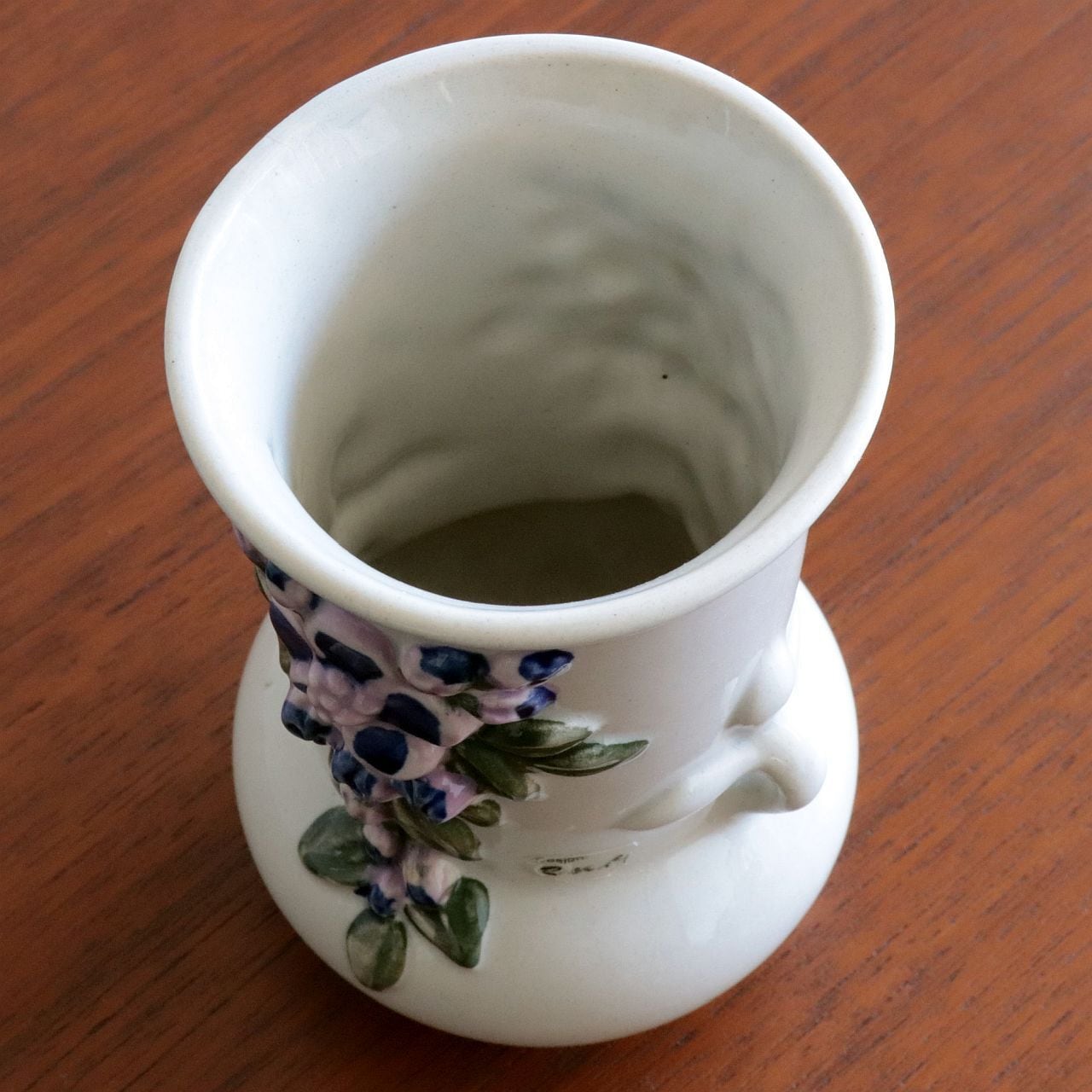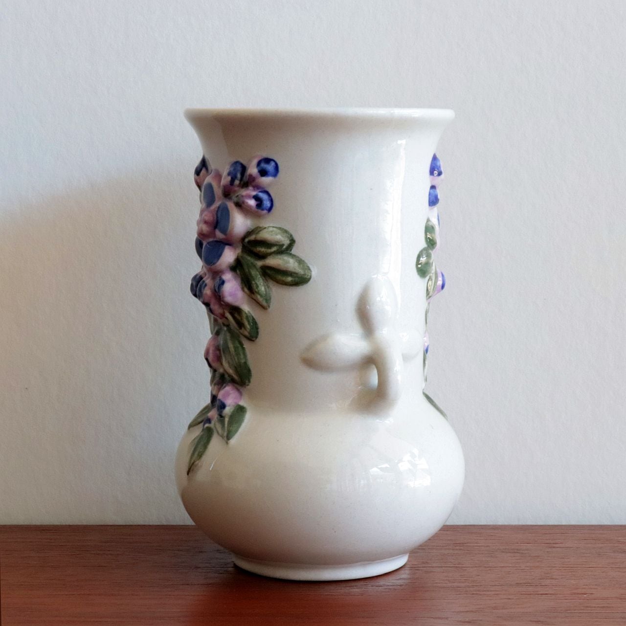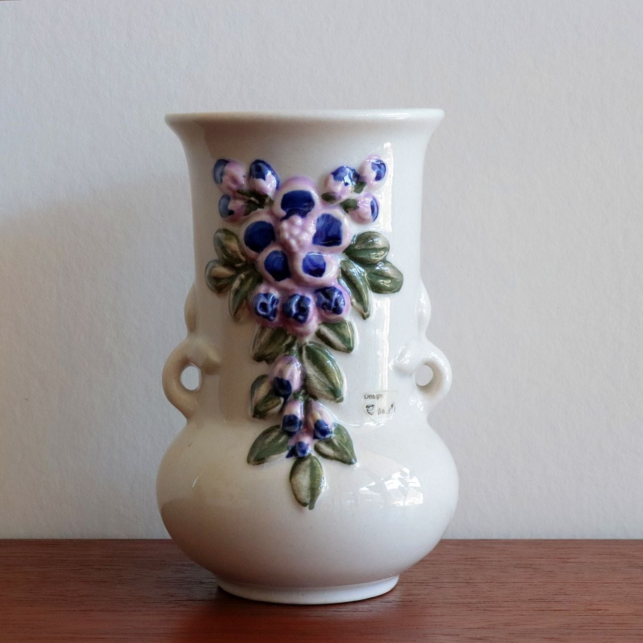 ふっくらとしたフォルムに、立体的な花のレリーフがあしらわれた愛らしいデザイン。釉薬の艶やかな質感と、素朴で温かみのある造形が調和し、空間にやさしいアクセントを添えてくれます。