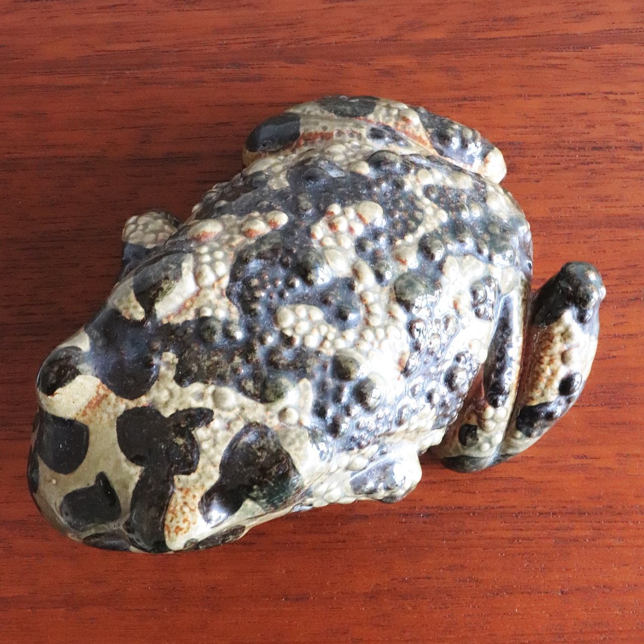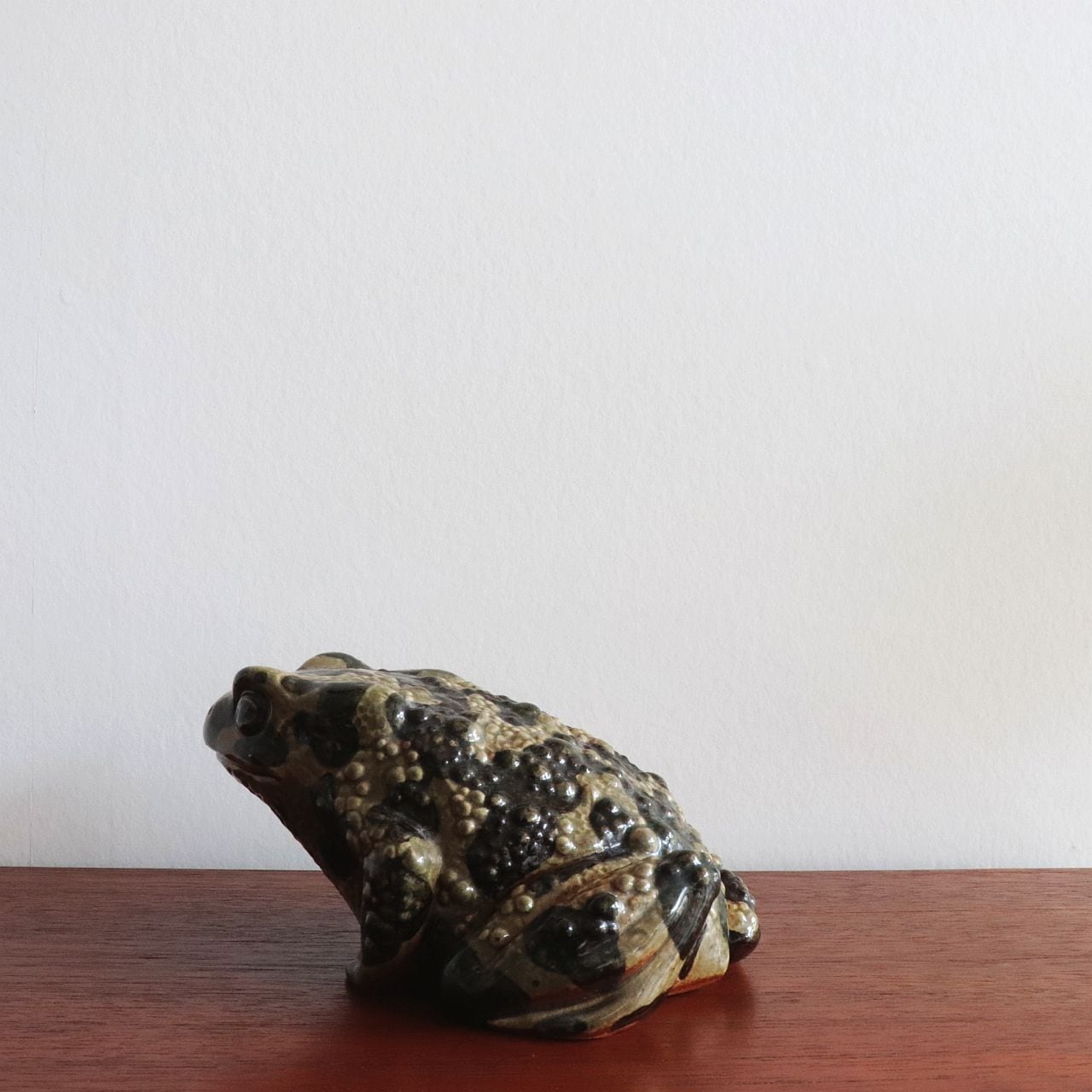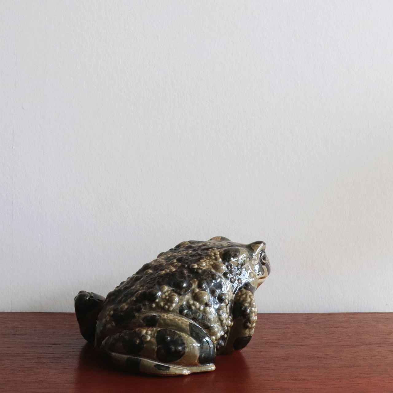 Paul Hoff は、カエル特有の丸みと湿った質感を、炻器ならではの釉薬表現で巧みに再現しています。小さく身を縮めた姿勢や、表面に施された斑点模様は、自然界の生き物としてのリアリティと、グスタフスベリらしい温かみを両立させています。シリーズの中でもユニークな存在で、コレクターからの人気も高いモデルです。
