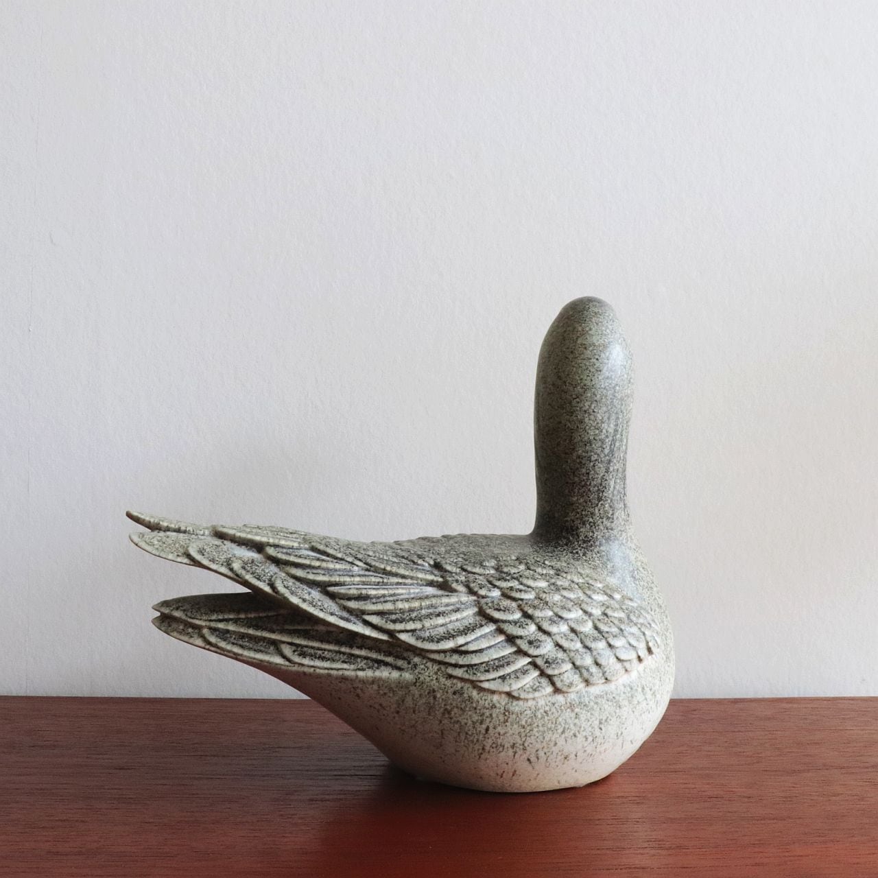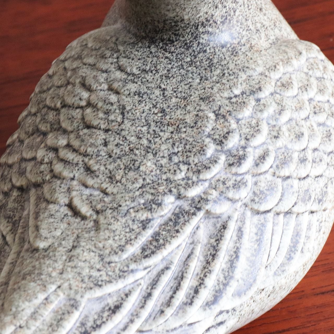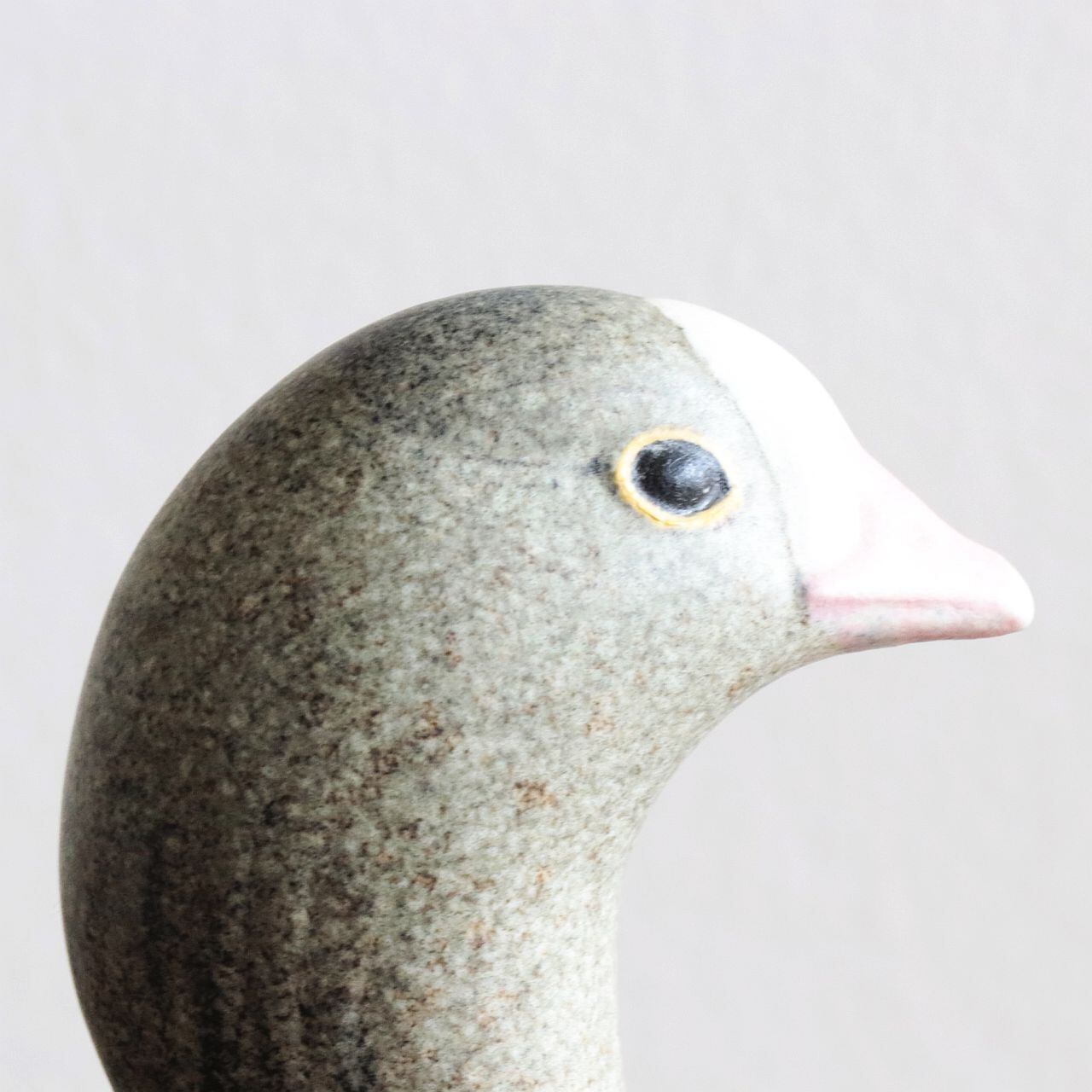 Paul Hoff は、この渡り鳥の慎ましくも凛とした佇まいを、丸みを帯びたフォルムと落ち着いた釉薬の色調で表現しています。胸を張り、静かに前を見つめる姿は、長い旅路を生き抜く鳥の強さと繊細さを同時に感じさせます。羽の重なりを思わせる細かな凹凸や、柔らかなラインの処理は、彼の動物造形の特徴がよく表れた仕上がりです。