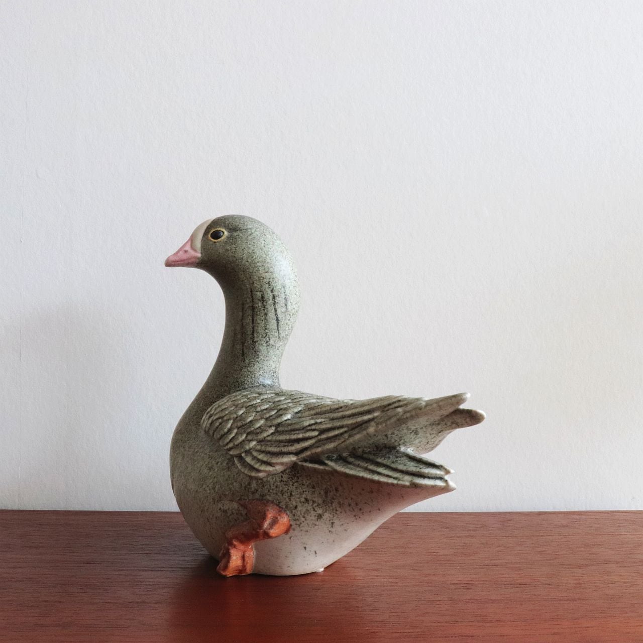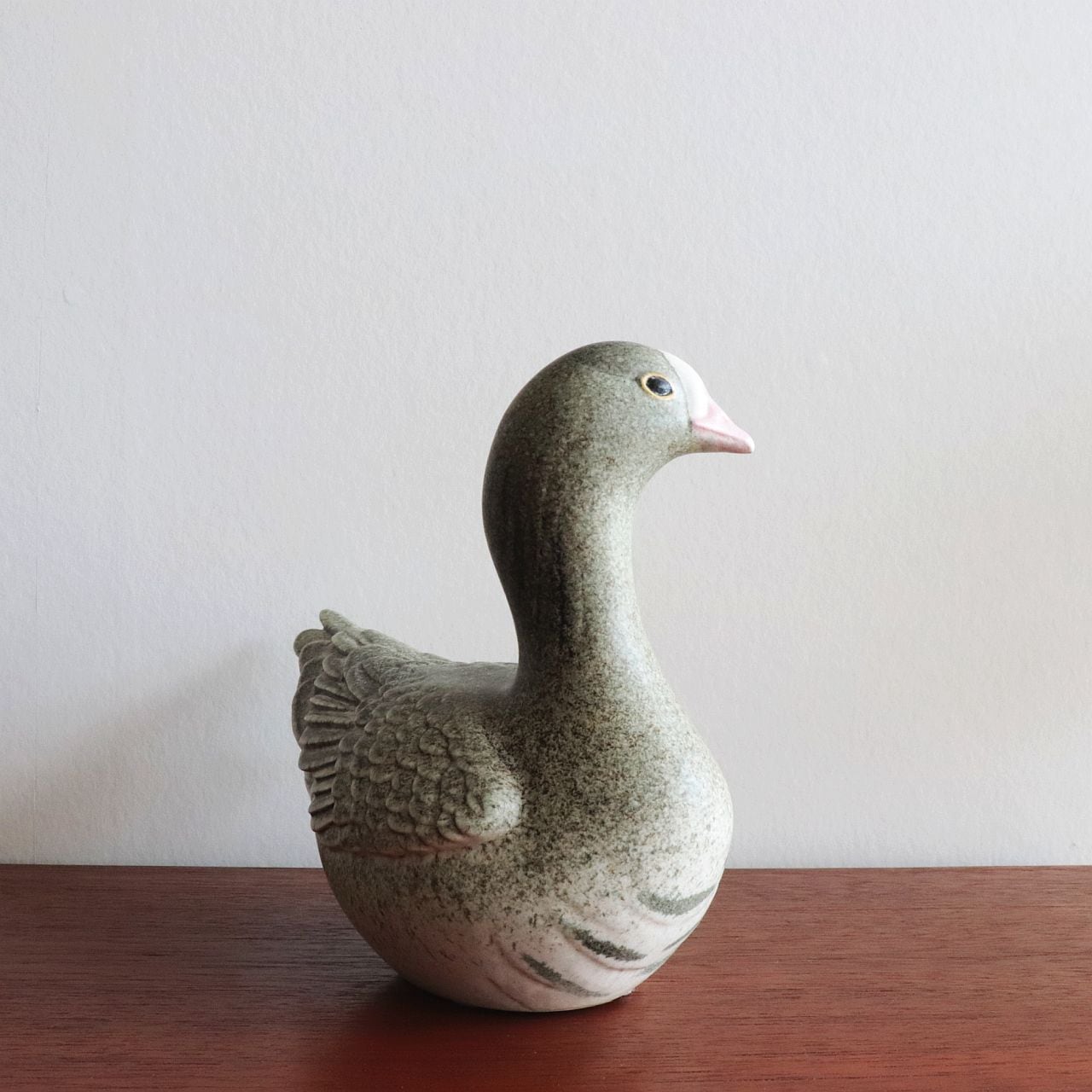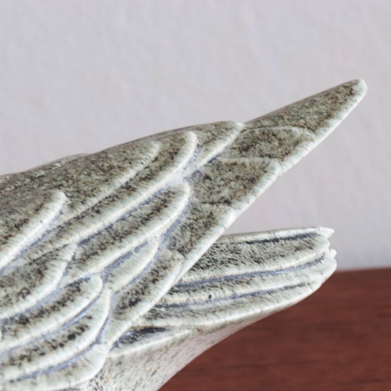 Paul Hoff は、この渡り鳥の慎ましくも凛とした佇まいを、丸みを帯びたフォルムと落ち着いた釉薬の色調で表現しています。胸を張り、静かに前を見つめる姿は、長い旅路を生き抜く鳥の強さと繊細さを同時に感じさせます。羽の重なりを思わせる細かな凹凸や、柔らかなラインの処理は、彼の動物造形の特徴がよく表れた仕上がりです。