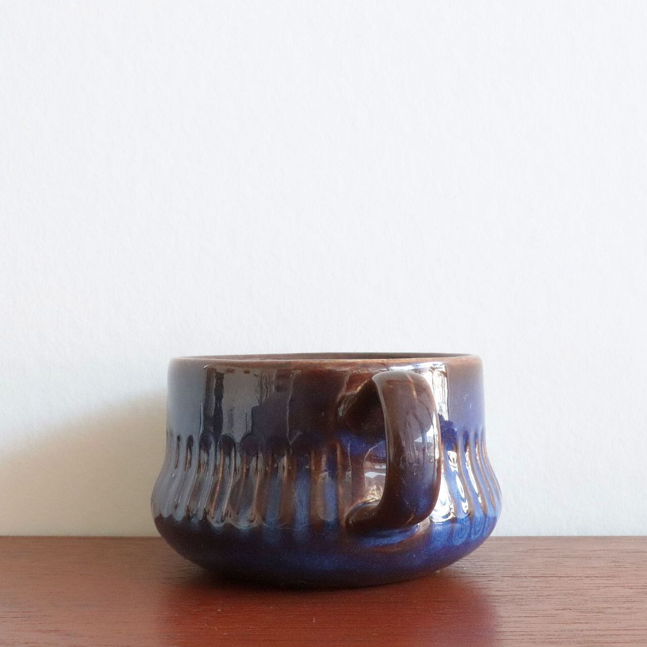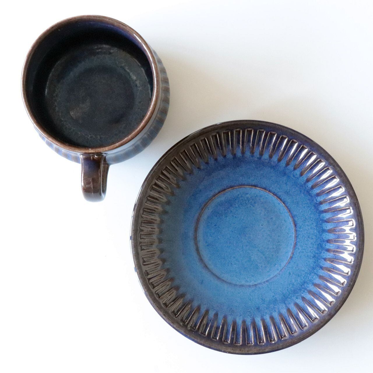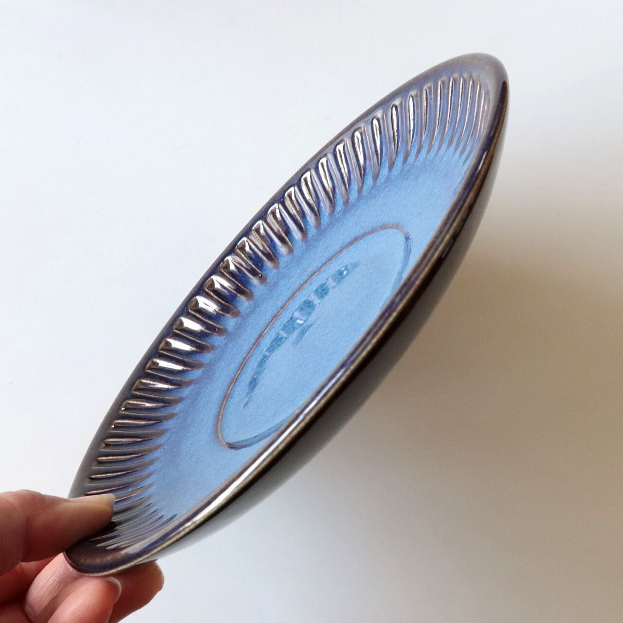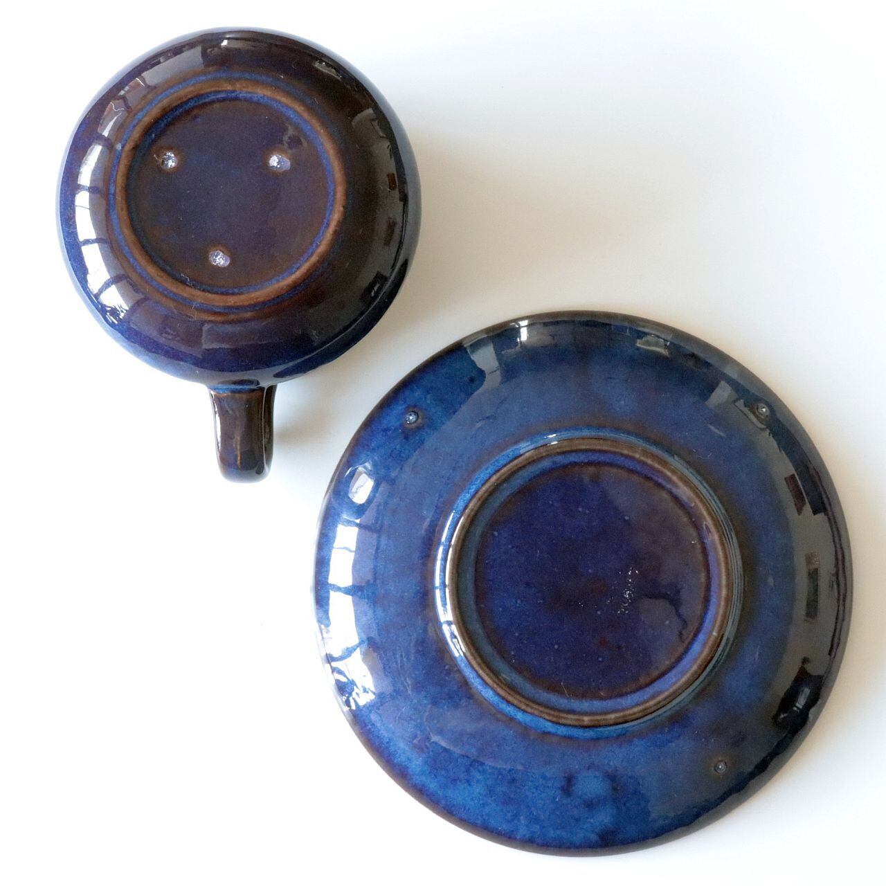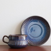 深い光沢のあるブルーを基調に、釉薬の濃淡によって表現された表情が特徴的なデザイン。シンプルながらも存在感があり、また個体によってそれぞれ表情が大きく異なるのも魅力のひとつです。