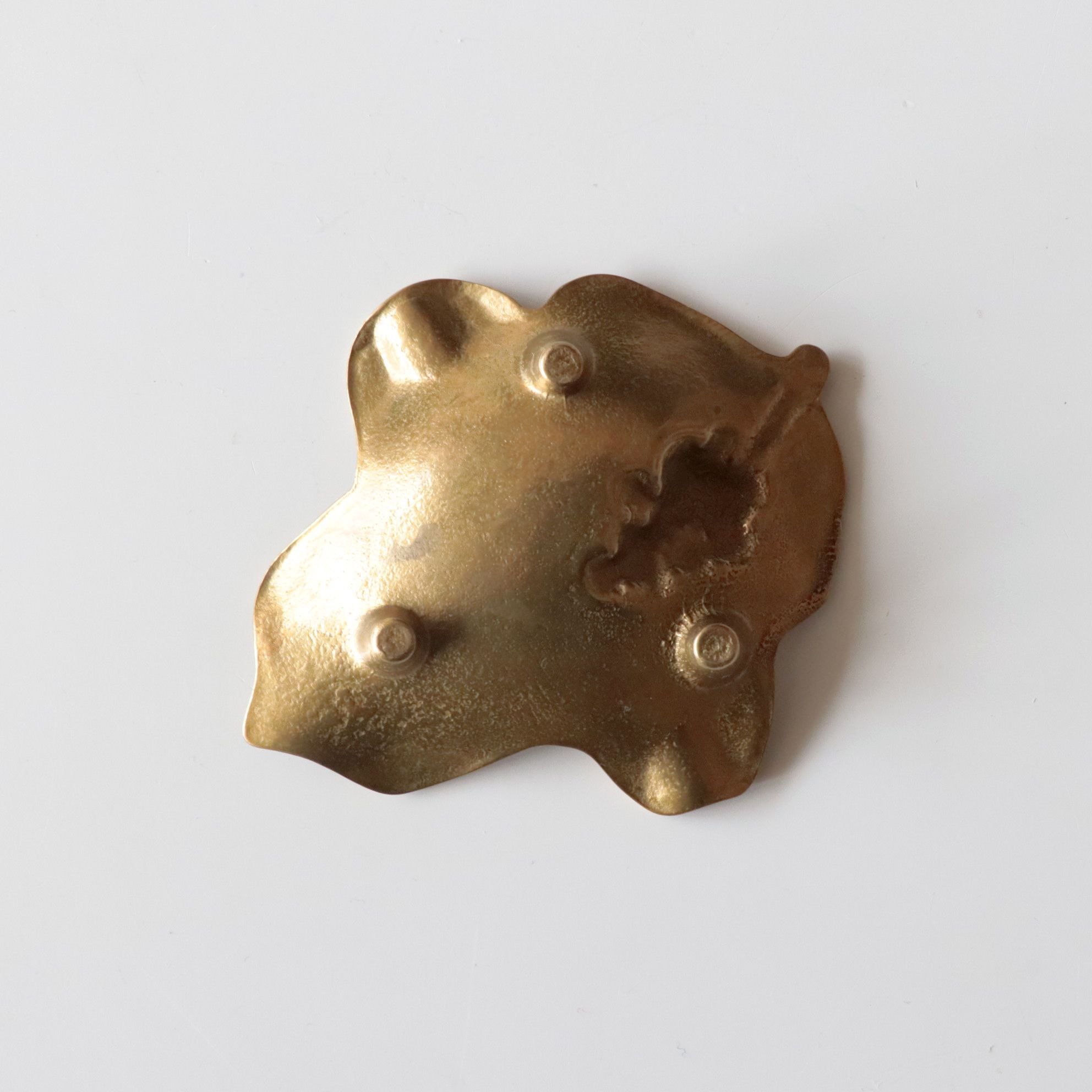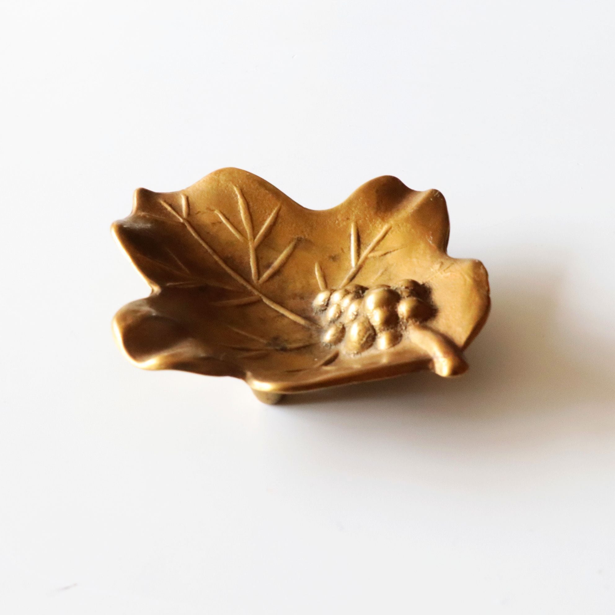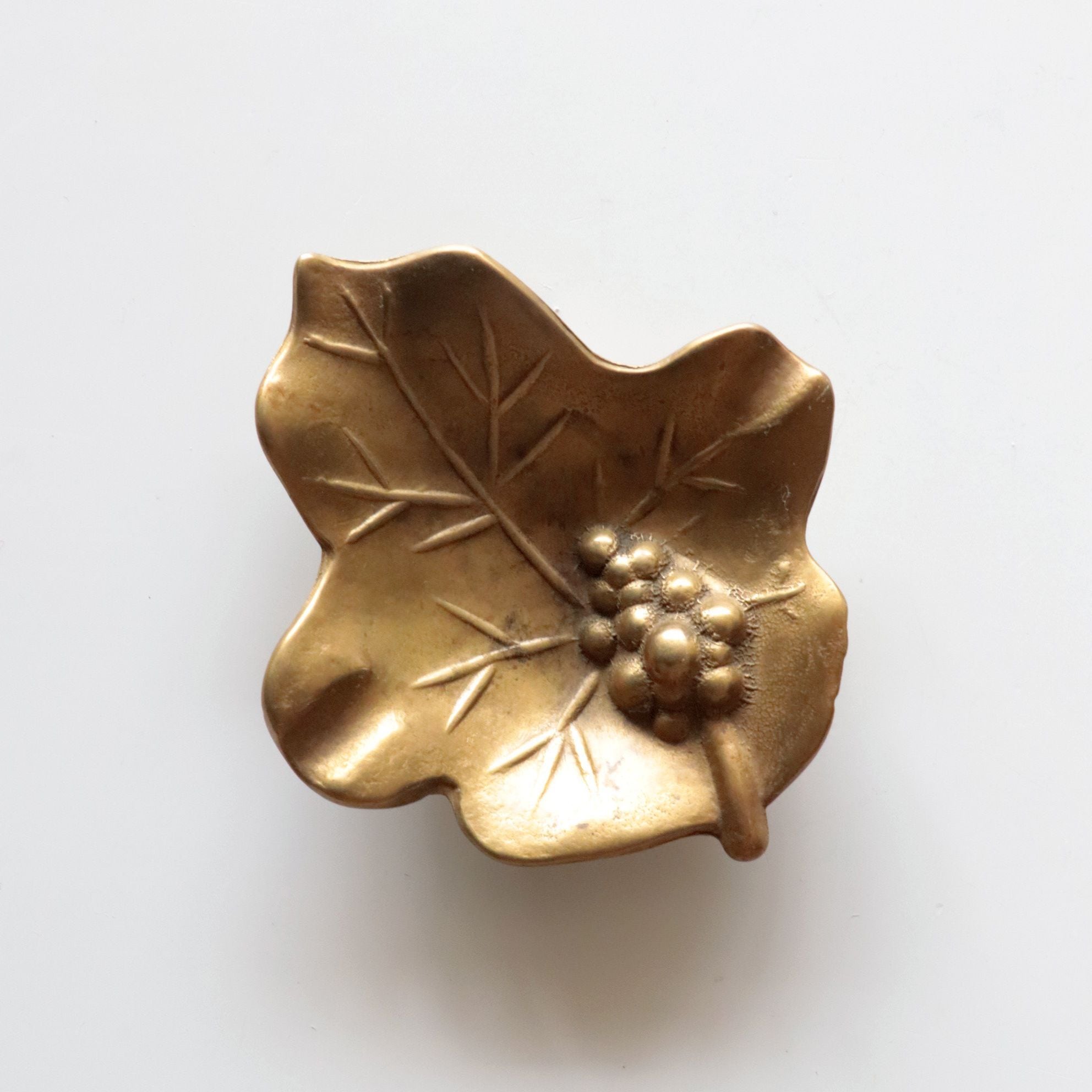 ブドウと葉っぱをイメージしたデザインで、プレス鋳造によって造形されています。小さなサイズですから、アクセサリーピローや小物入れのような用途に使用されていたように思われます。