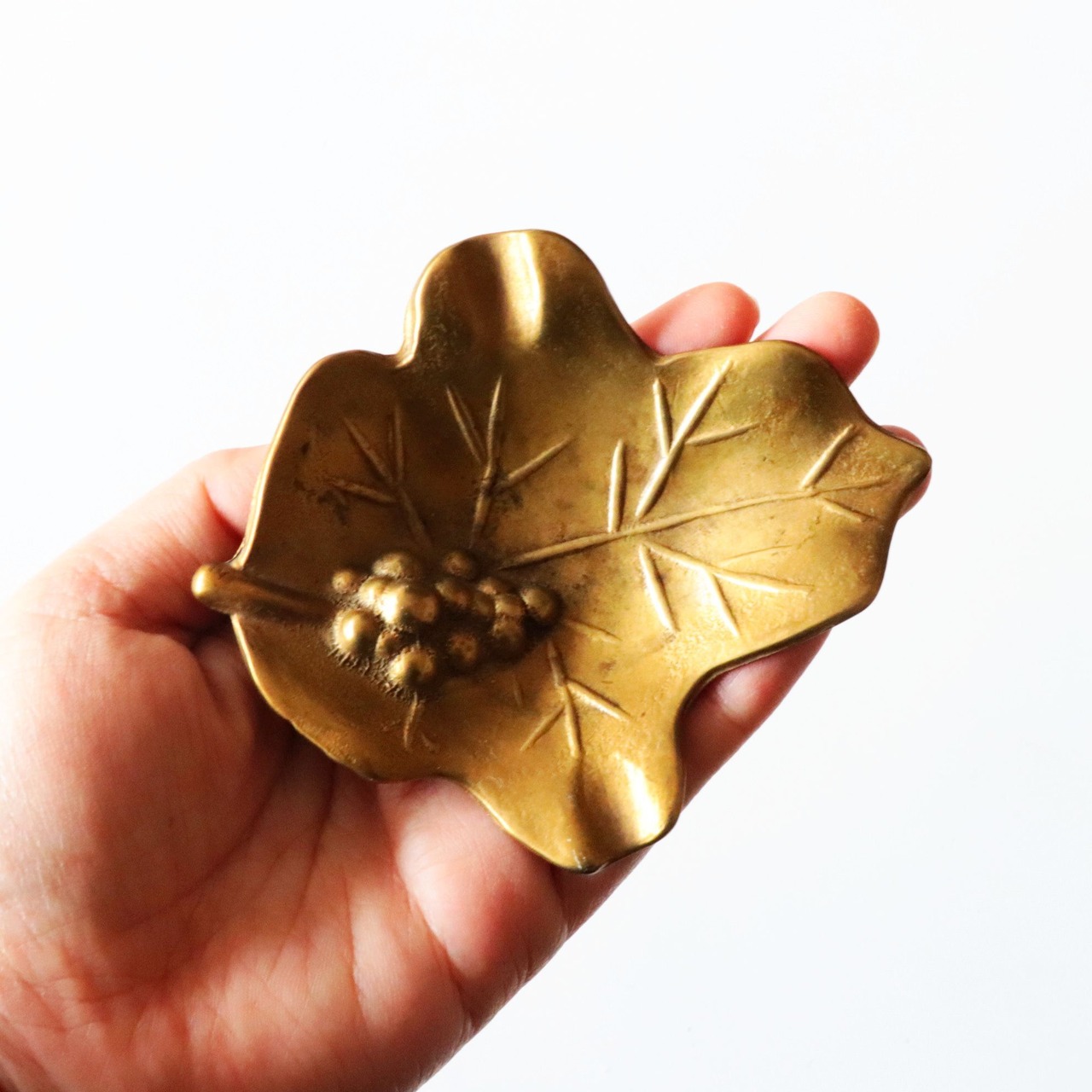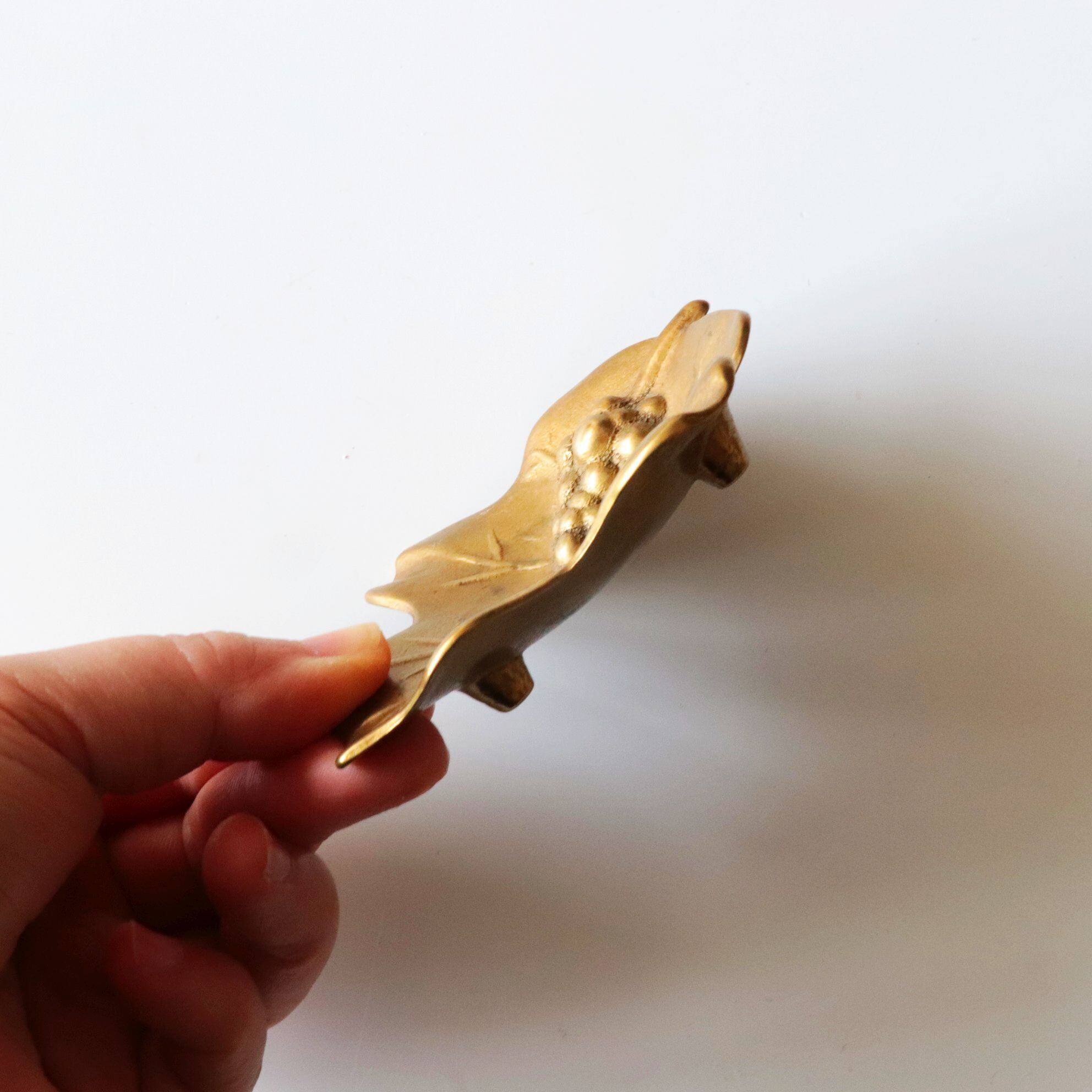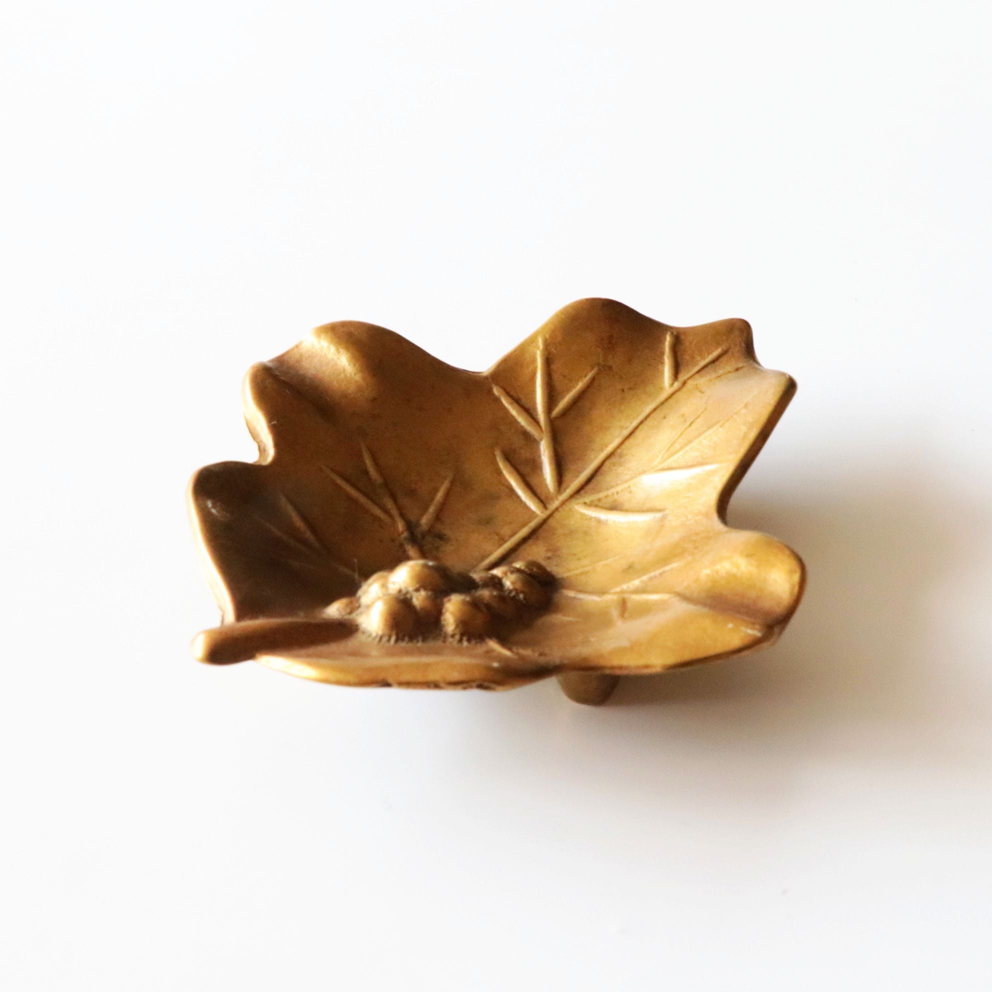 ブドウと葉っぱをイメージしたデザインで、プレス鋳造によって造形されています。小さなサイズですから、アクセサリーピローや小物入れのような用途に使用されていたように思われます。