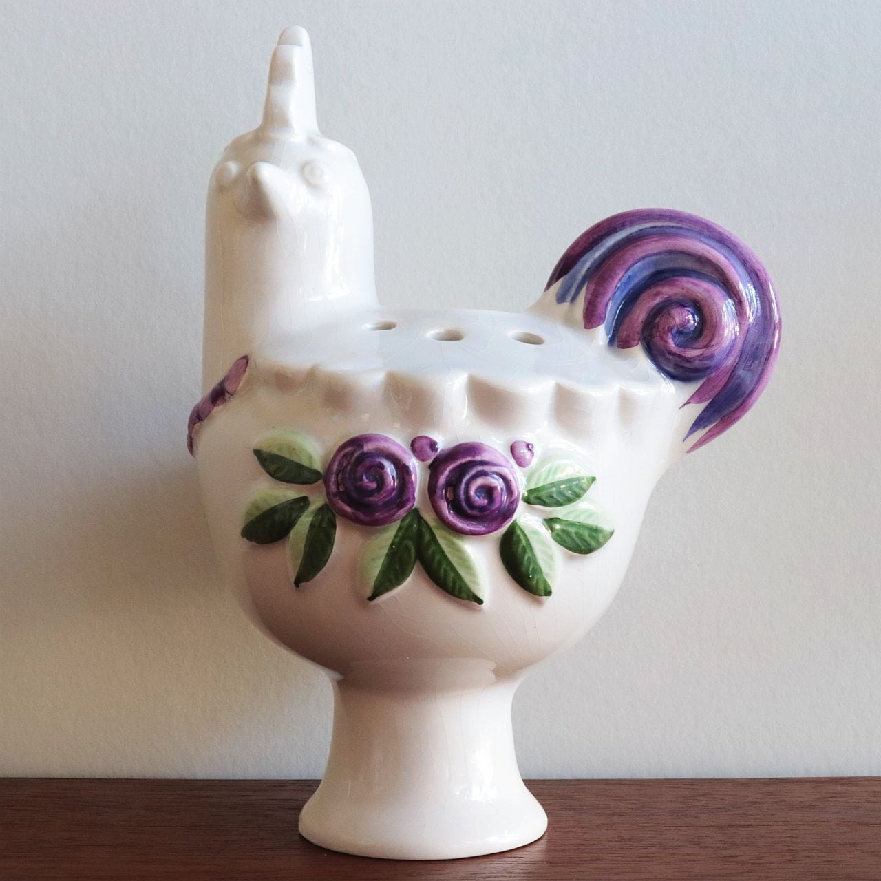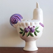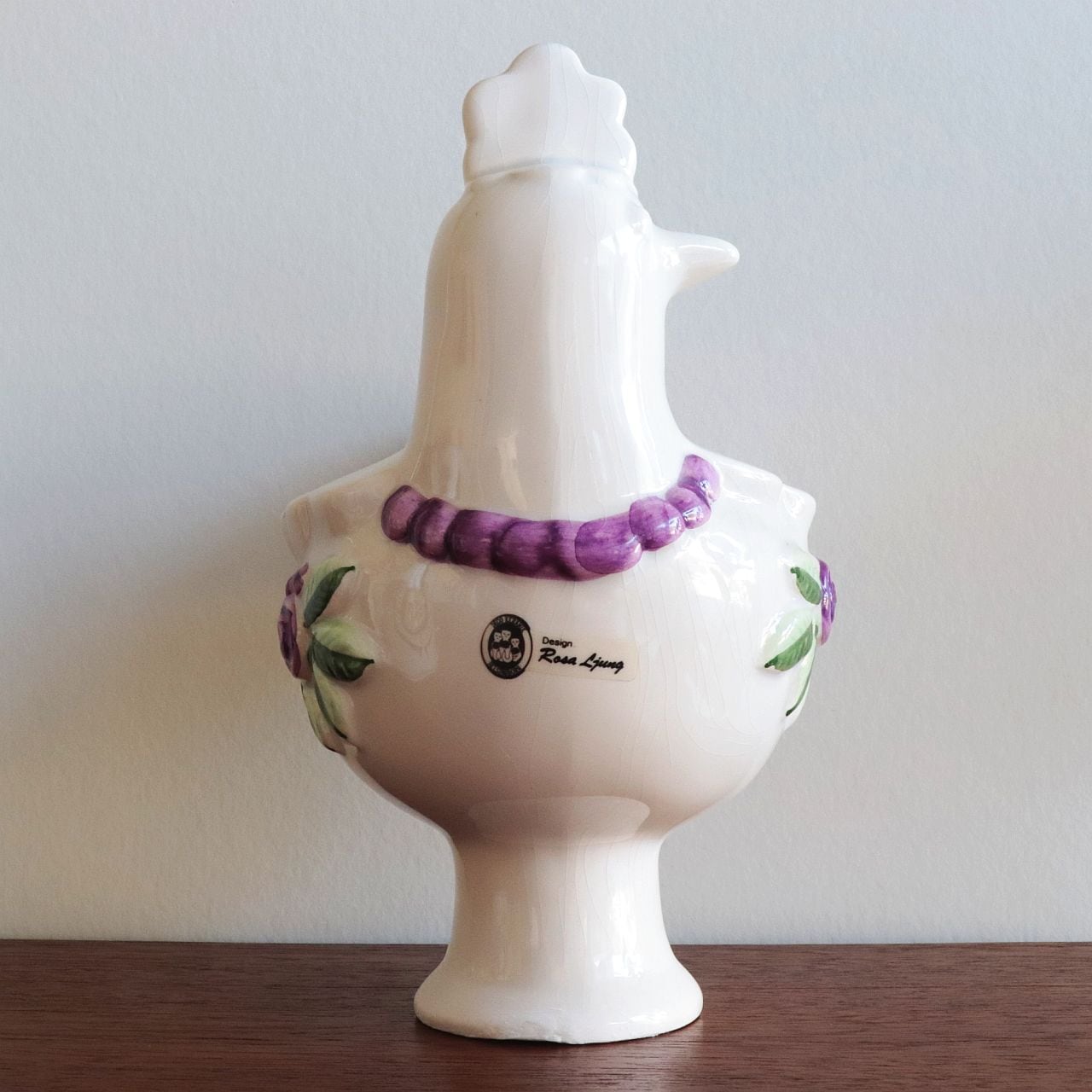 スウェーデンの陶芸家Rosa Ljung(ローサ・ユング)によって1970〜80年代にデザインされた、鳥のかたちをしたフラワーベース。製作はHelsingborg(ヘルシンボリ)の陶器メーカー〈Deco〉によるもので、彼女の代表的なモチーフのひとつである鳥と花の装飾が印象的な作品です。