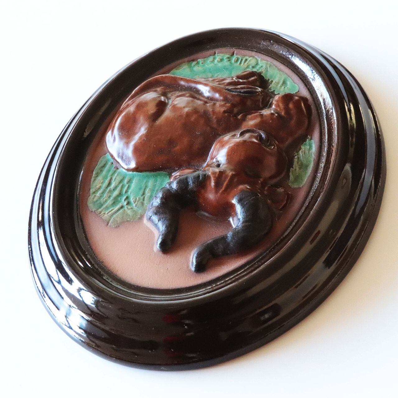 同社陶板の特徴として、製造時にコテやヘラによる成型時の凹凸、焼成時の釉薬抜け・色とび、また製造後の小さな欠けなどが比較的おきやすいアイテムとなります。また同じモチーフの製品でも製造時の個体差により若干のサイズ差が見られる工房となります。