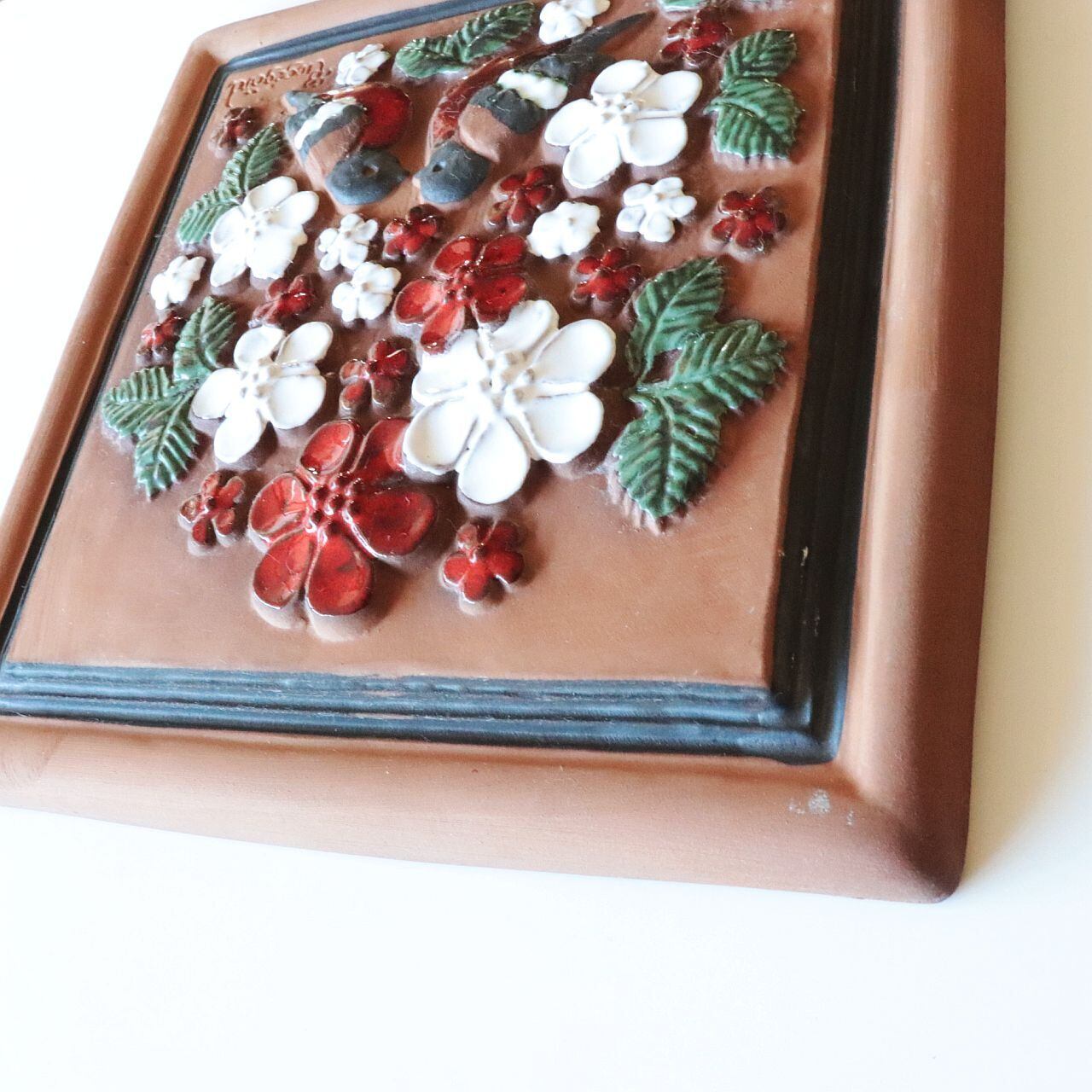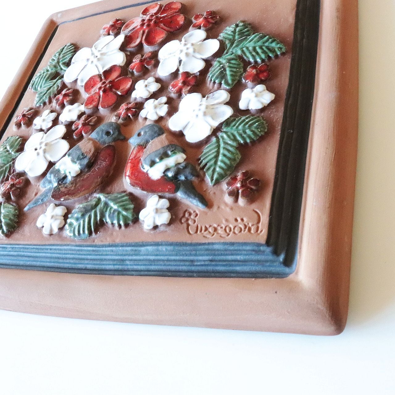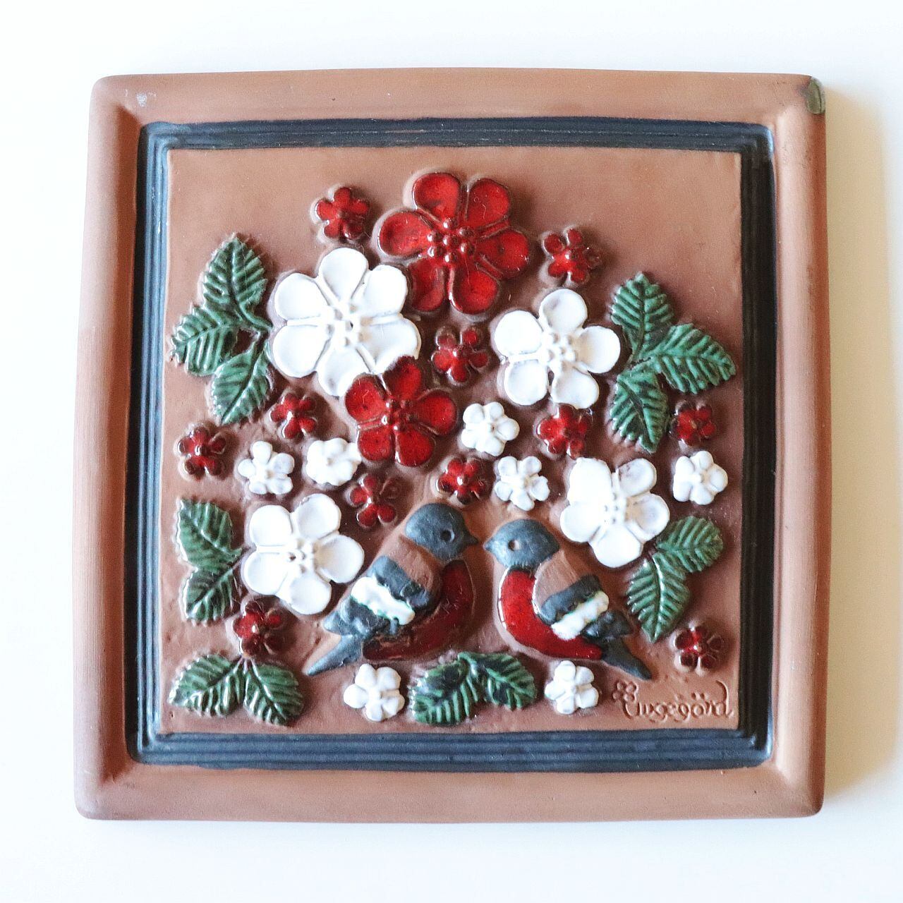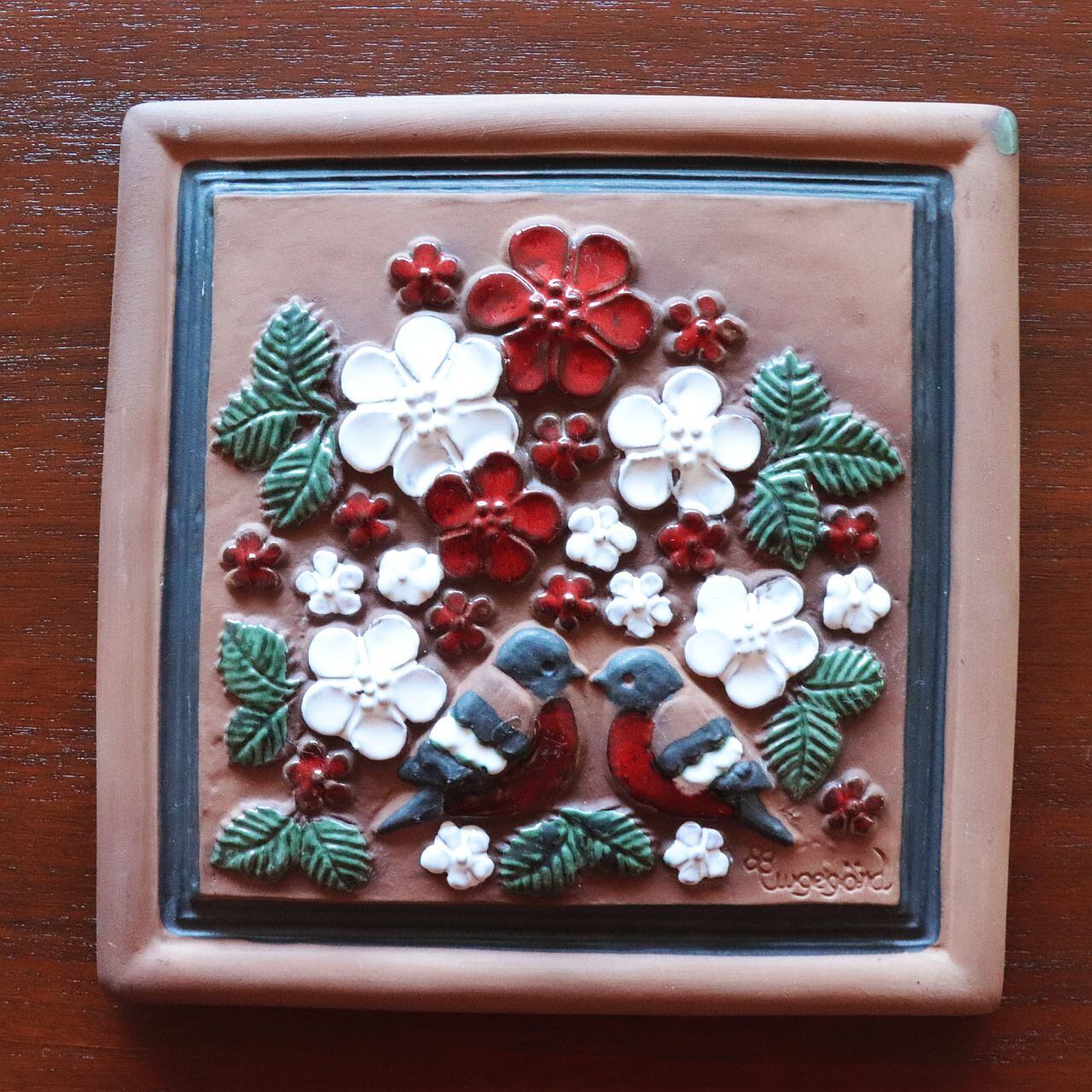 スウェーデンの陶器メーカーGabriel Keramik(ガブリエル・ケラミック)によって1970年代に製作された装飾陶板の一枚。咲き誇る花々の中に、2羽のウソ(bullfinch)が寄り添うように描かれた作品です。