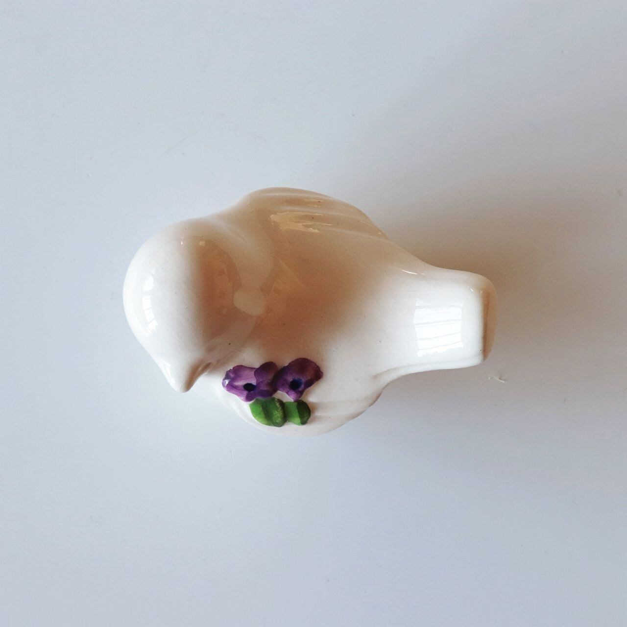 白い陶肌に、手描きで施されたラベンダー色の花模様と、丸みを帯びたフォルムが特徴的で、北欧らしい素朴さと優美さが同居する佇まい。小ぶりながらも存在感があり、棚や窓辺にそっと置くだけで空間にやさしい彩りを添えてくれます。