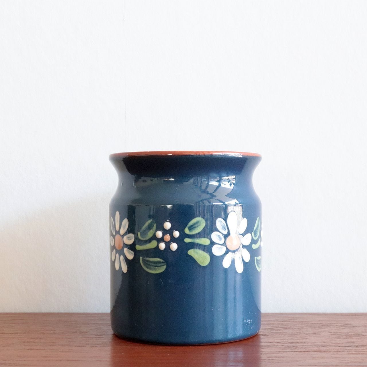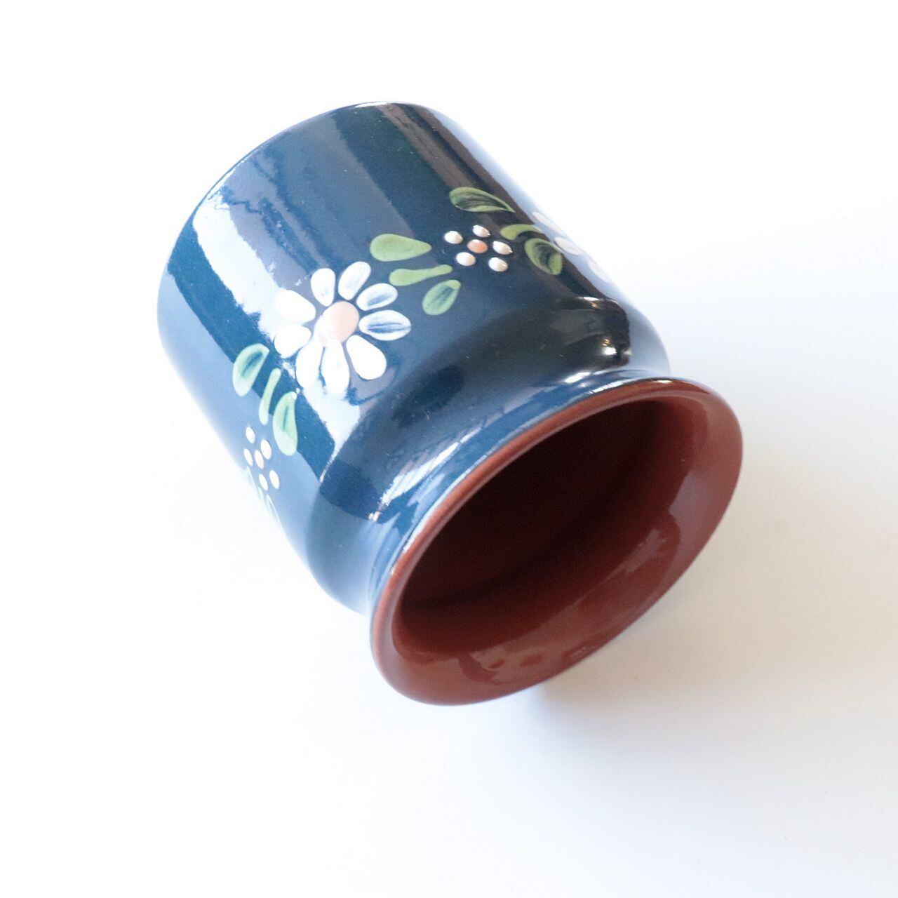 ややくびれた首元と、すっとした本体。全体に施された深みのある釉薬は、光の加減によって表情を変え、見る角度によって異なる印象を与えてくれます。手描きで描かれた模様も可憐で、素朴な美しさを感じるアイテムです。