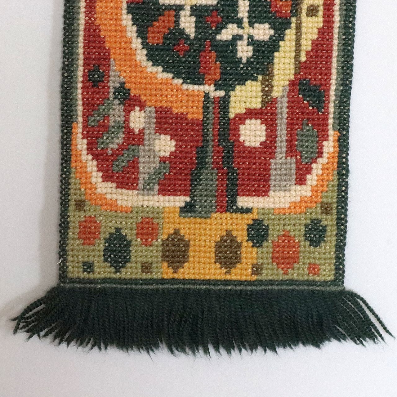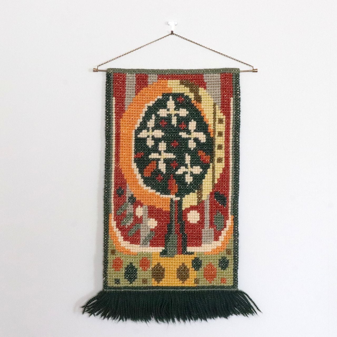 1960〜70年代頃に製作された、ヴィンテージのハンドメイド・ウールタペストリー。素朴な手仕事の温かみと、時代を感じさせる色使いが魅力の一枚です。
