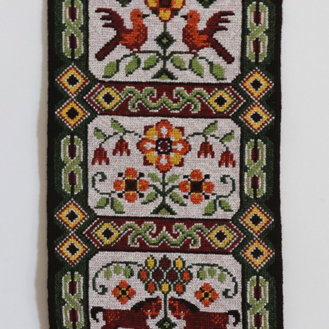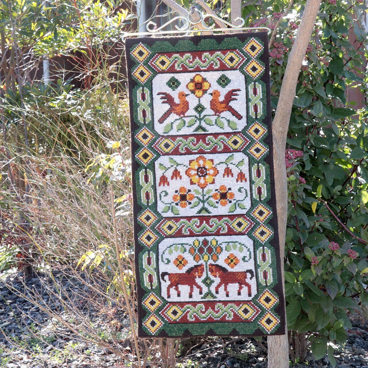 鳥と花、そしてウマがシンメトリーに織り込まれたデザインが施されており、民芸的なモチーフの中に自然へのまなざしと物語性が感じられます。