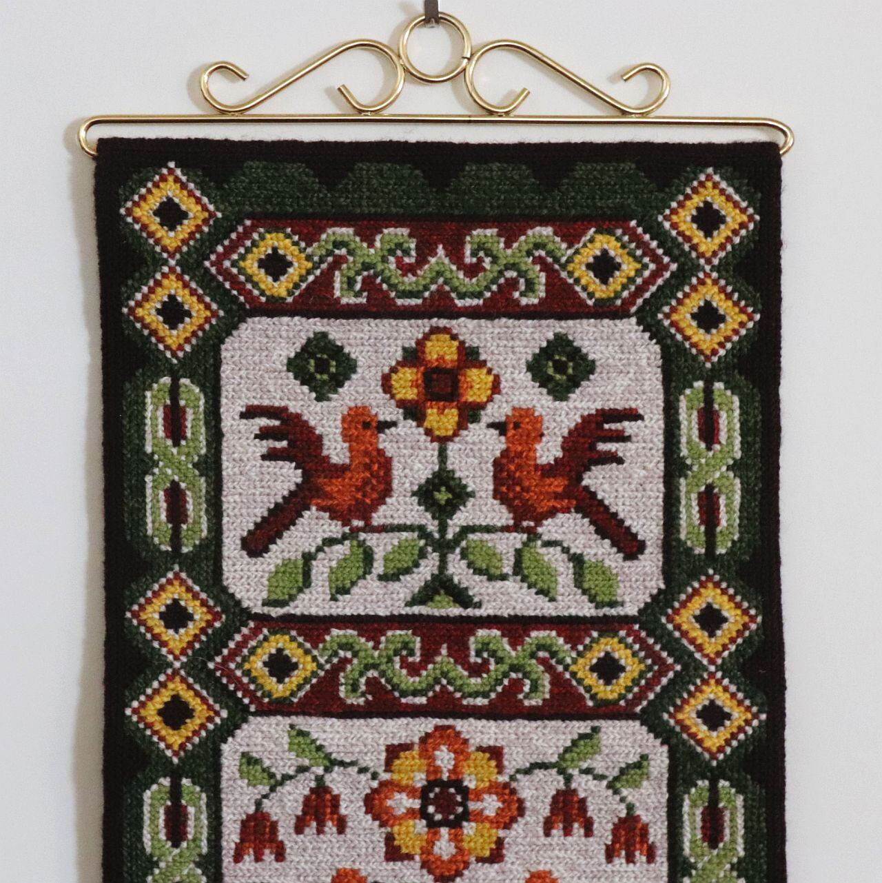 1970年代頃に製作された、ヴィンテージのハンドメイド・ウールタペストリー。素朴な手仕事の温かみと、時代を感じさせる色使いが魅力の一枚です。