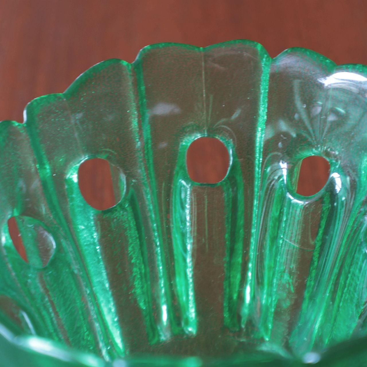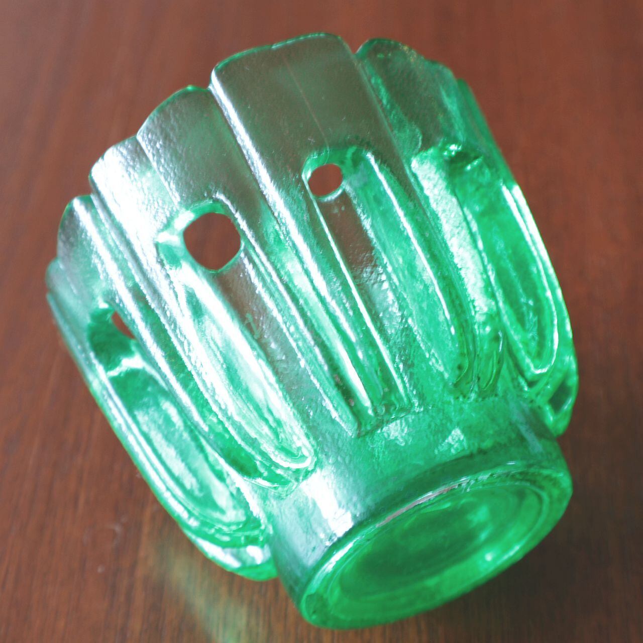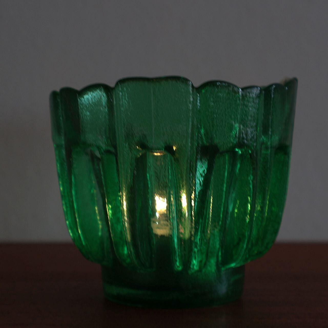 大枠としては花をモチーフとしたキャンドルホルダーですが、上部に窓が開いた珍しいフォルムです。キャンドルを灯すとガラスから、窓から、そして上部からと複雑に光が入りみだり独特の美しさを感じるデザインです。
