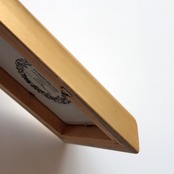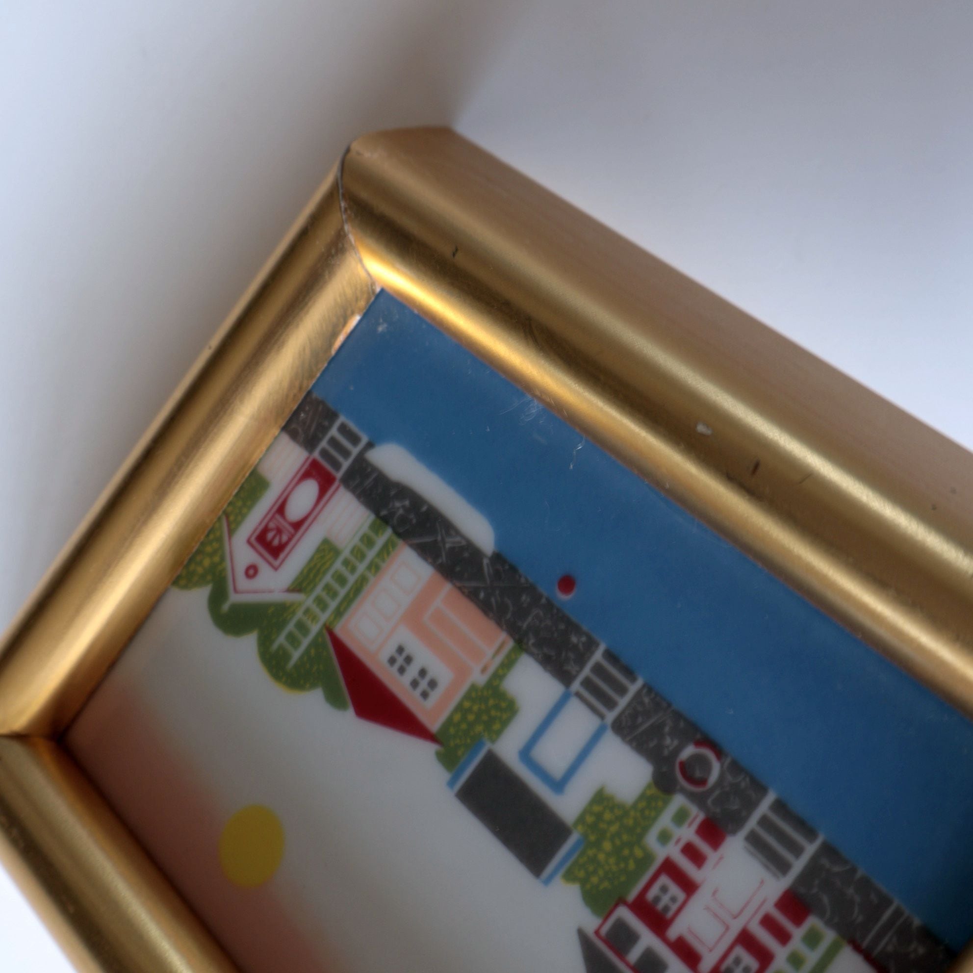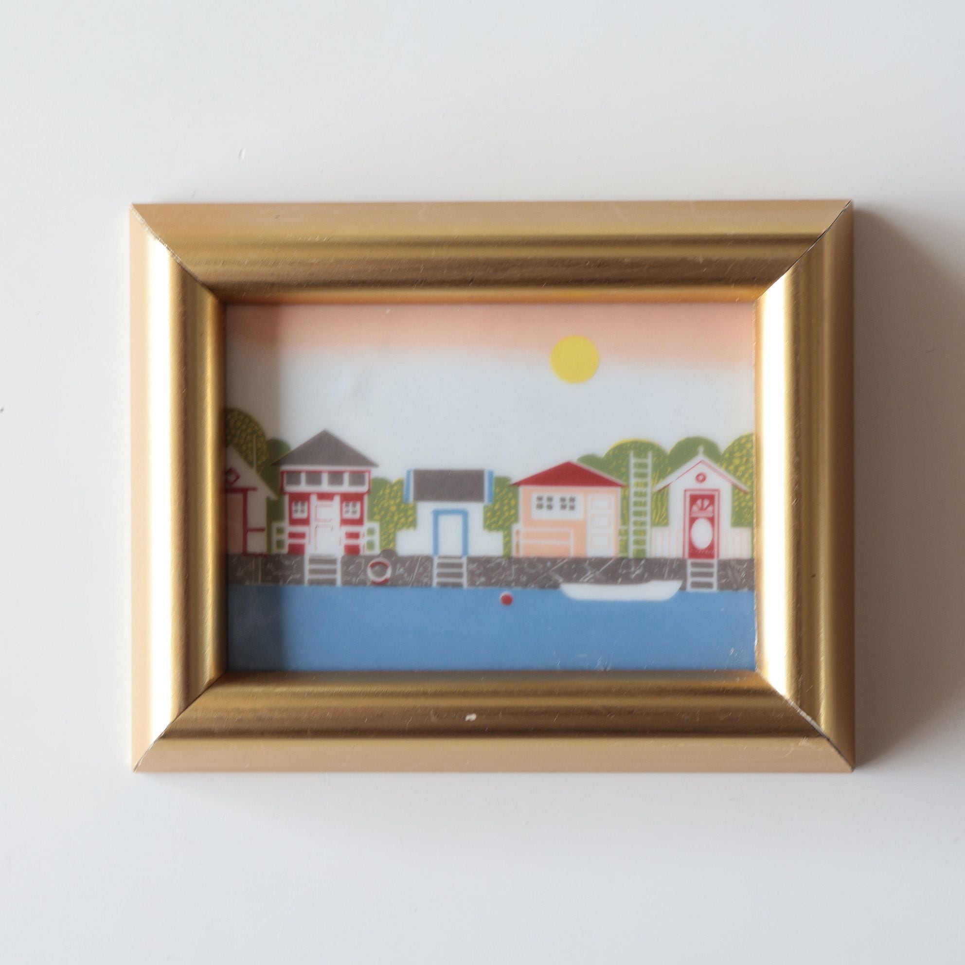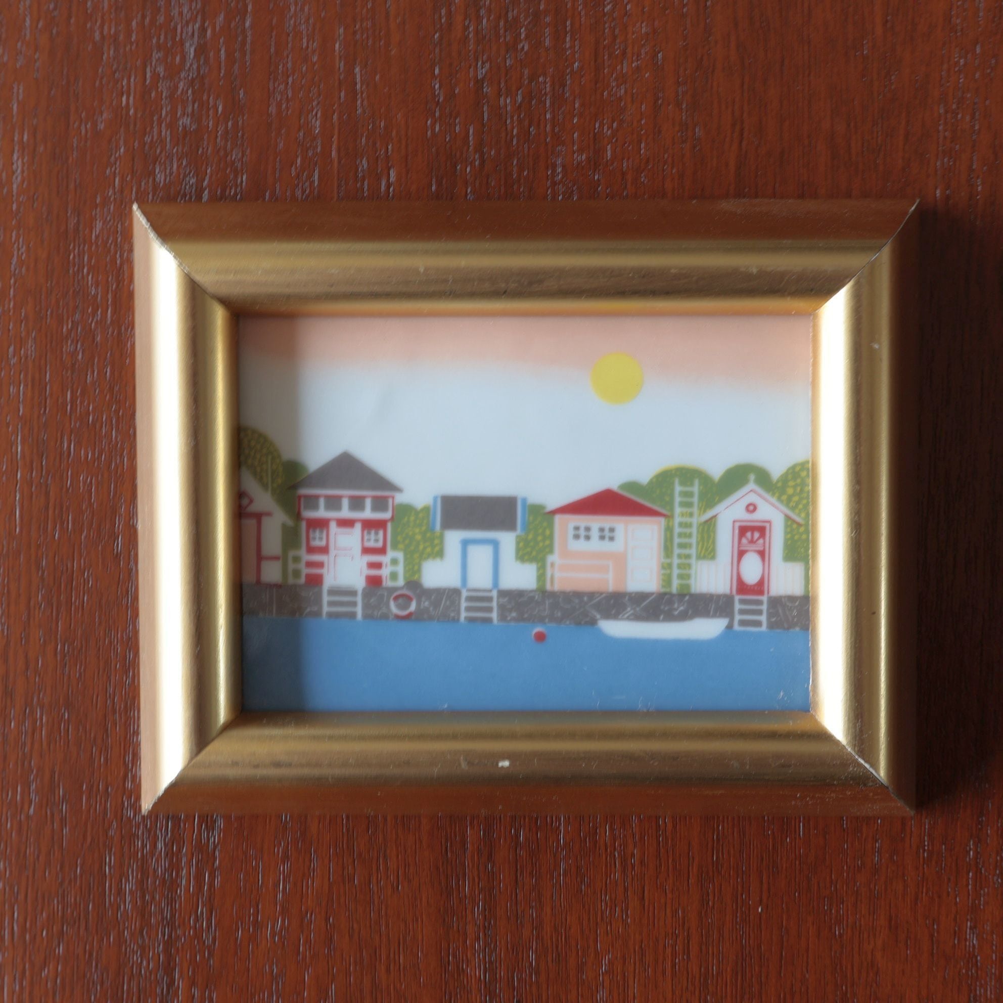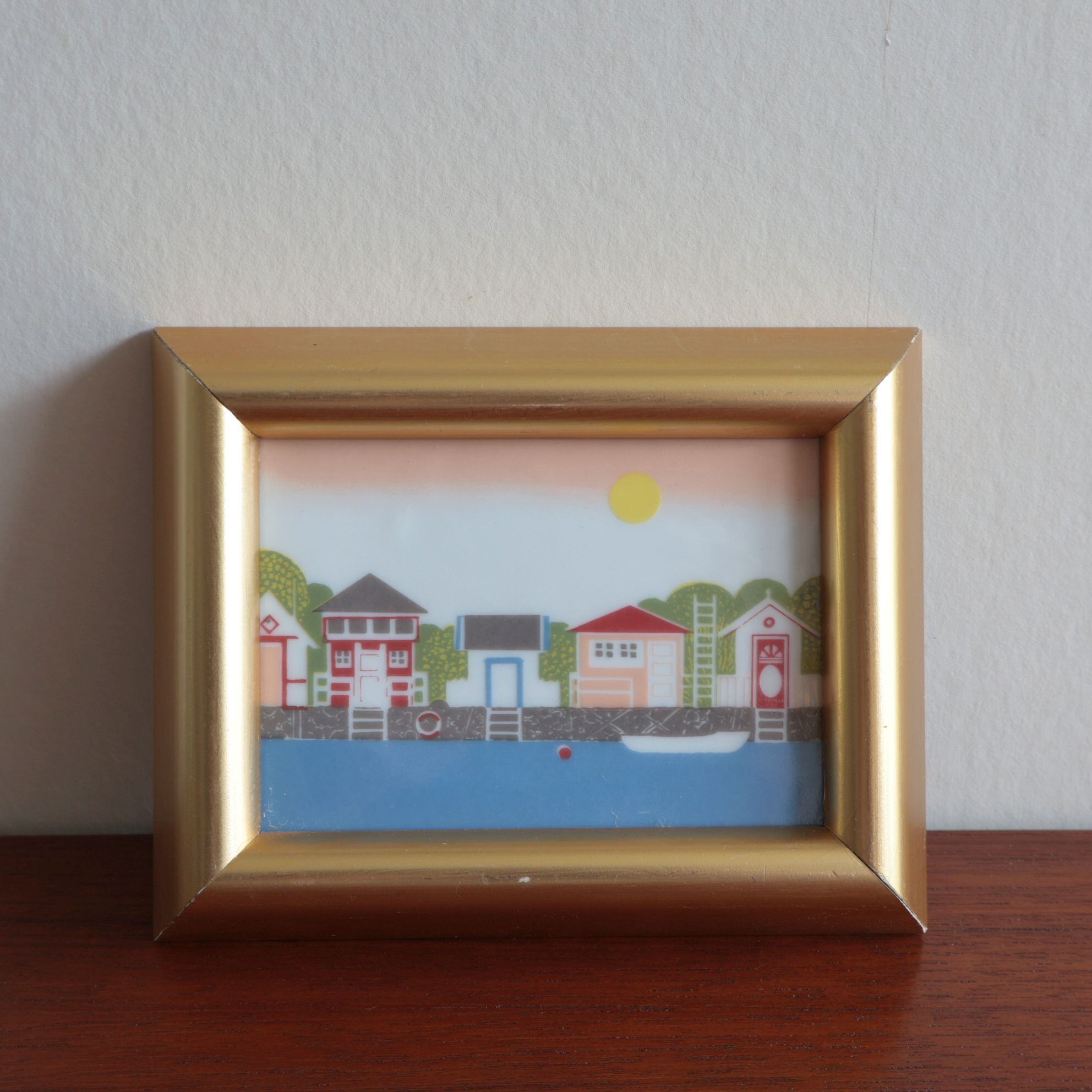 ノルウェーらしい色とりどりの家が描かれた海辺の風景。中央は陶板、枠は木に金色の彩色がされています。木部の一部に経年によるダメージが見られます。壁掛けが出来るよう、背面に金具が付いています。