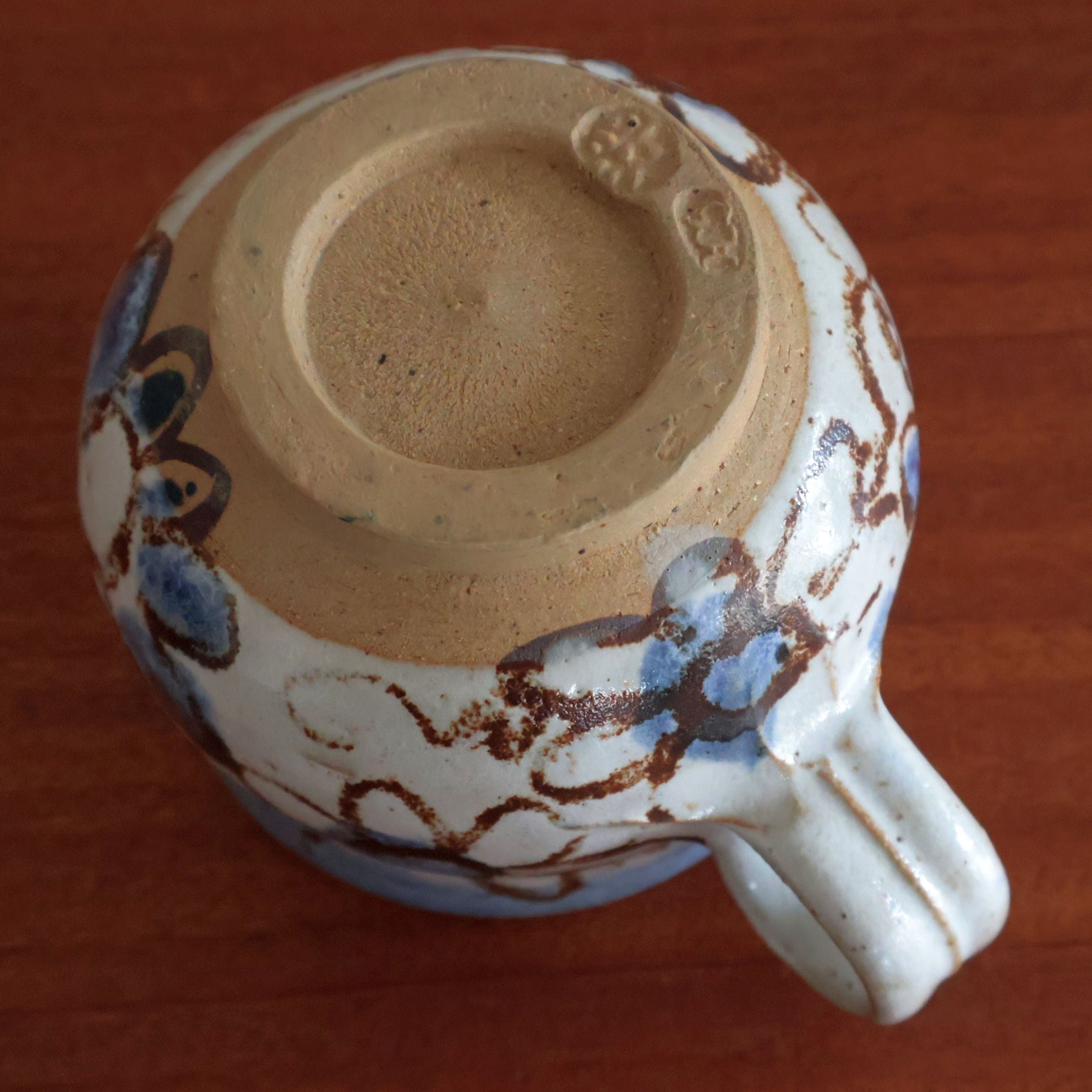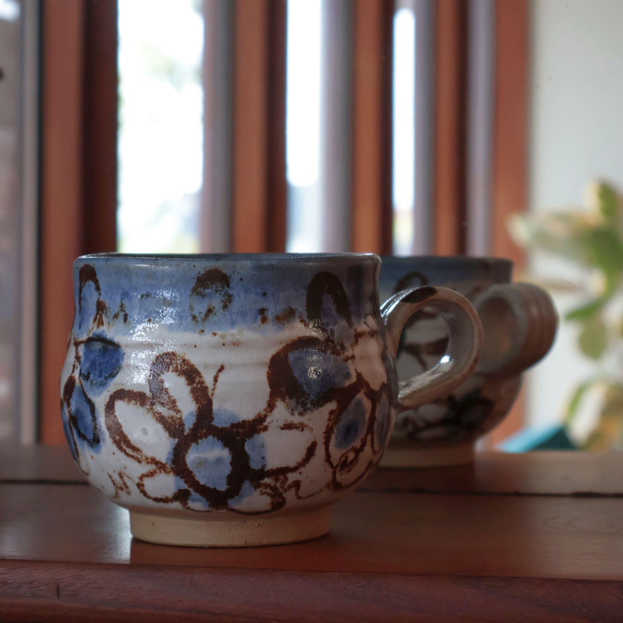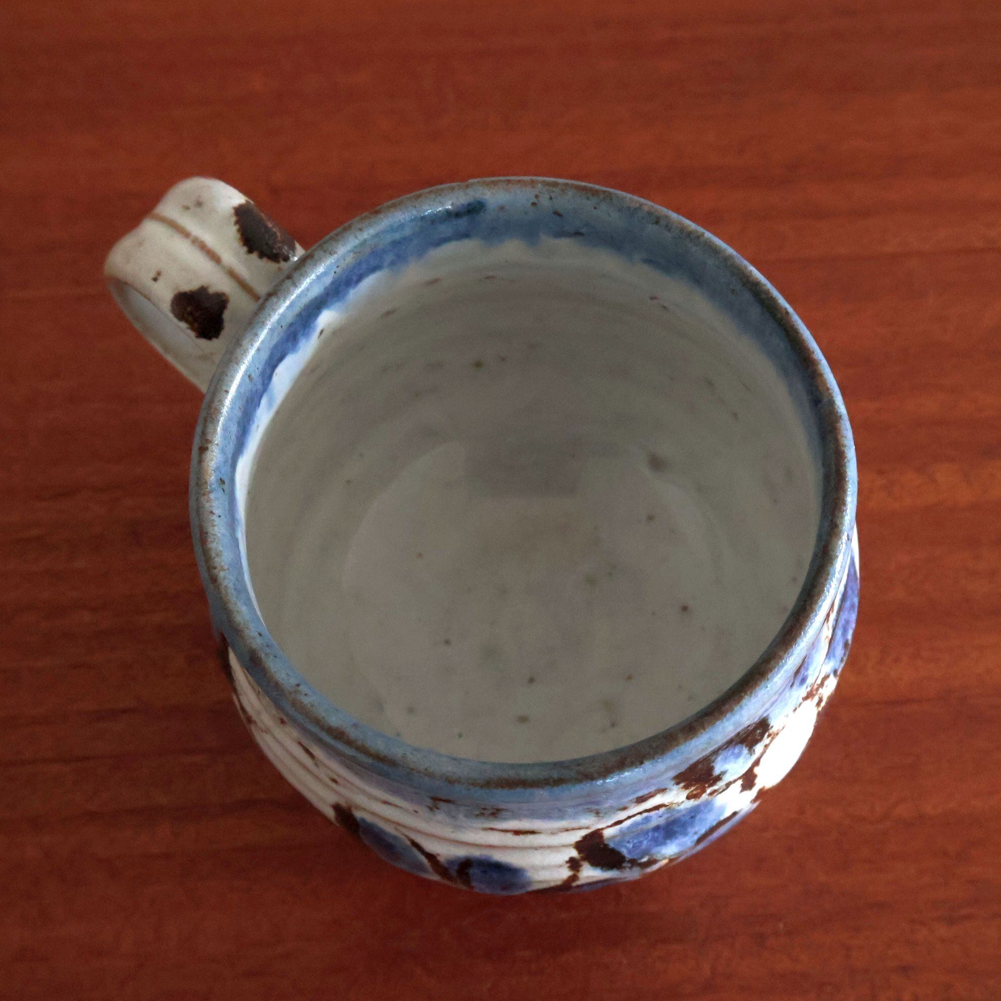 手描きの青と茶を基調にした抽象的な花模様が印象的で、どこか民族的な雰囲気も感じさせるデザインです。ぽってりとした厚みのあるフォルムと、釉薬の濃淡が生み出す表情が魅力的で、手に取るたびに異なる景色を楽しめます。