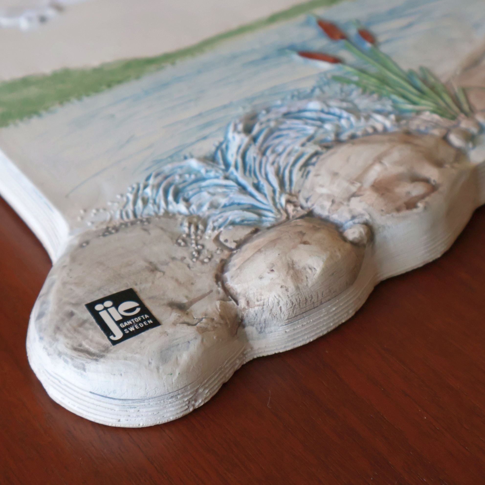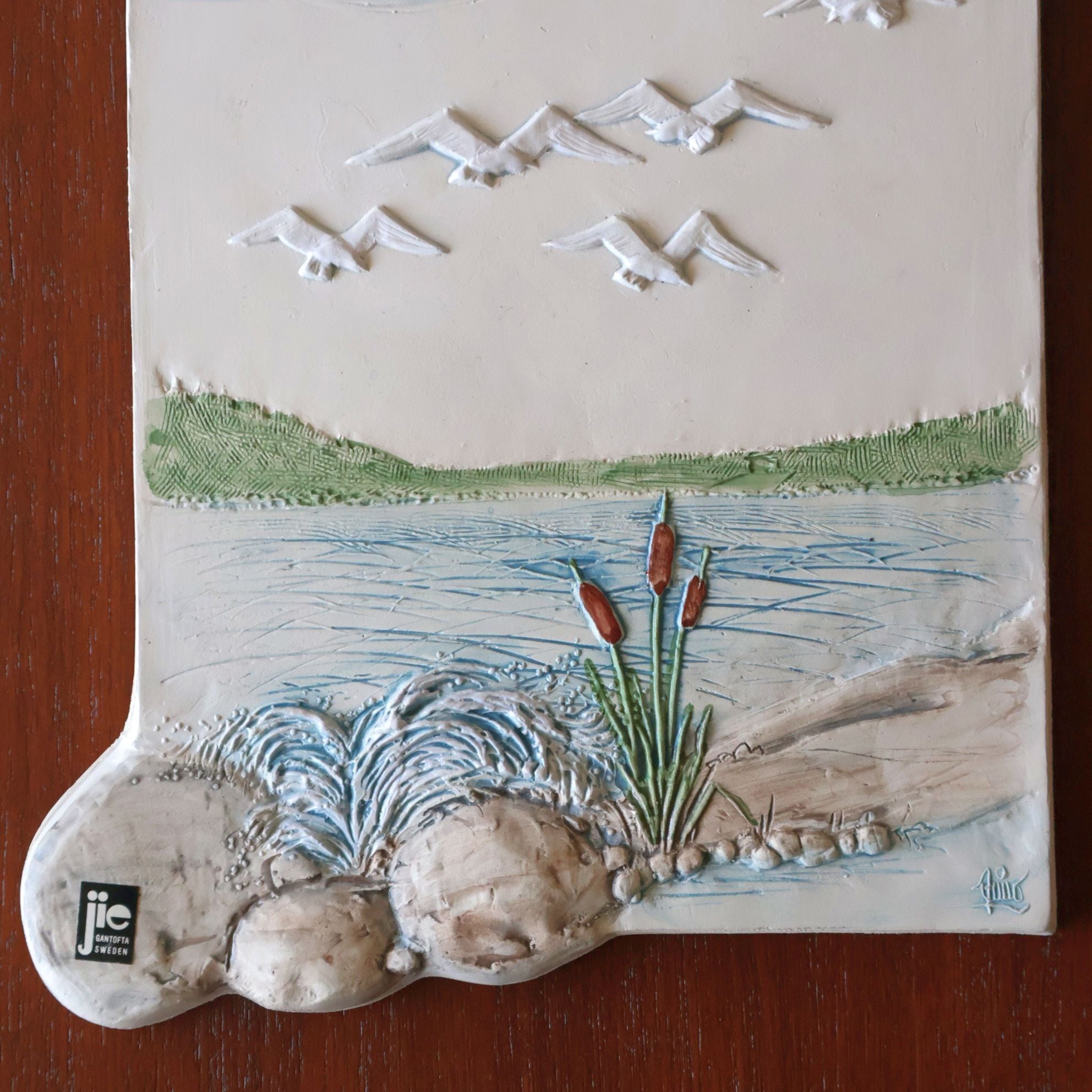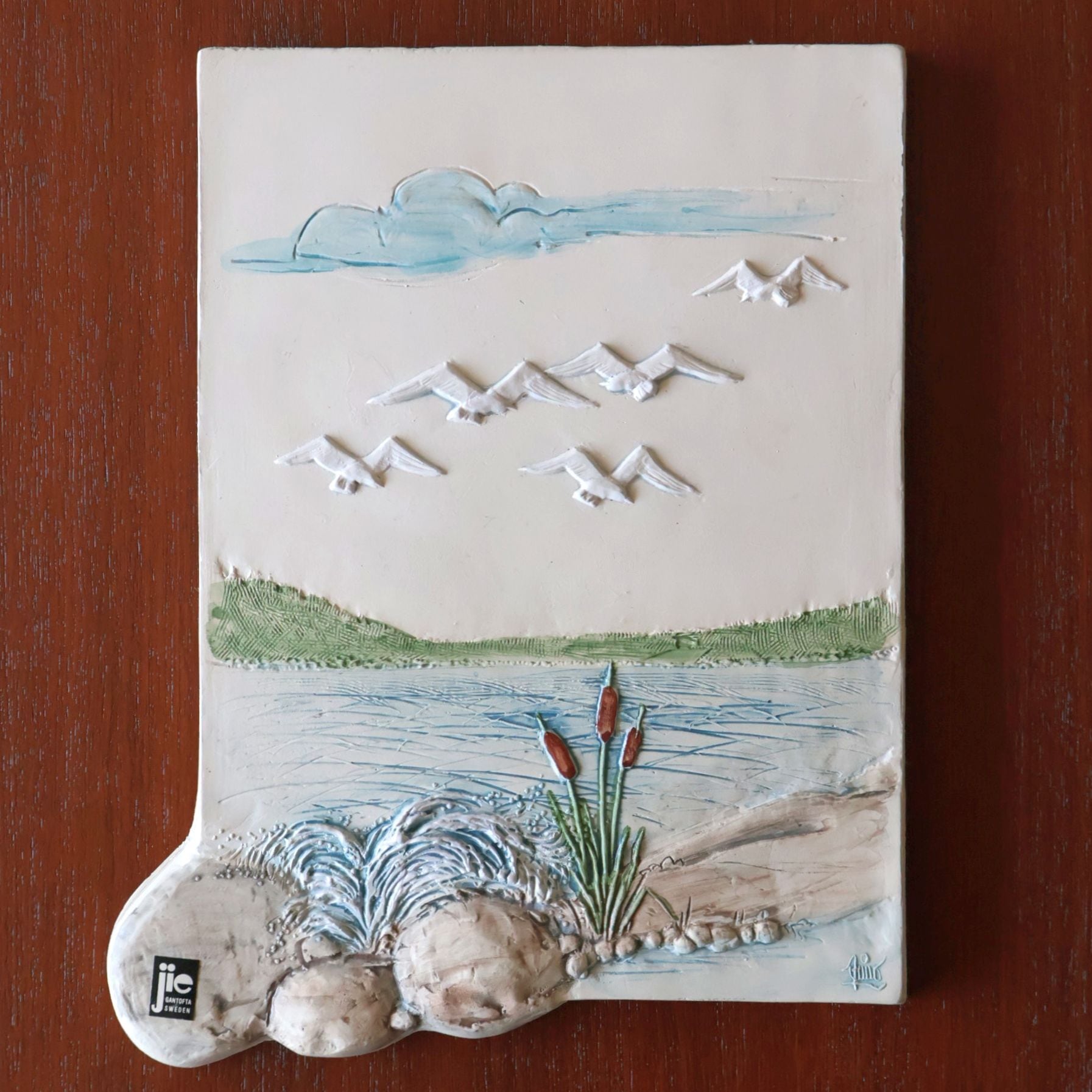 スウェーデンのJie Gantoftaで製作された陶板。1960年代からスウェーデンの家庭で人気となった陶板のひとつです。こちらはスウェーデンの水辺を描いた風景の陶板で、空に飛ぶカモメが北欧らしい情景を描いています。同社の代表的デザイナーAimo Nietosvuori による作品です。背面は壁掛けが出来るように金具が付いています。