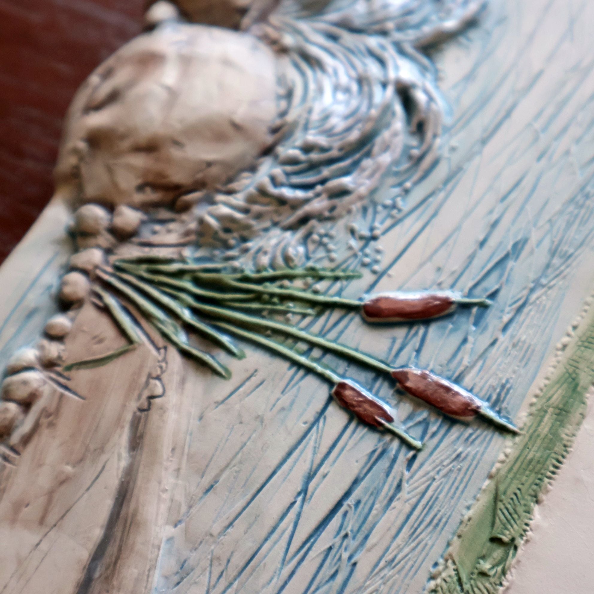 同社陶板の特徴として、製造時にコテやヘラによる成型時の凹凸、焼成時の釉薬抜け・色とび、また製造後の小さな欠けなどが比較的おきやすいアイテムとなります。また同じモチーフの製品でも製造時の個体差により若干のサイズ差が見られる工房となります。