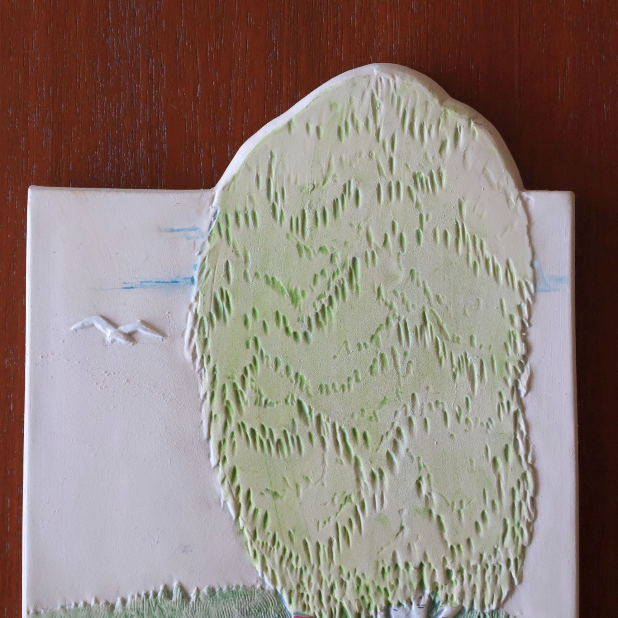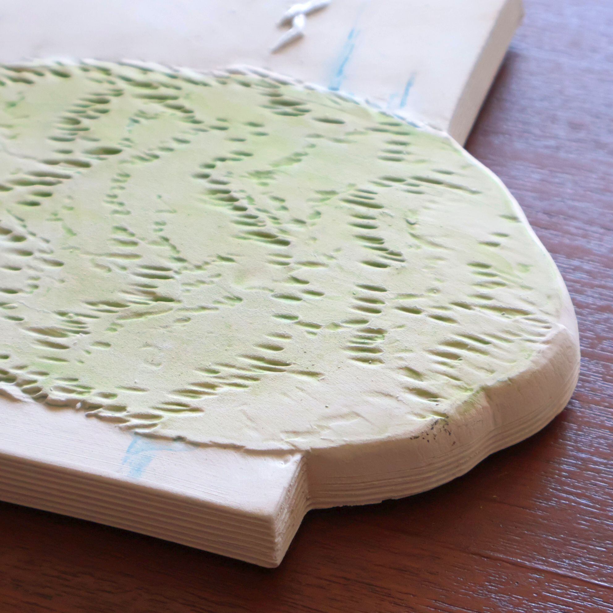 同社陶板の特徴として、製造時にコテやヘラによる成型時の凹凸、焼成時の釉薬抜け・色とび、また製造後の小さな欠けなどが比較的おきやすいアイテムとなります。また同じモチーフの製品でも製造時の個体差により若干のサイズ差が見られる工房となります。