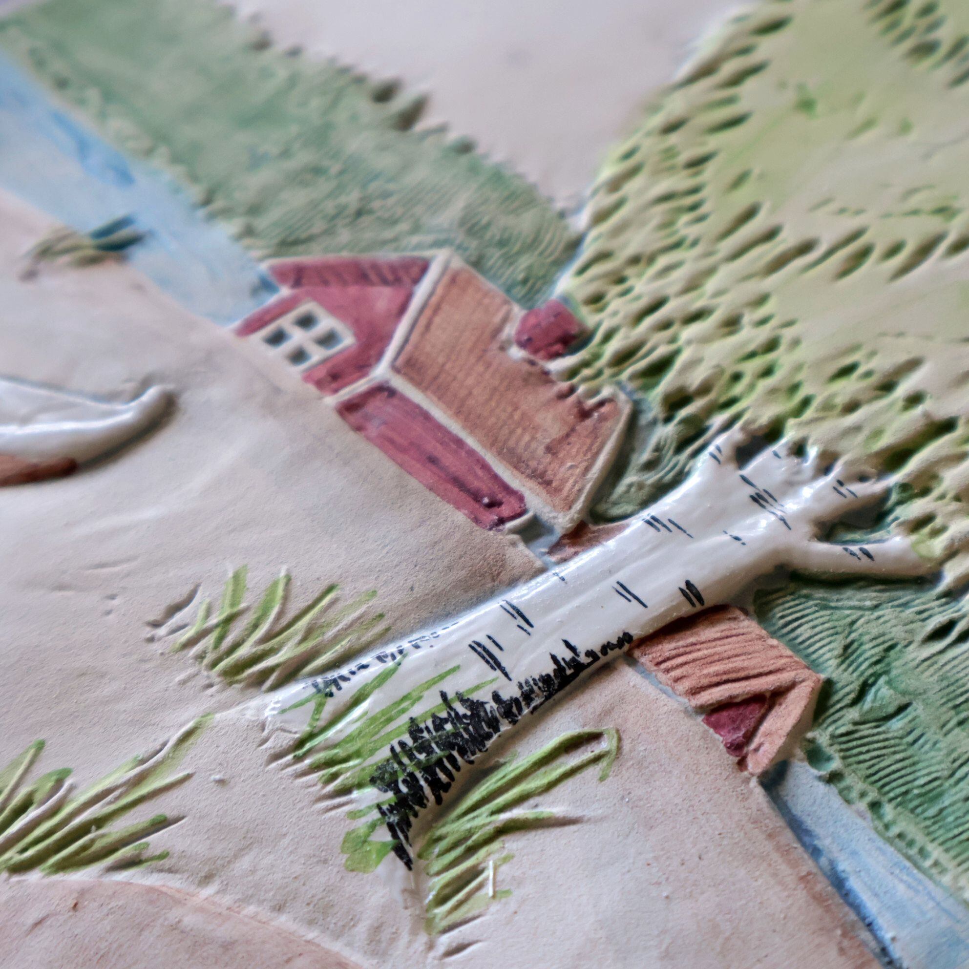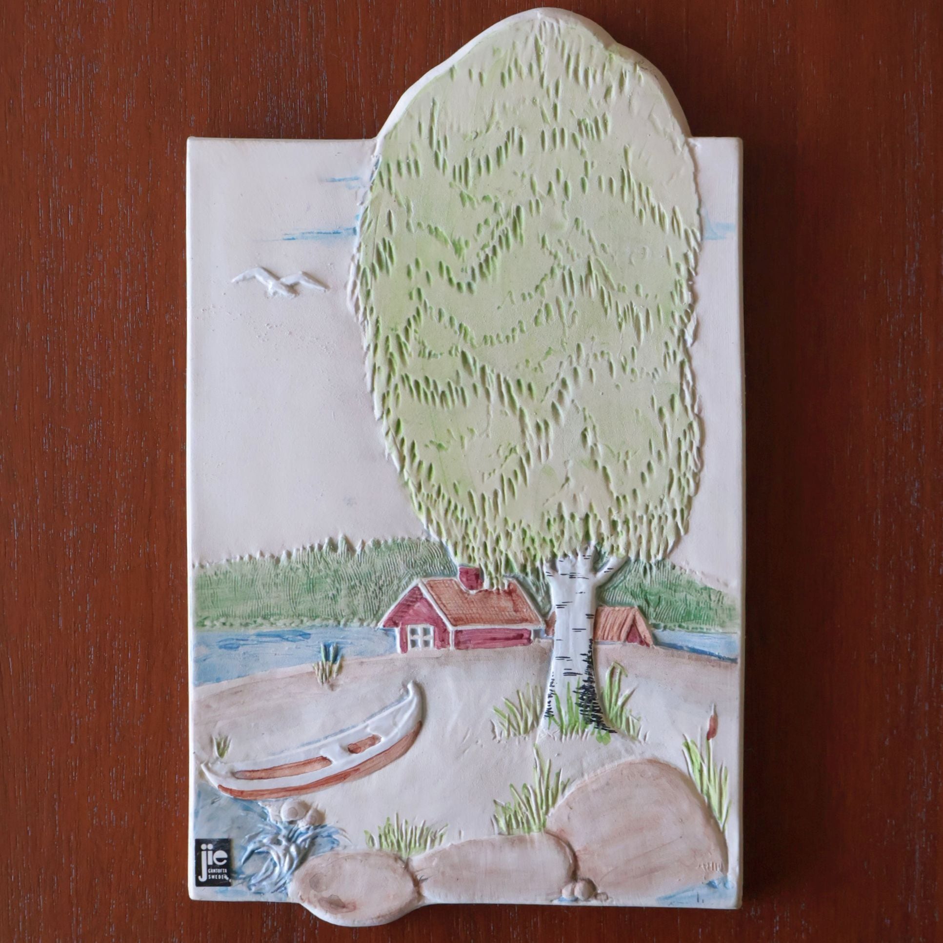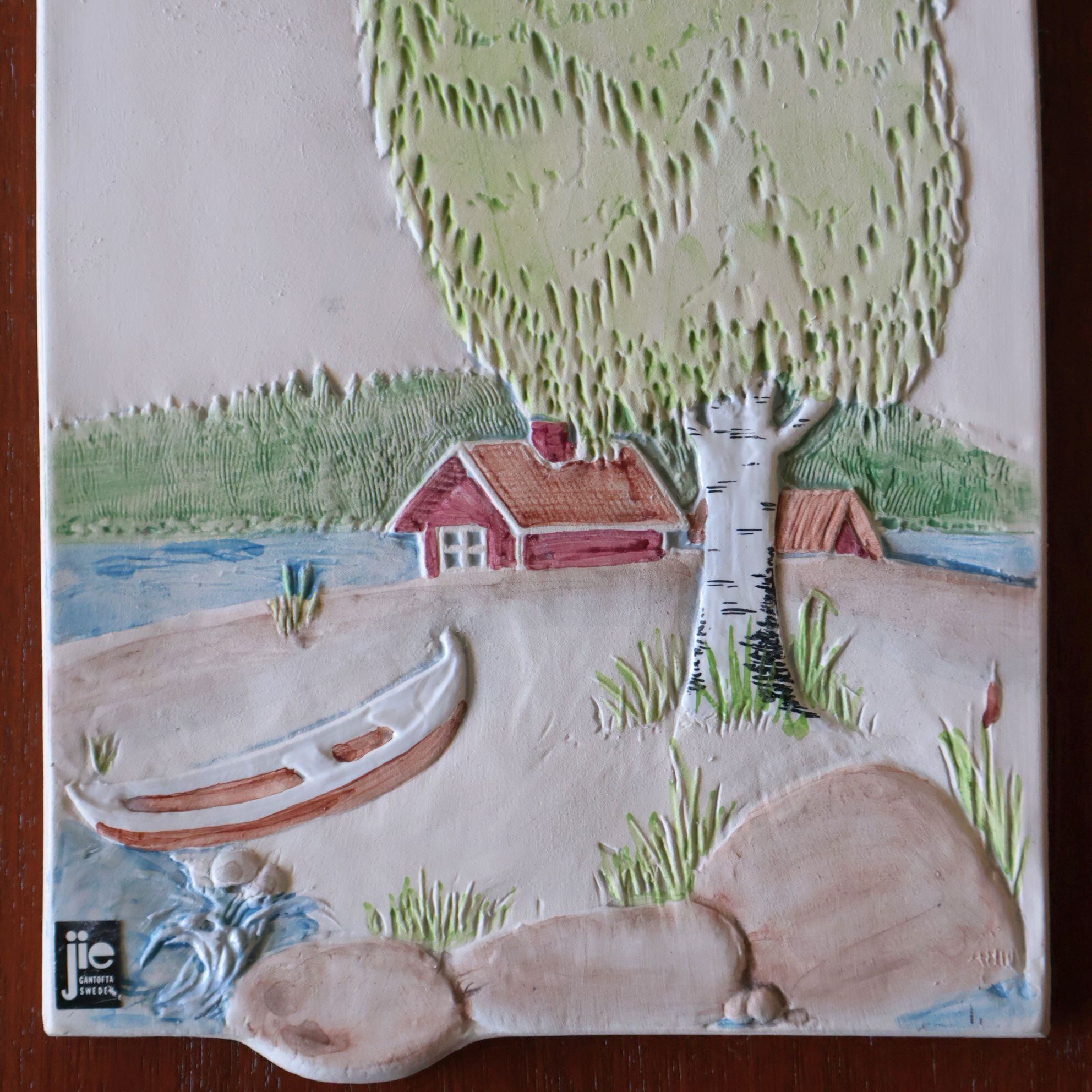スウェーデンのJie Gantoftaで製作された陶板。1960年代からスウェーデンの家庭で人気となった陶板のひとつです。こちらはスウェーデンのサマーハウスでしょうか、湖畔とボートが見える牧歌的な一枚です。同社の代表的デザイナーAimo Nietosvuori による作品です。背面は壁掛けが出来るように金具が付いています。
