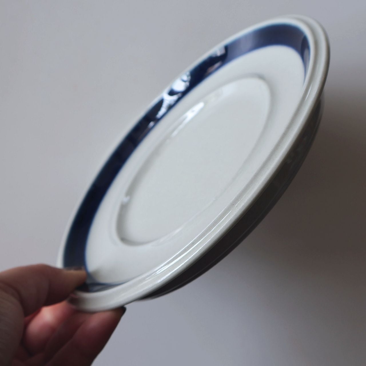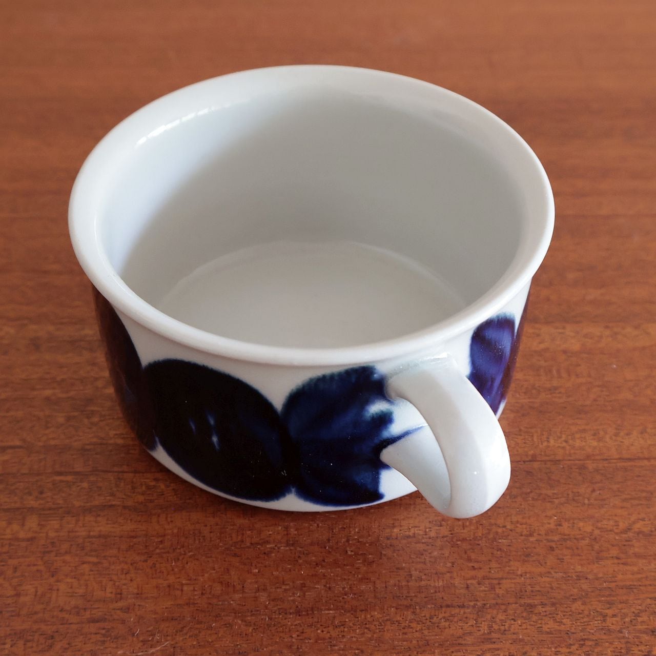 深みのあるブルーで大胆に描かれた花模様と、太い筆致で伸びやかに描かれたラインが特徴で、カップ類には花柄、プレート類にはラインを中心としたデザインが施されています。絵付けは熟練した絵付師による手描きで行われており、色の濃淡や花の位置、筆跡の揺らぎなど、ひとつひとつ異なる表情が魅力となっています。