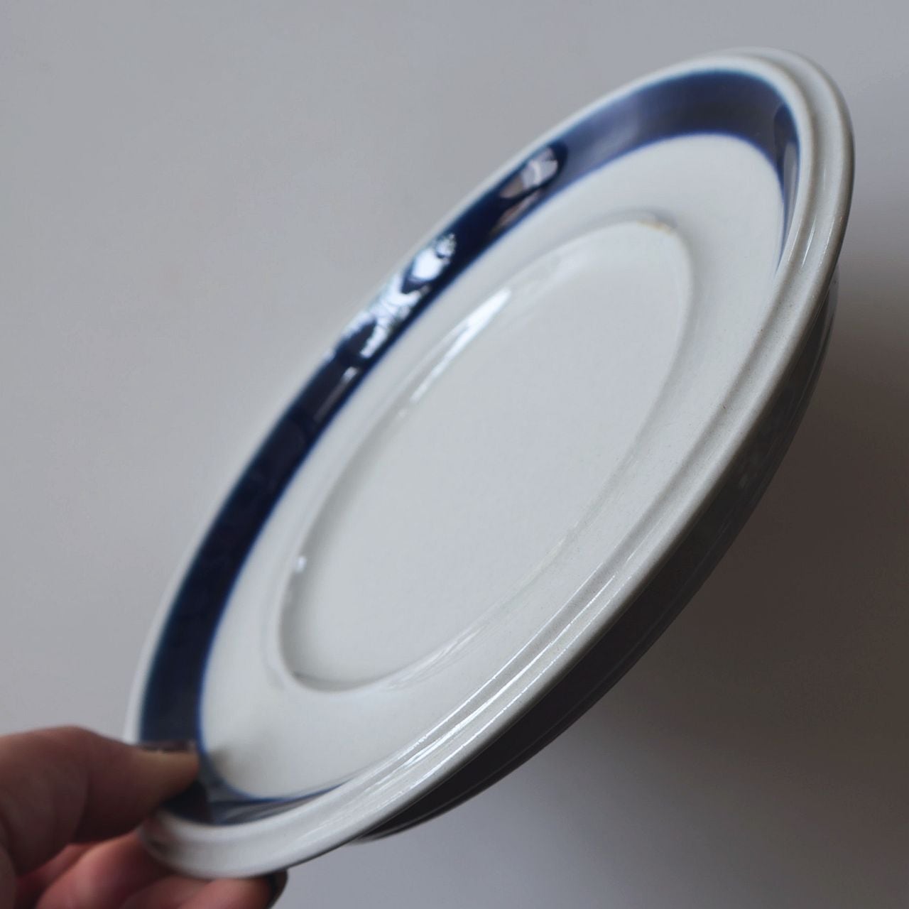 深みのあるブルーで大胆に描かれた花模様と、太い筆致で伸びやかに描かれたラインが特徴で、カップ類には花柄、プレート類にはラインを中心としたデザインが施されています。絵付けは熟練した絵付師による手描きで行われており、色の濃淡や花の位置、筆跡の揺らぎなど、ひとつひとつ異なる表情が魅力となっています。