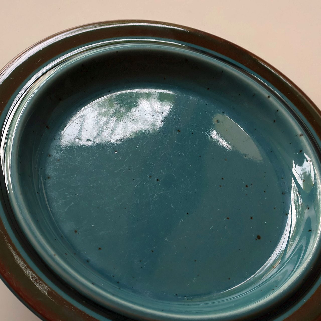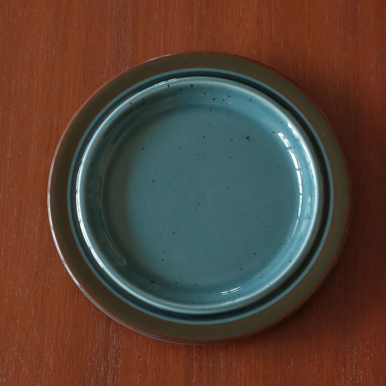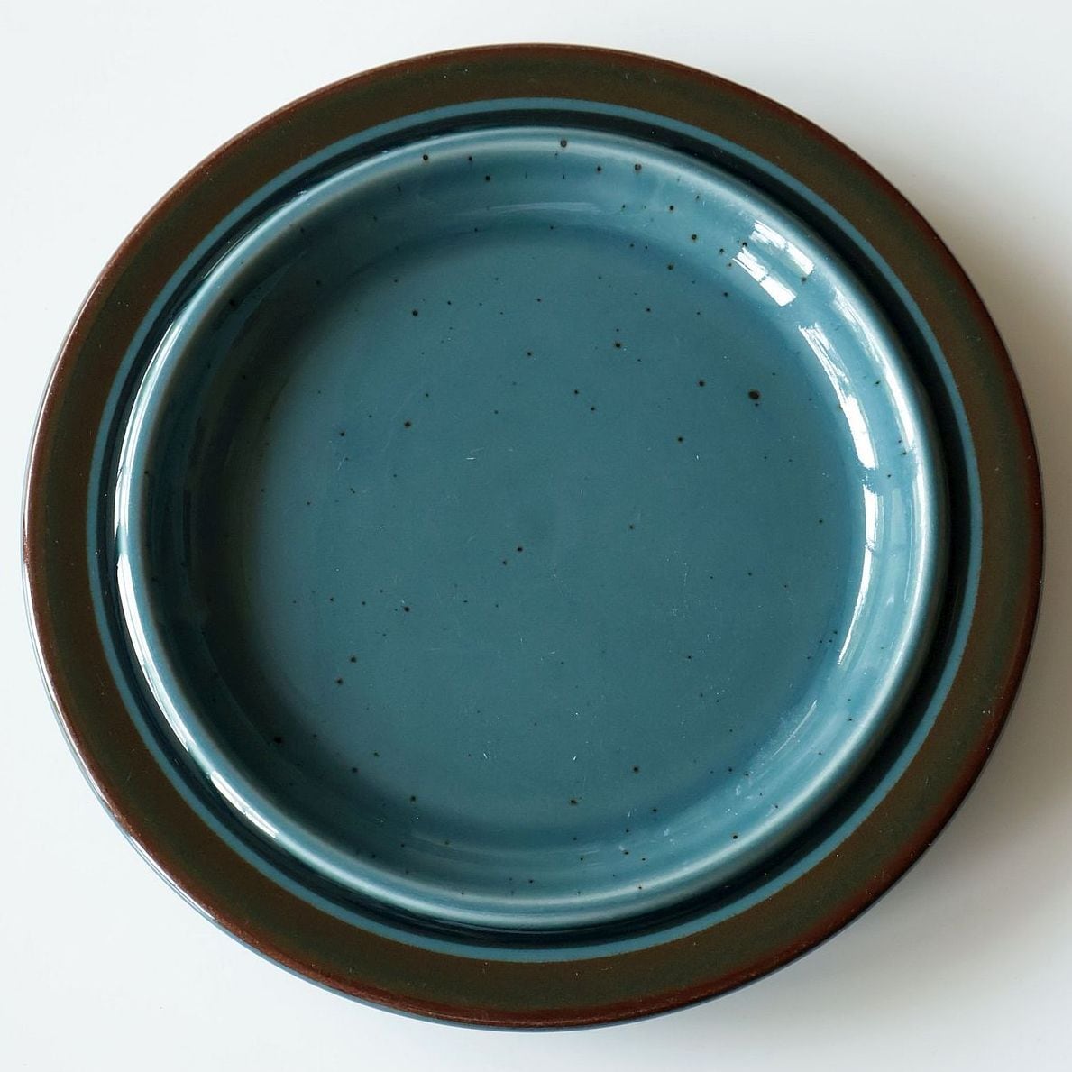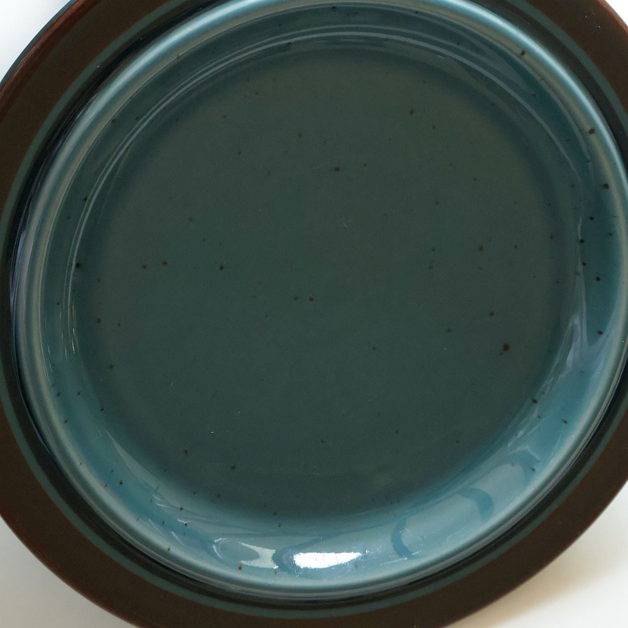 「Meri」はフィンランド語で“海”を意味し、その名の通り北欧の深い海を思わせる落ち着いた色調が特徴となっています。深いブルーから青緑へと揺らぐ釉薬の中には黒いドットが散りばめられ、表面には波のような流動的な表情が見られます。縁に施された茶色のストライプは遠くの海岸線を思わせ、静かで穏やかな印象を与えています。ひとつとして同じ表情がないのも、このシリーズならではの魅力です。