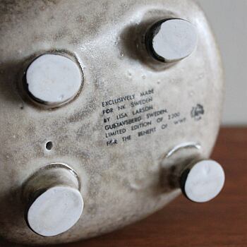 リサ・ラーソンによりデザインされたハリネズミ(Iggelkott)。 絶滅危機の動物保護救済を目的としてスウェーデンのNKデパートとWWFがコラボレーションして販売した動物フィギュアのシリーズの一つです。 ハリネズミは1979年発表され、世界中で2200体のみ製作された希少なモデルとなります。 脚部に2ヶ所、小さな凹みが見られます。(写真4枚目)一箇所は成型時のもの、一箇所は焼成後のものと思われますがどちらも安定性にも影響無く、美観を損ねるものでもありません。