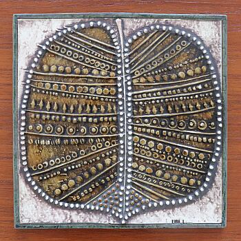 リサ・ラーソンによりデザインされた葉っぱの陶板。1967-86年(アトリエ作品は62-67年)の間グスタフスベリにて色やデザインが異なる数種類製作されました。 立体感のある葉が1枚、陶板に大きく描かれており、釉薬や焼成の具合でその時々で表情が変わる作品です。 イーゼル等に置いてみたりとお部屋を美しく飾ってくれそうです。