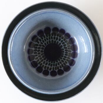 1962-76年の間製作されていたKosmos。ステンシル印刷と釉薬で描かれた表情は輪郭がはっきりとしておらず、曖昧な表情が穏やかで美しい作品です。 フォルムデザインはウラ・プロコペによるSモデル、デコレーションデザインはグンヴァル・オリン・グランクヴィスト(GOG Gunvor Olin-Glonqvist)となります。 茶色と青色の2種類が製作されておりますが、青色は茶色に比べ制作数が限定的なカラーとなります。