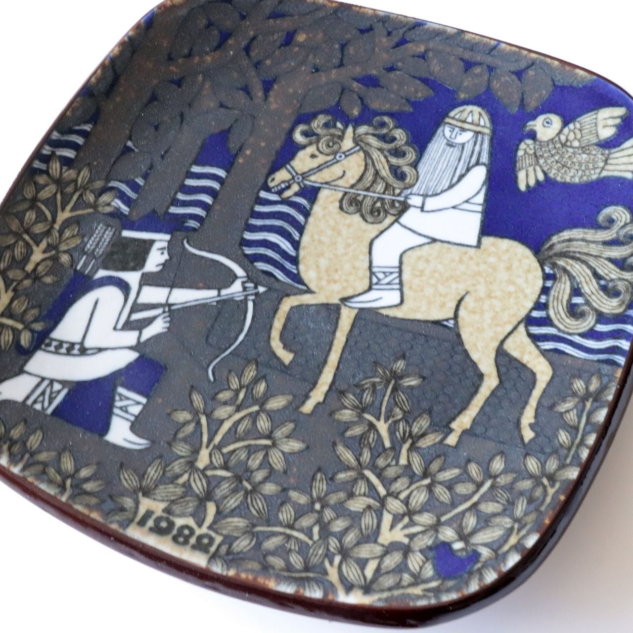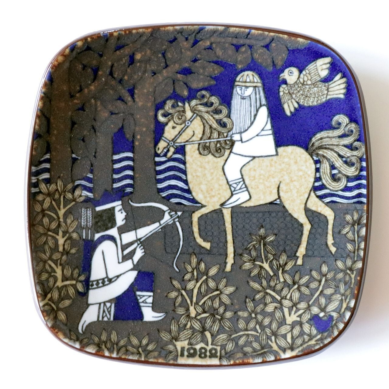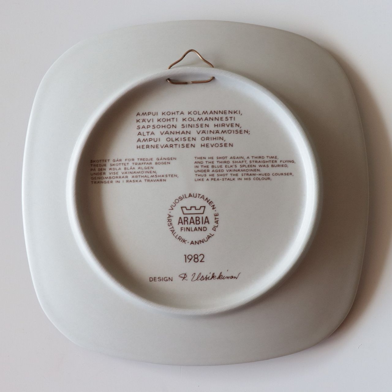 1976年から1999年にかけて、フィンランドの名窯Arabia(アラビア)で製作されたKalevala(カレワラ)シリーズのイヤープレート。第7作目にあたる1982年のプレートは、フィンランドの叙事詩『カレワラ』を題材に、Raija Uosikkinen(ライヤ・ウオシッキネン)が装丁を手がけたものです。