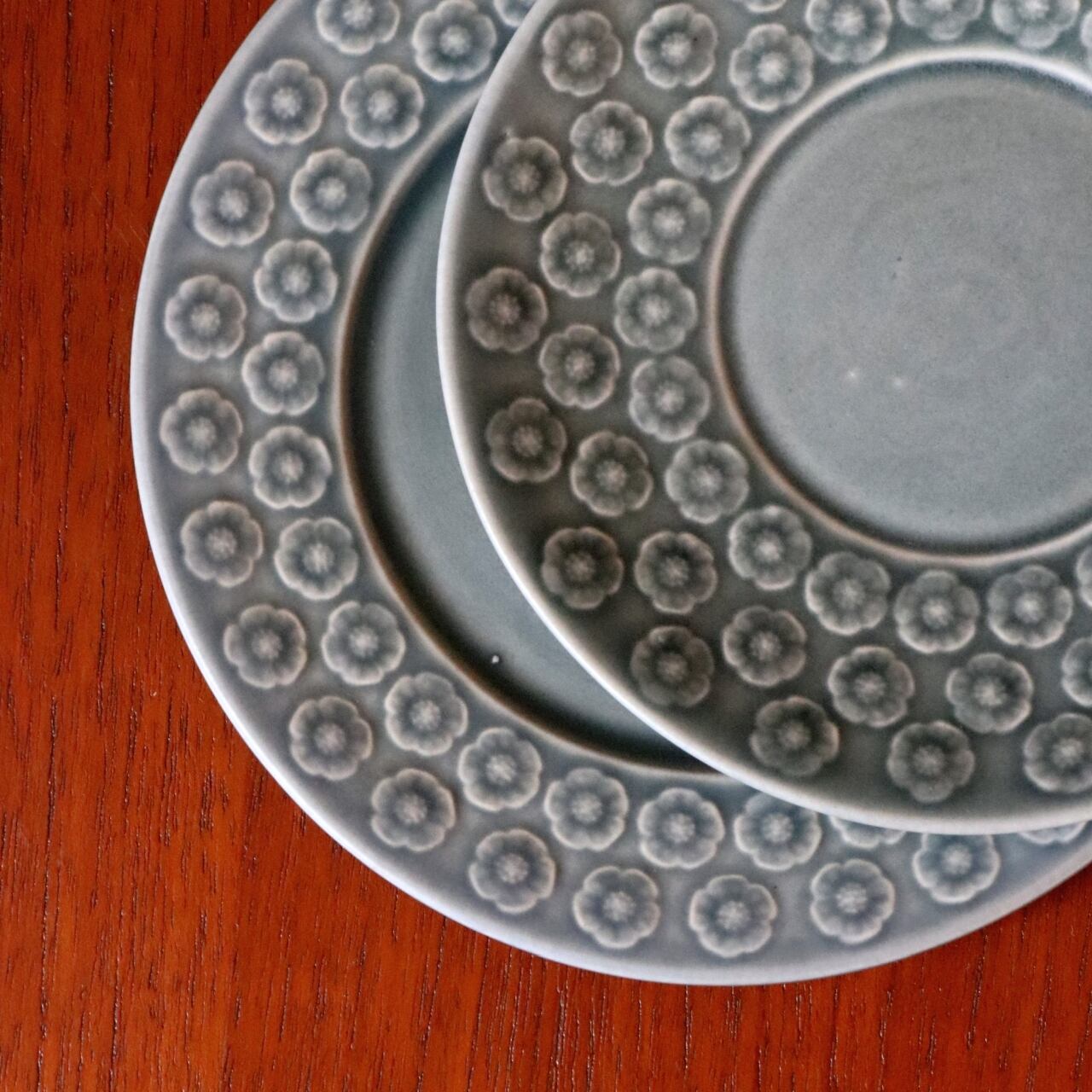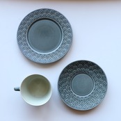 イエンス・クイストゴーデザインによるBlue Azur。 1957年にKronjydenから製作が始まり、その後Nissen・B&Gと製造が続いた人気のシリーズです。 エンボスで表現された杏の花の可愛らしいモチーフでありながら 落ち着いた色合いが甘すぎない柔らかさでとても良い雰囲気です。