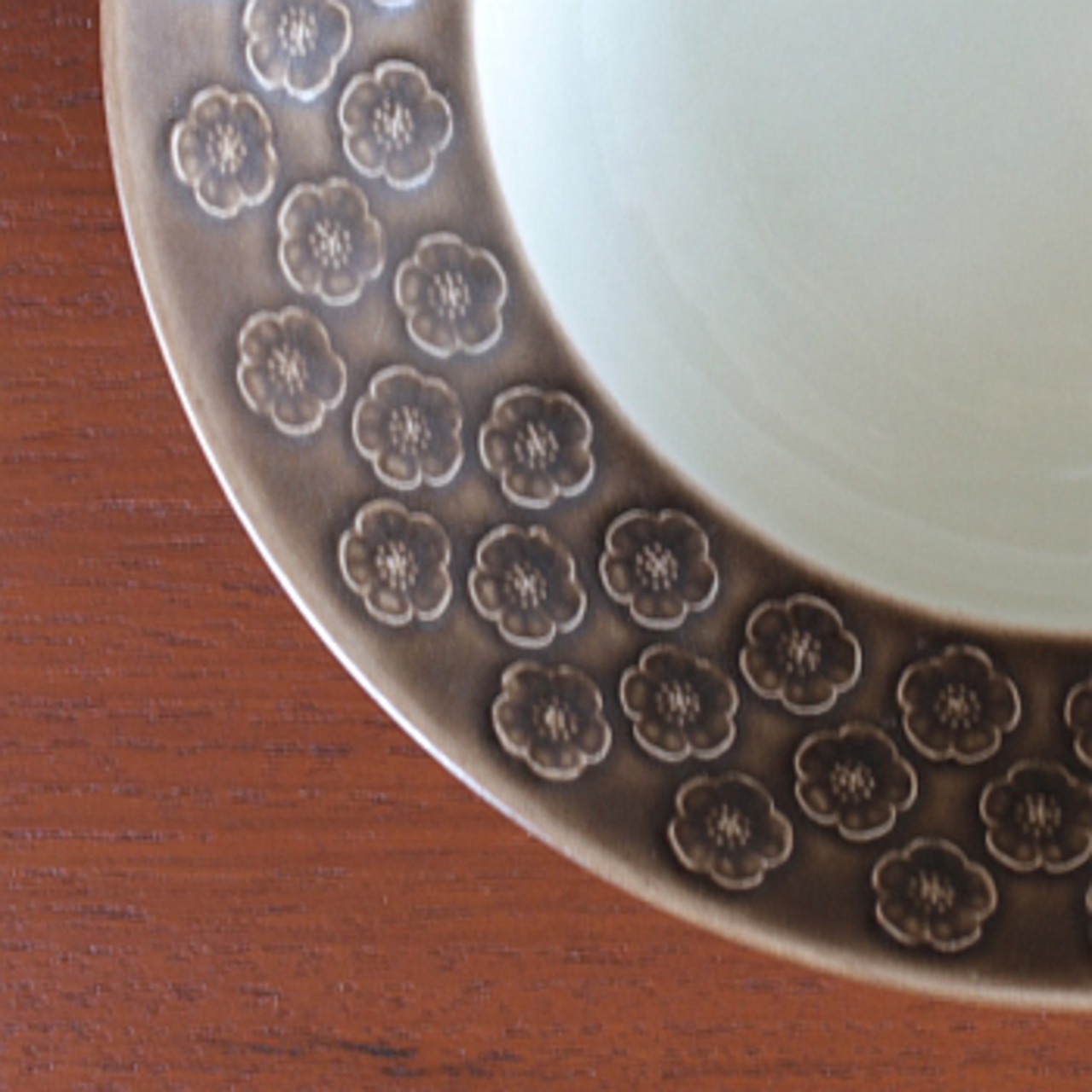 イエンス・クイストゴーデザインによるUmbra(Brown Azur)。 1957年にKronjydenから製作が始まりました。 エンボスで表現された杏の花の可愛らしいモチーフでありながら 落ち着いた色合いが甘すぎない柔らかさでとても良い雰囲気です。