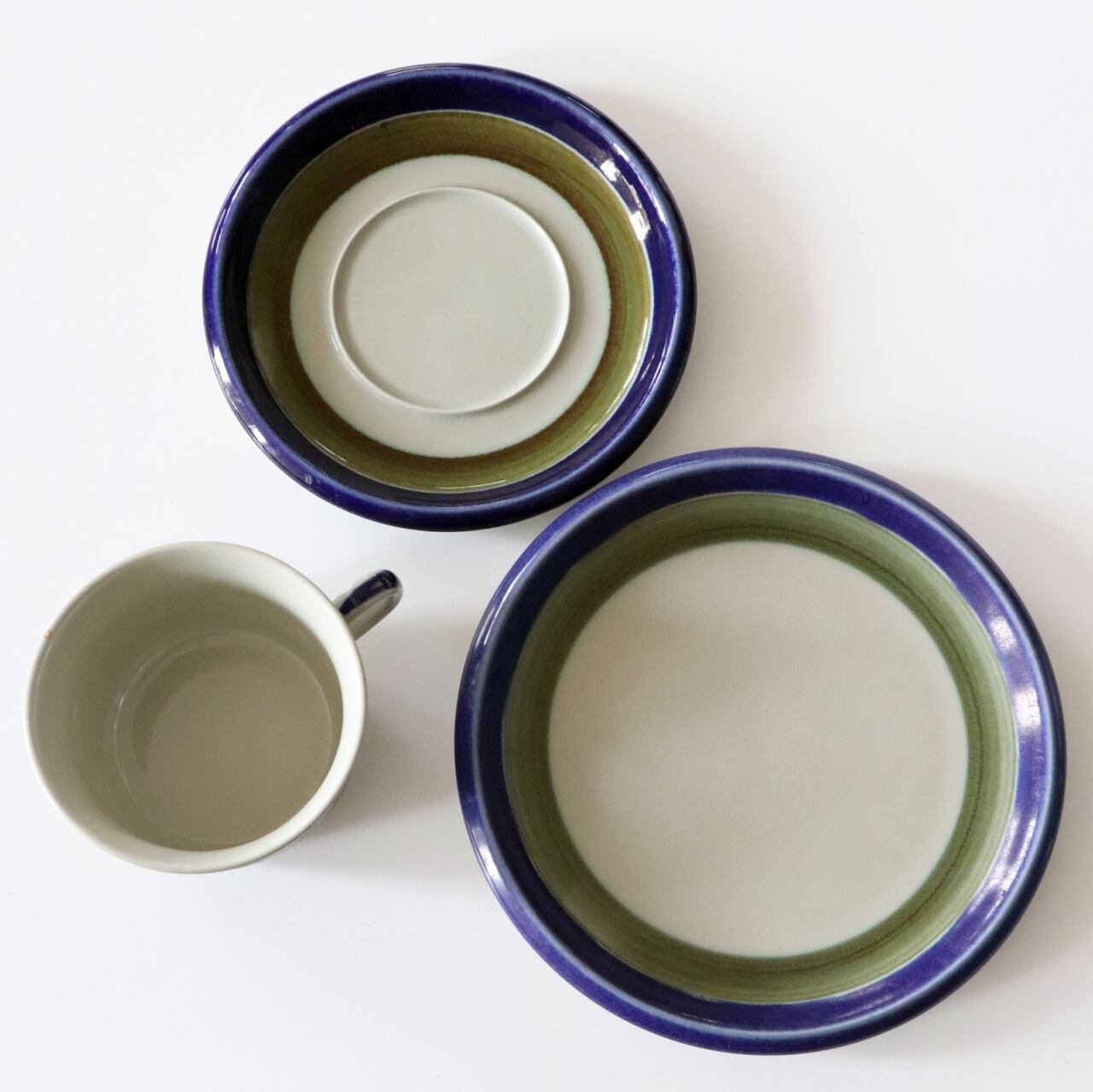 1969-1981年の間、スウェーデンのロールストランドで製作されたエリザベス。マリアンヌ・ウェストマンがデザインを手がけたシリーズです。 濃紺とモスグリーンの2色のシンプルな構成ですが、間に下地のクリーム色が、そして釉薬自体も掠れたラインのためとても表情豊かに見えるグッドデザインです。 少し厚手のため暖かいものを入れてもさめにくく、北欧らしい心遣いが感じられるアイテムです。 プレートの裏に小さなチップがあります。大きく目立つものではありませんが、価格はそれを考慮したものとなります。