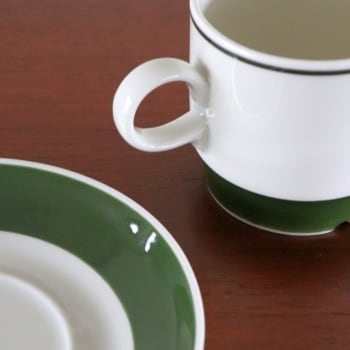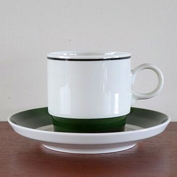 オーレ・アルベリウス(Olle Alberius)がデザインしたTaffel。緑と白のシンプルな構成で製作されたシリーズです。 1967-81年の間、ロールストランドで製作されました。シリーズのカップだけを見ると品の良いデザインが前面に感じますが、クリーマーやプレートには凹凸によるデザインがアクセントになっており そろえても楽しいシリーズ構成になっています。