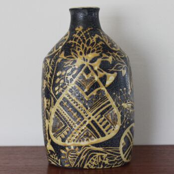 ロイヤル コペンハーゲン、 Nils Thorsson(ニルス・トーソン)デザインによるデザインのフラワーベース。 黒にマスタード、というこのころのAluminia窯で好んで製作されていた色合いでプリミティブな力強い表情が印象的です。