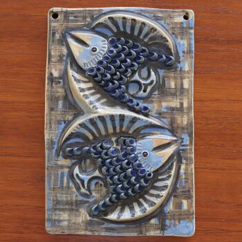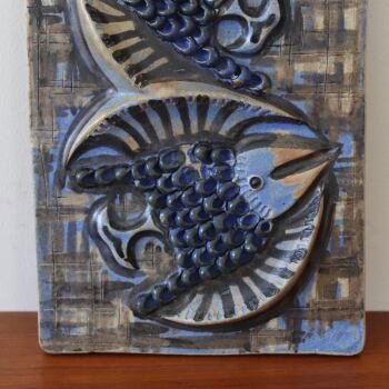 スウェーデンの陶器会社Alingsås Keramik製の陶板。 独特な作風で人気のウラ・ウィンブラッドによる鳥を描かれた作品です。同シリーズでは鳥が1匹のものや3匹のものなど、サイズやフォルム違いでいくつかのパターンが製作されています。