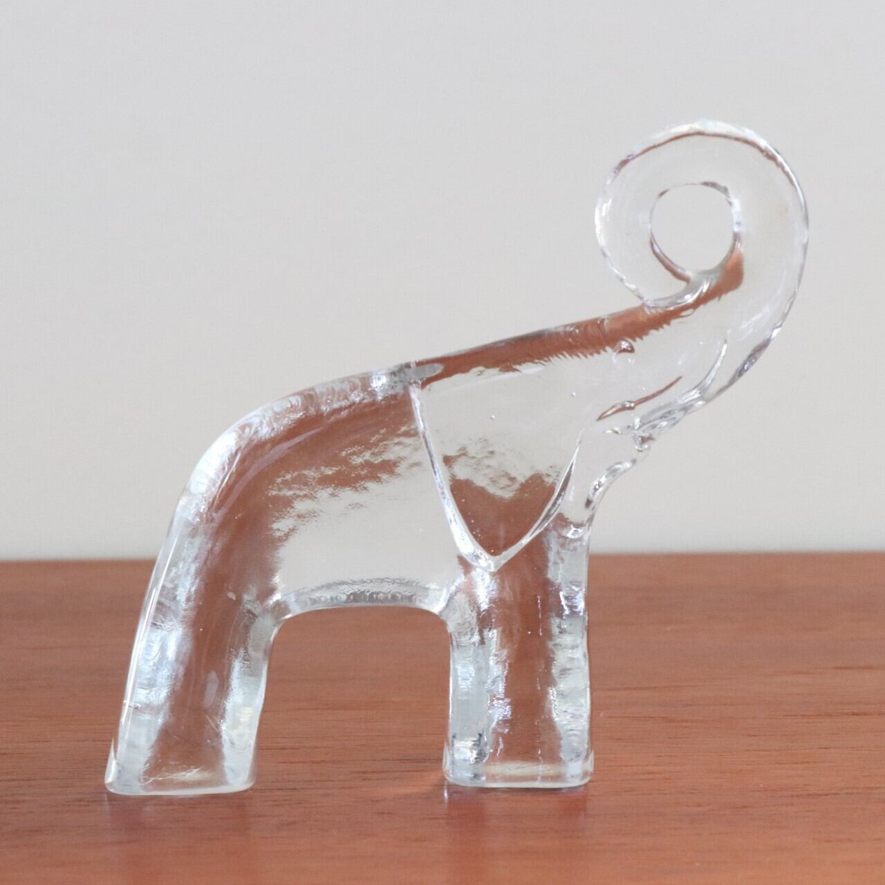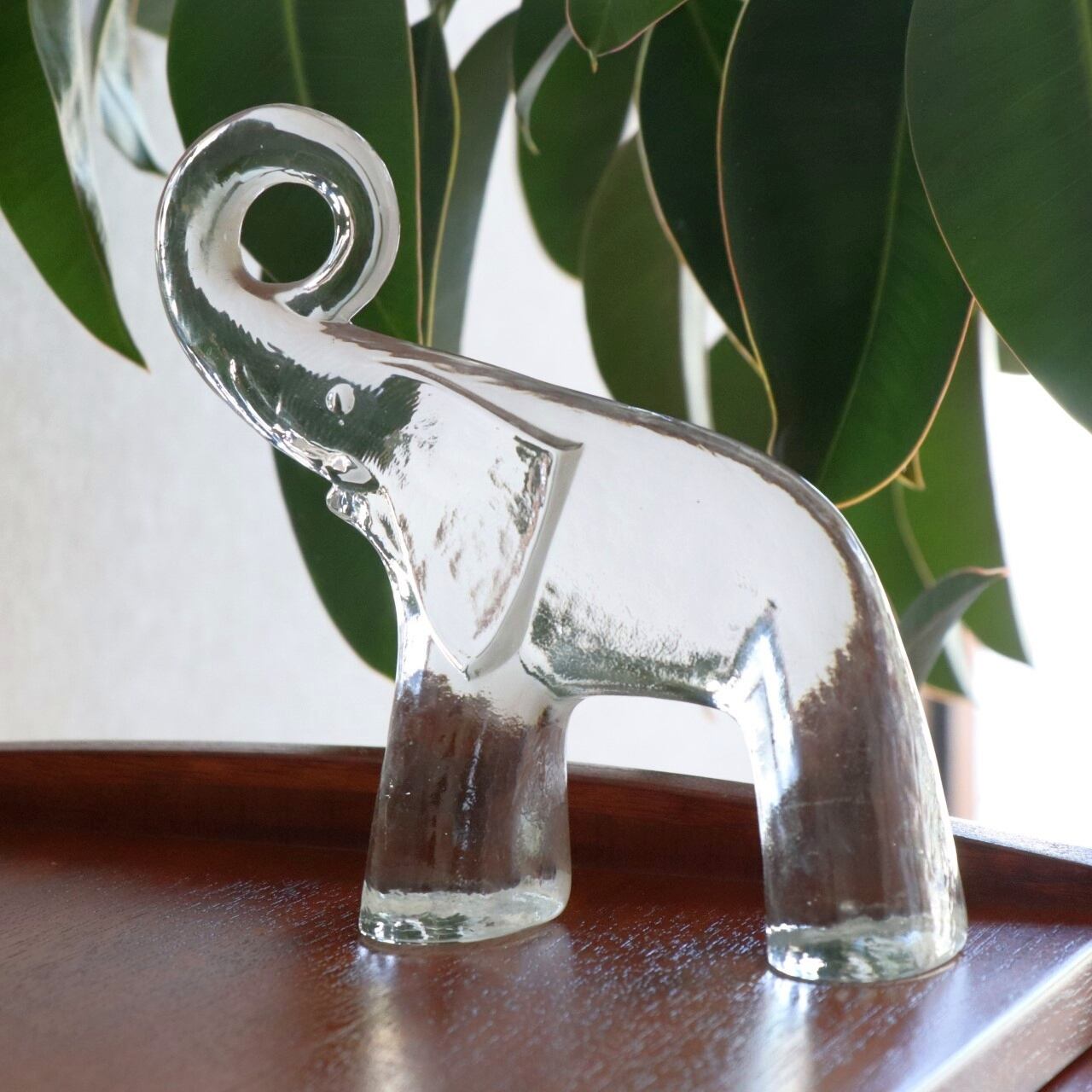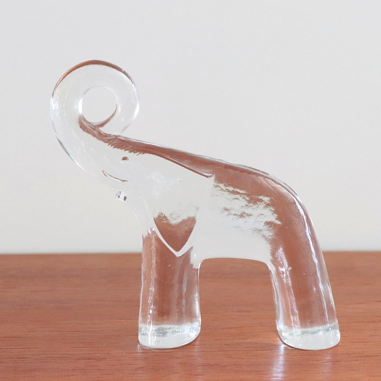 1970年代にスウェーデン、Royal Kronaで製作された象のオブジェ。デザイナーはガラス工芸の巨匠ヴァーティル・バリーンとなります。 デフォルメされ長い鼻を高らかに持ち上げるシーンが躍動感もあり、窓辺を美しく飾ってくれそうな作品です。